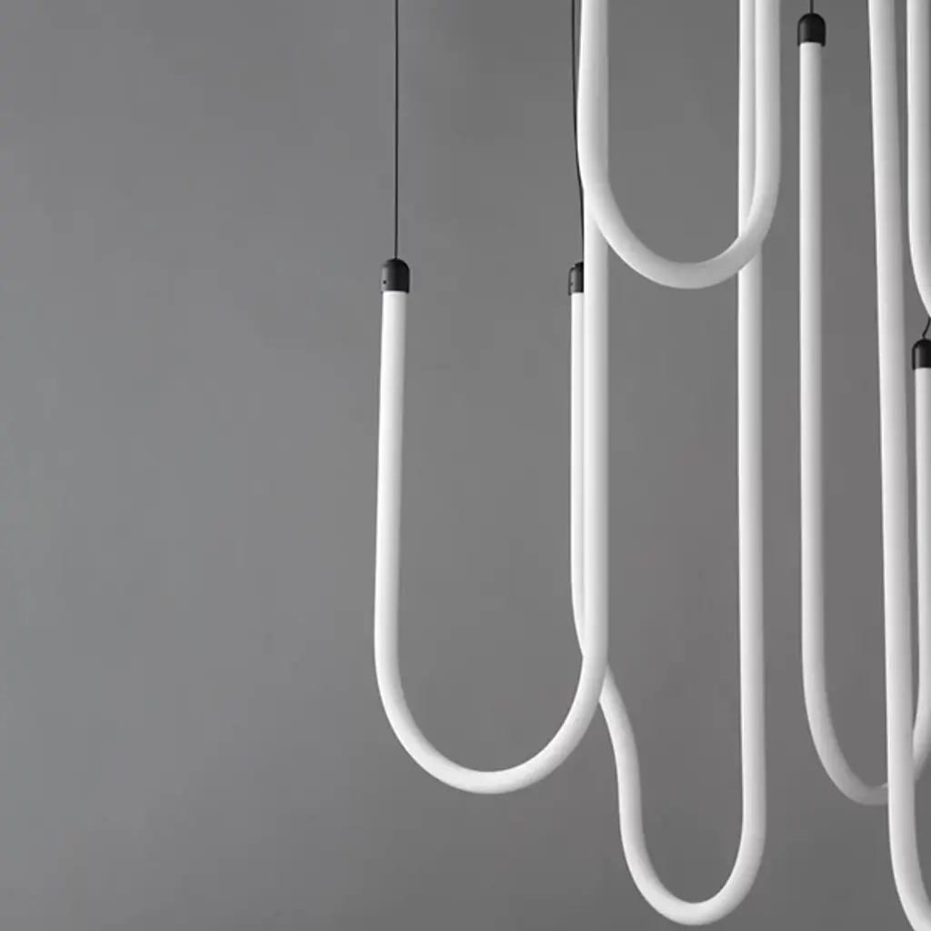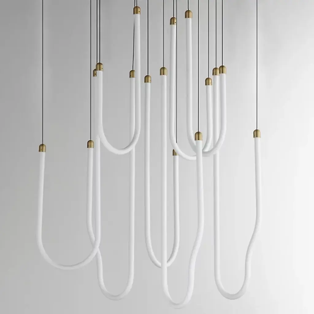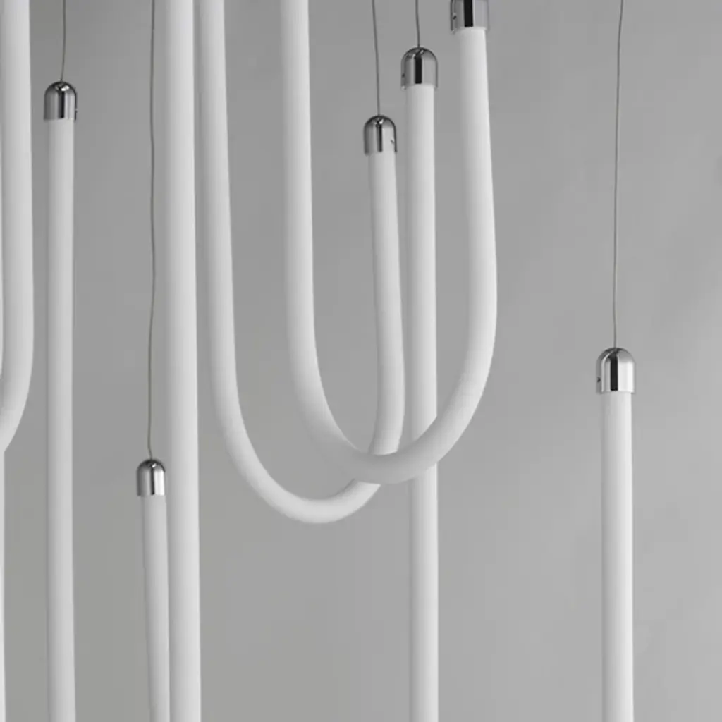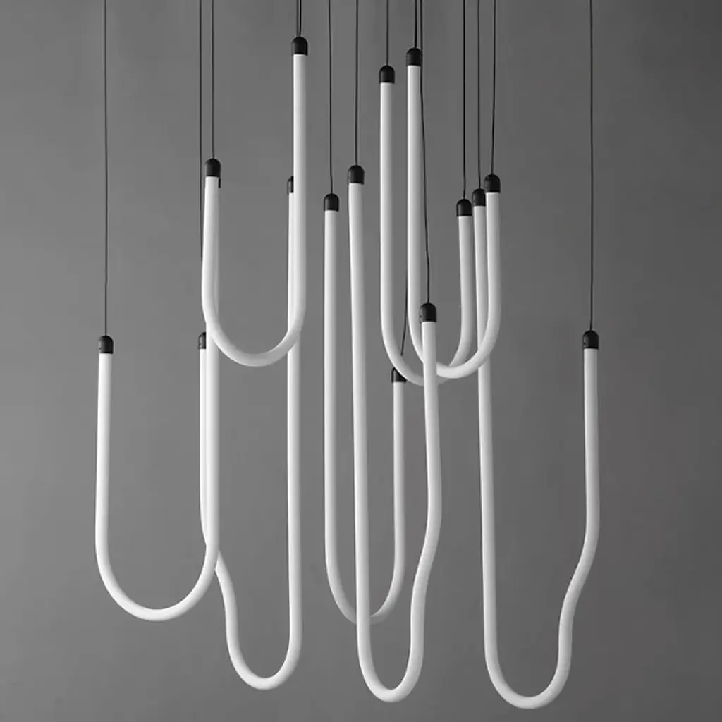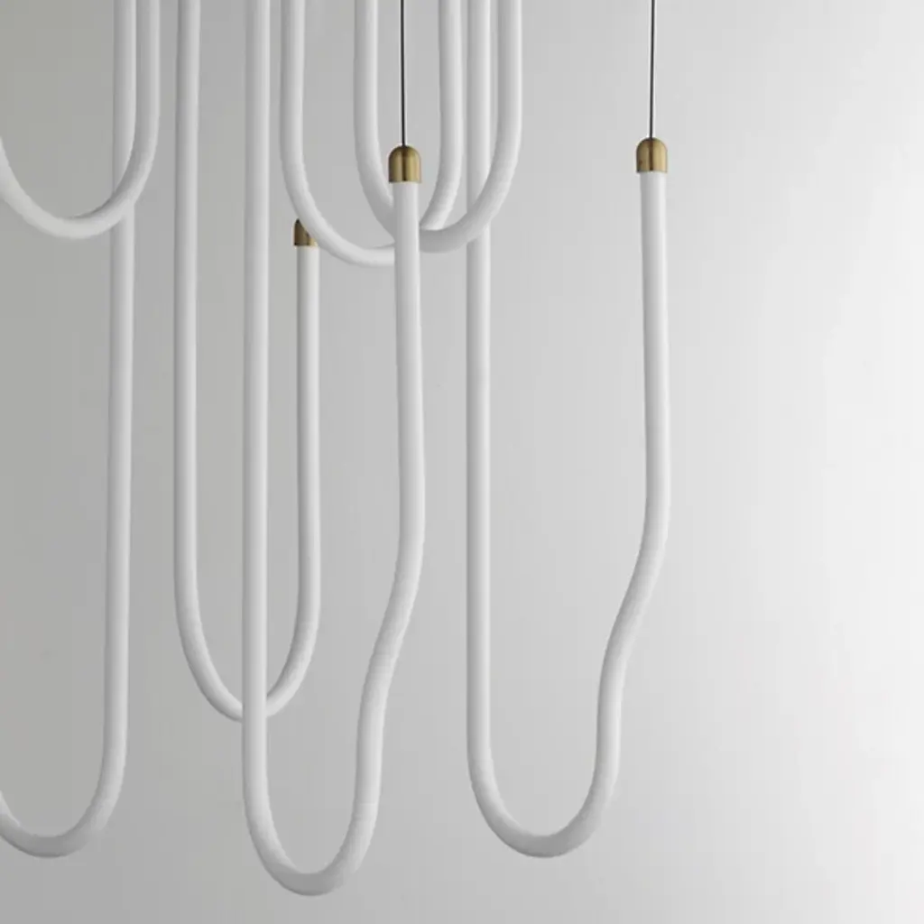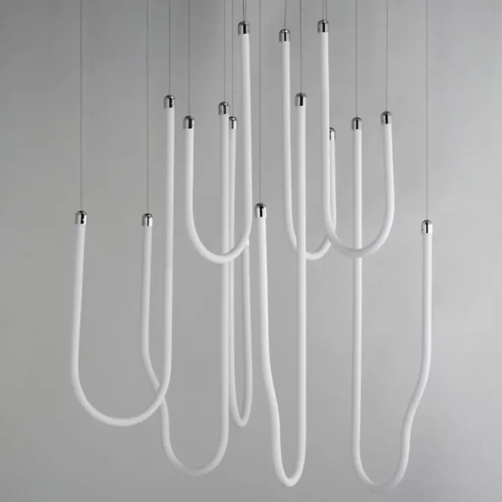 The Soleil LED Chandelier from ET2 Lighting captures the fluid movement of solar flares with its curved acrylic tubes. Light shines from within each tube, creating a gentle glow throughout your space. The flowing forms bring a sense of motion that contrasts nicely with more static elements in a room. This chandelier adds interest to dining areas and living rooms without being too dramatic or imposing. Despite its artistic presence, the design maintains a clean look that fits well in various interior styles.