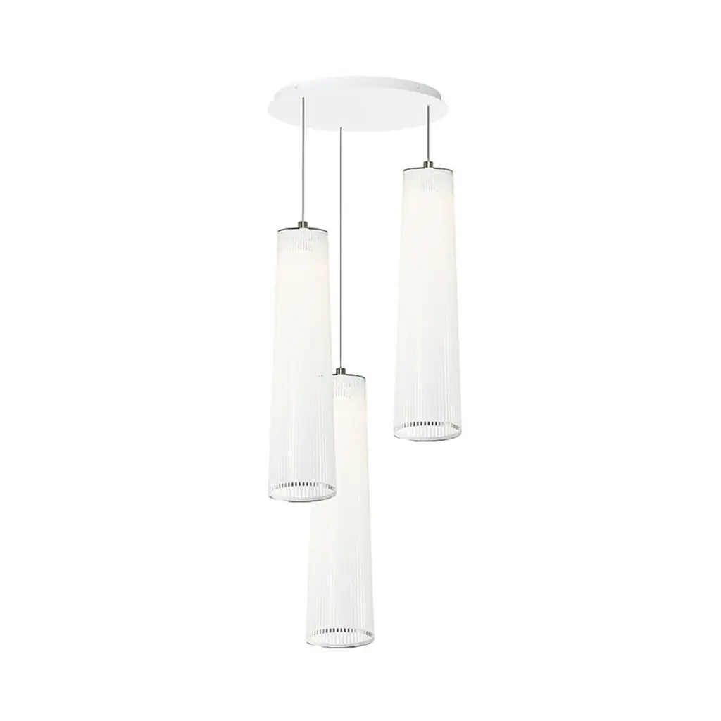 The Solis Chandelier showcases an innovative arrangement of suspended luminaires, creating a distinctive ambiance. Available in configurations of three or five lamps, it casts shimmering rays and radiating patterns. Designed by Carmine Deganello, an experimental product and architectural designer based in Milan, the chandelier reflects his focus on materiality and research-driven practice.