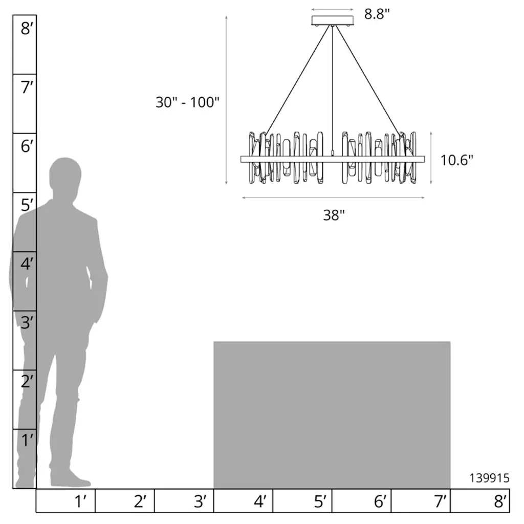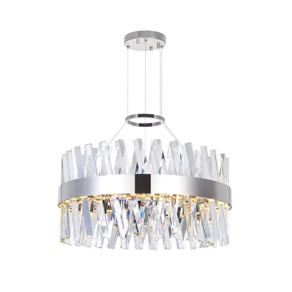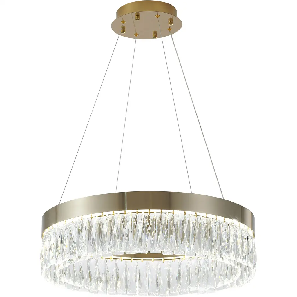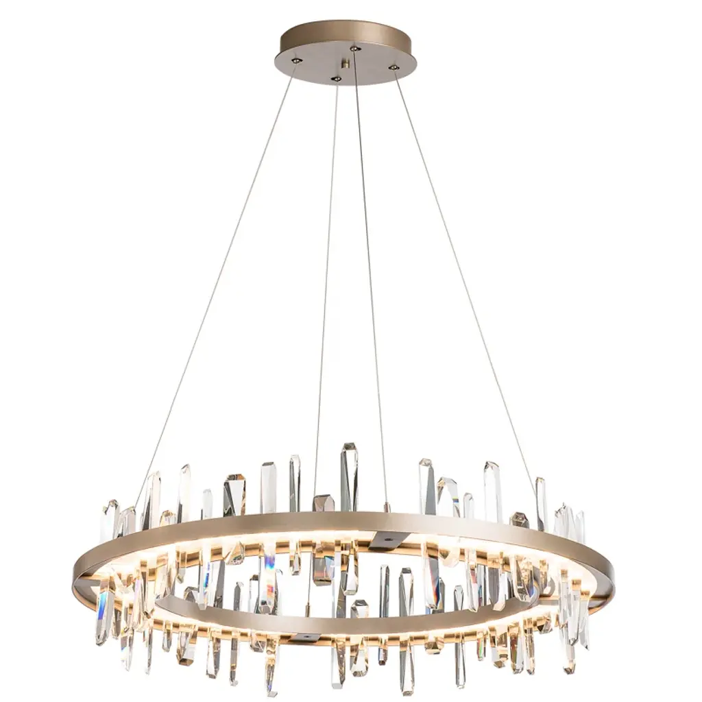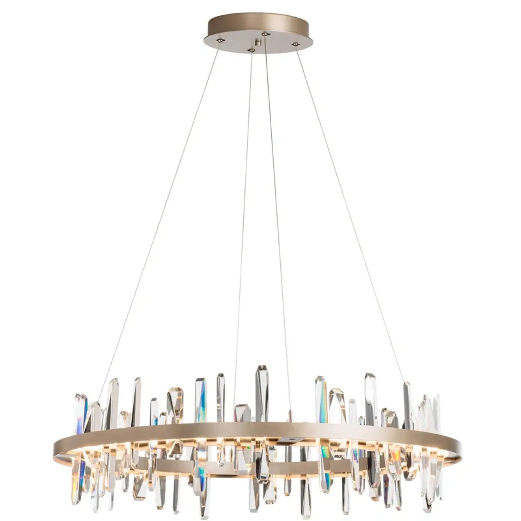 A floating ring of angular crystal towers provides the visual impact for this distinctive large scale pendant. Each crystal rises from an LED light guide and pierces through to emerge below, reflecting and refracting light in a vibrant sparkle.