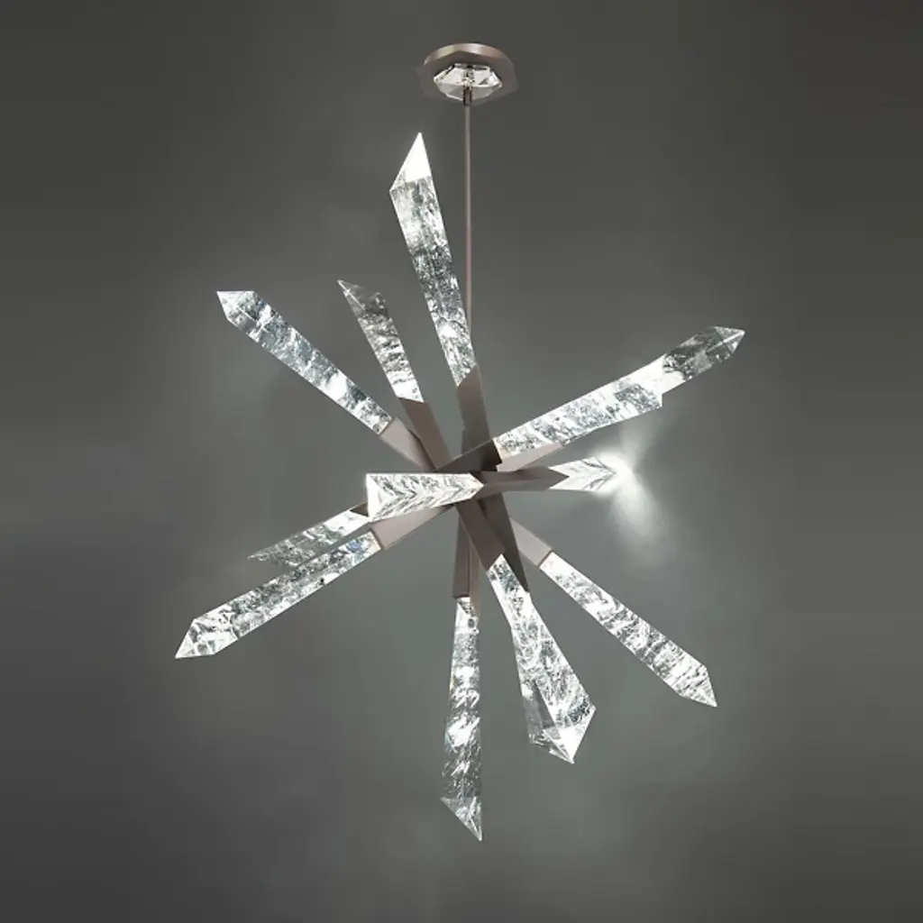 Striking on its own like a bright star in the night sky. The Solitude LED Chandelier from Schonbek Beyond is a dynamic design, sending the eyes traveling every which way with its dazzling glass rays. This contemporary design is an artful take on the classic modern sputnik. It separates itself from the familiar exploding silhouette with an asymmetric composition. Sleek metal arms cross over each other at the center like an abstracted asterisk. Clear textured glass diffusers follow the lead of the arms, displaying sharp cuts. These cuts and the detailed interior of the diffuser transform into brilliant highlights once the light shines through. When lit, the multi-directional forms lends to a bright, encompassing aura.