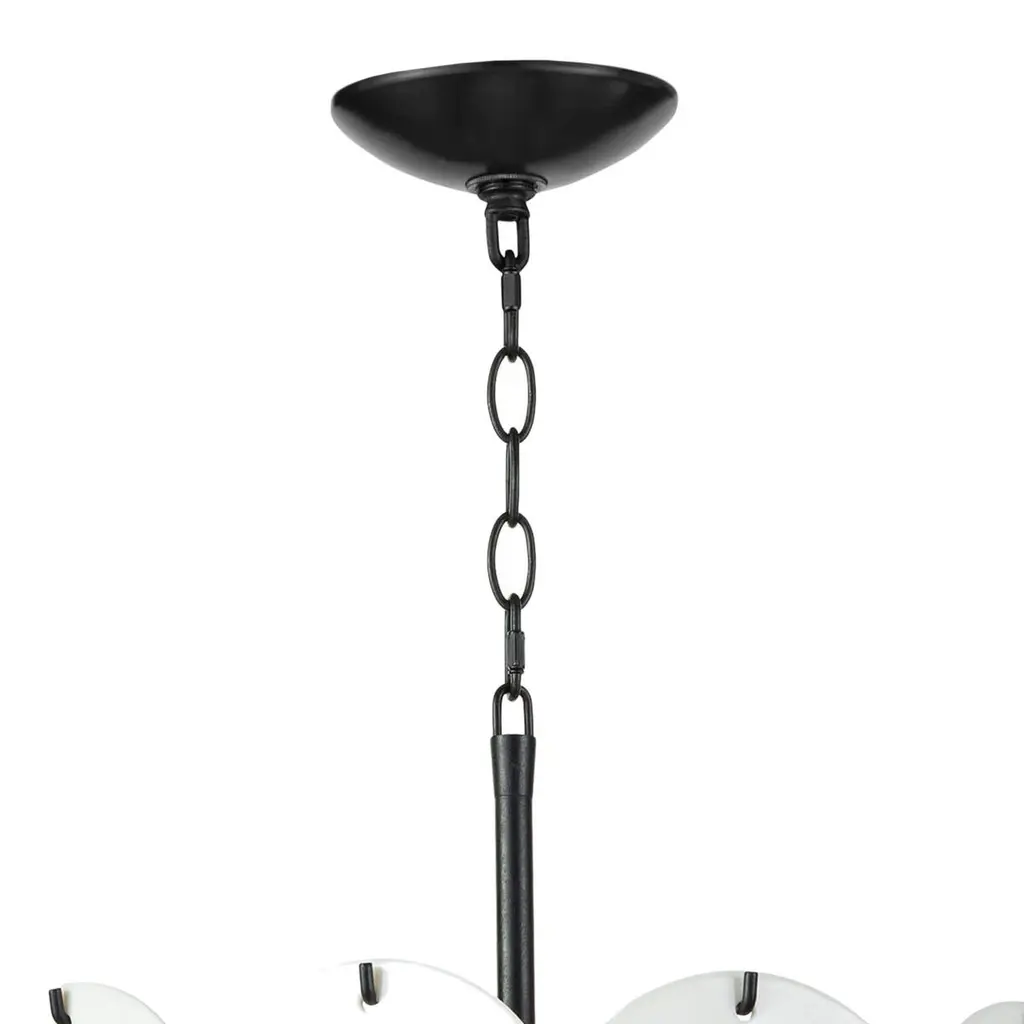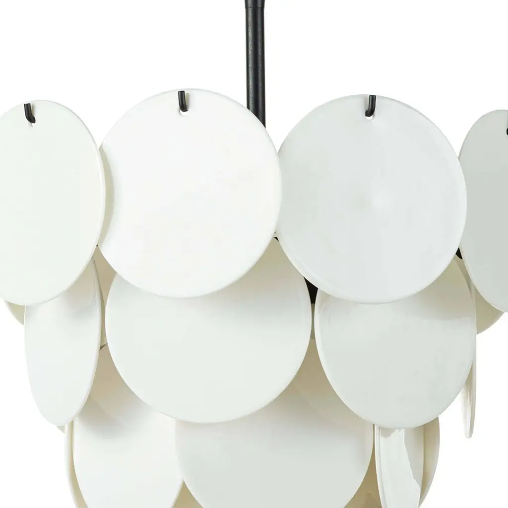 White glass discs hang from a simple, blackened iron frame giving the Solstice Chandelier its distinct, modern appeal. This crisp, sculptural pendant is a beautiful piece both illuminated or not.