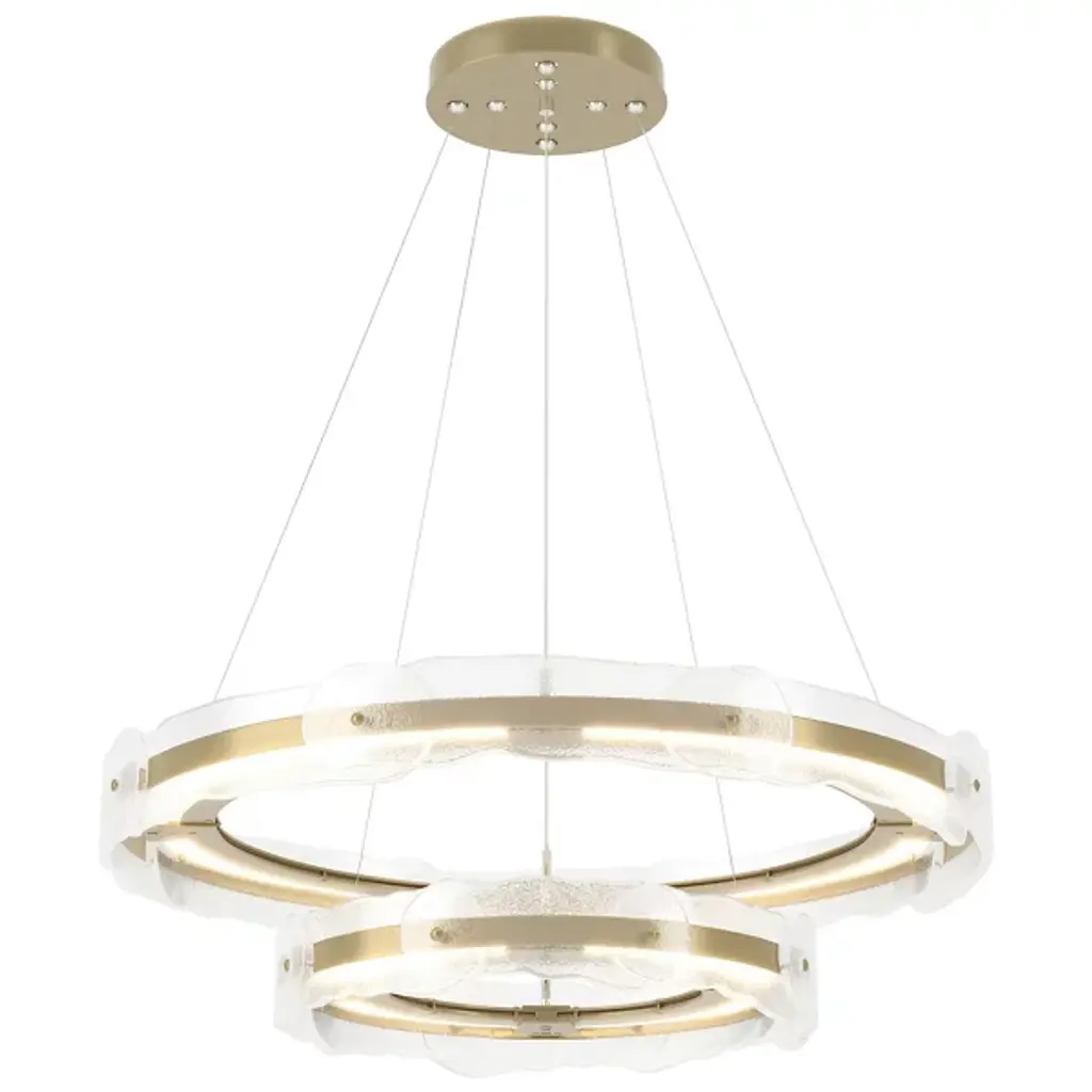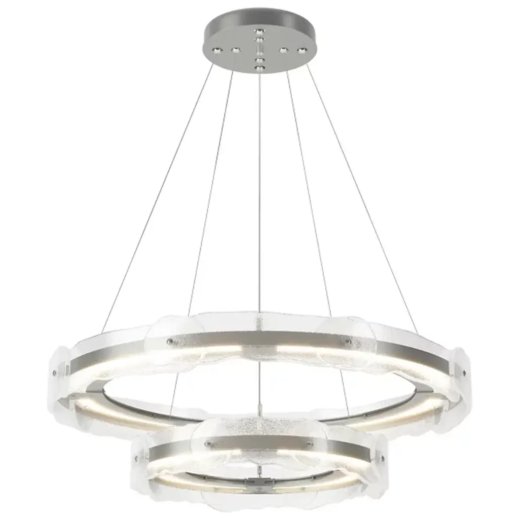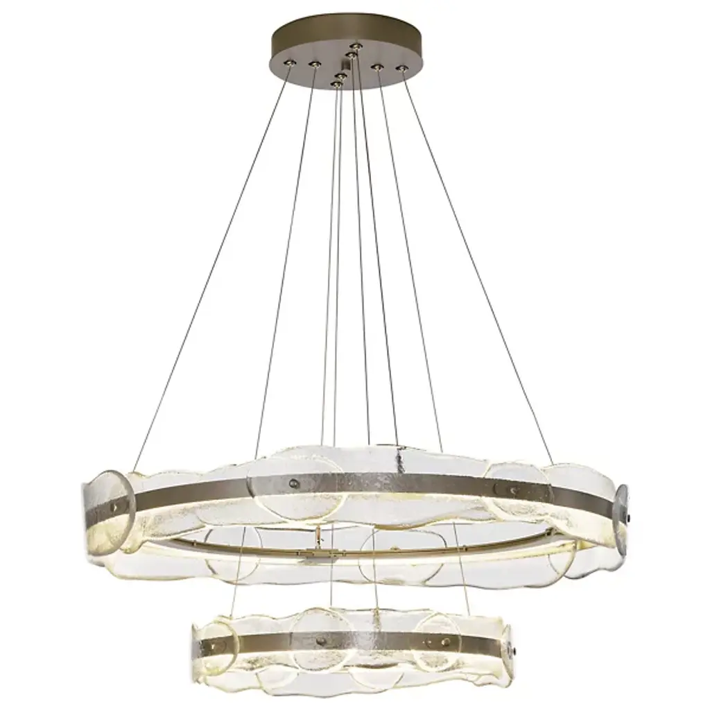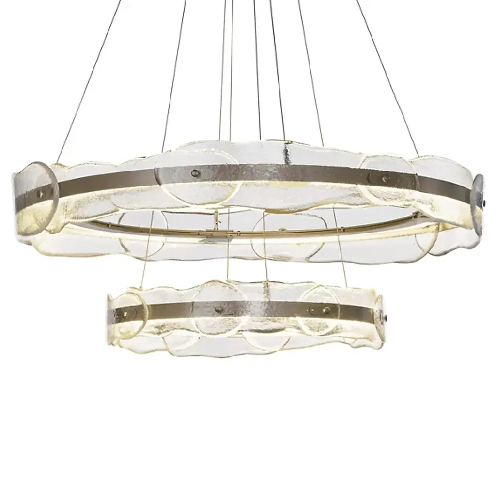 The Solstice LED Chandelier by Hubbardton Forge is a modern and innovative take on a traditional lighting fixture with an artisan twist. Two individually adjustable steel rings are brought to life with translucent hand poured glass in a fluid and melted shape. Each piece of glass is unique and is handcrafted by artisans at AO Glass, a sophisticated studio in Vermont, USA. Adjust the two rings as you see fit to create your own custom lighting fixture. The LED lighting modules remain hidden within the hand forged steel frame, lighting the space with an innovative take on a classic. Handmade by craftsman in a studio in Vermont, USA. Adjustable cables and canopy kit included.