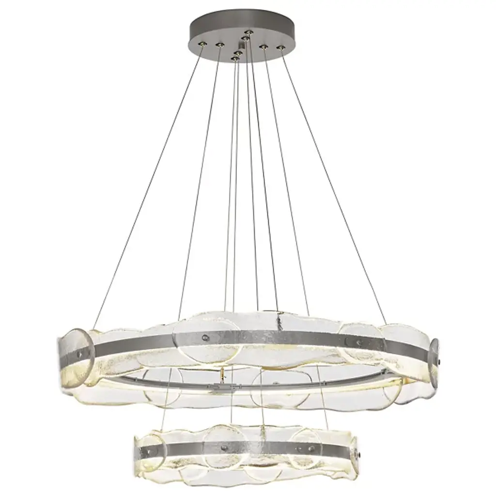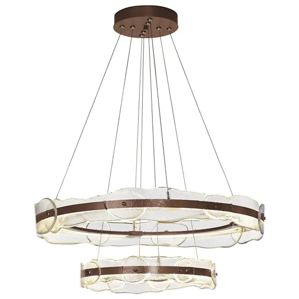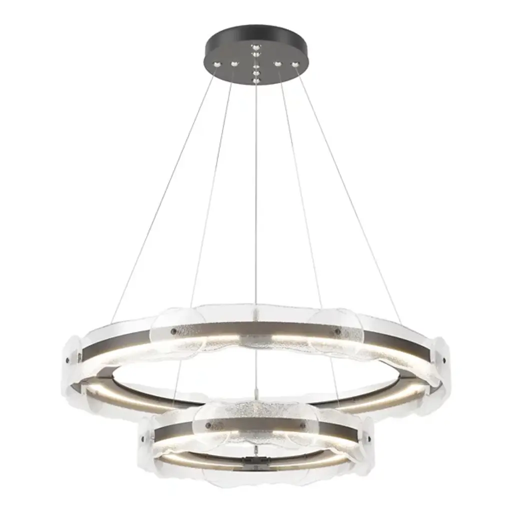 The Solstice LED Chandelier by Hubbardton Forge is a modern and innovative take on a traditional lighting fixture with an artisan twist. Two individually adjustable steel rings are brought to life with translucent hand poured glass in a fluid and melted shape. Each piece of glass is unique and is handcrafted by artisans at AO Glass, a sophisticated studio in Vermont, USA. Adjust the two rings as you see fit to create your own custom lighting fixture. The LED lighting modules remain hidden within the hand forged steel frame, lighting the space with an innovative take on a classic. Handmade by craftsman in a studio in Vermont, USA. Adjustable cables and canopy kit included.