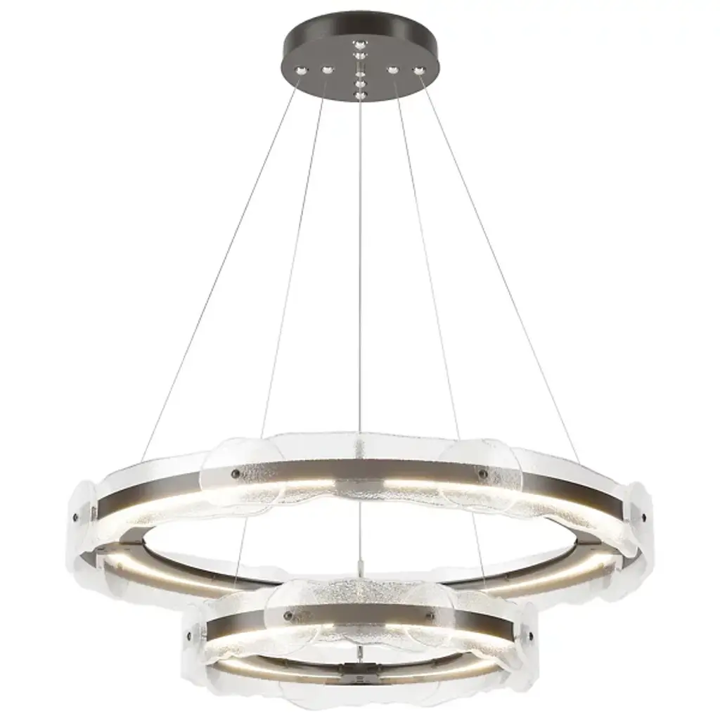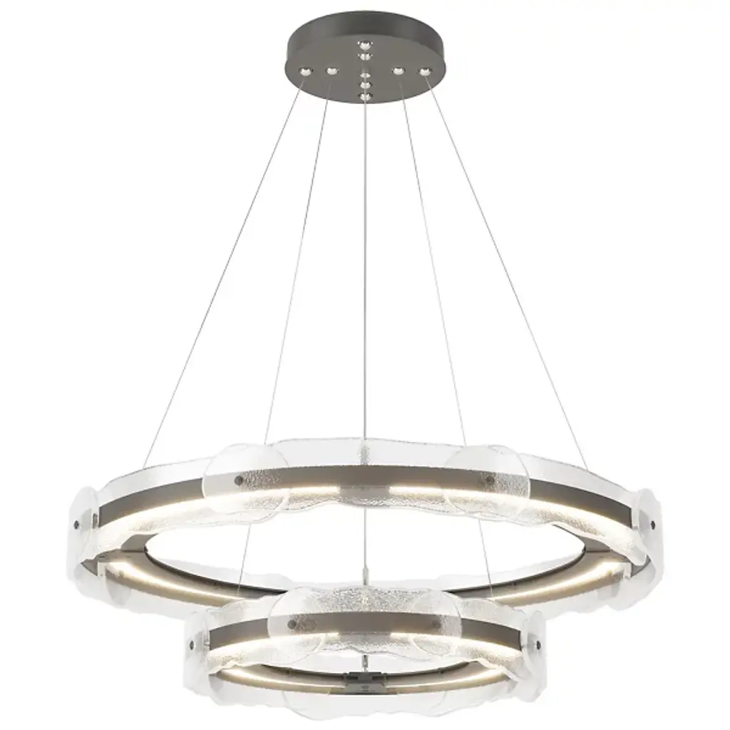 The Solstice LED Chandelier by Hubbardton Forge is a modern and innovative take on a traditional lighting fixture with an artisan twist. Two individually adjustable steel rings are brought to life with translucent hand poured glass in a fluid and melted shape. Each piece of glass is unique and is handcrafted by artisans at AO Glass, a sophisticated studio in Vermont, USA. Adjust the two rings as you see fit to create your own custom lighting fixture. The LED lighting modules remain hidden within the hand forged steel frame, lighting the space with an innovative take on a classic. Handmade by craftsman in a studio in Vermont, USA. Adjustable cables and canopy kit included.