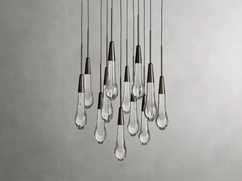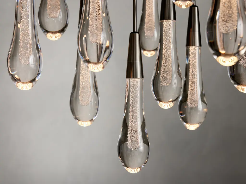 Featuring adjustable black PVC cords cascading into integrated LED lights handcrafted from seeded glass, our Soltaire Lighting Collection mimics the look of a fallen raindrop.