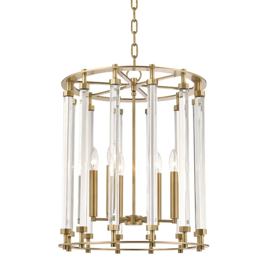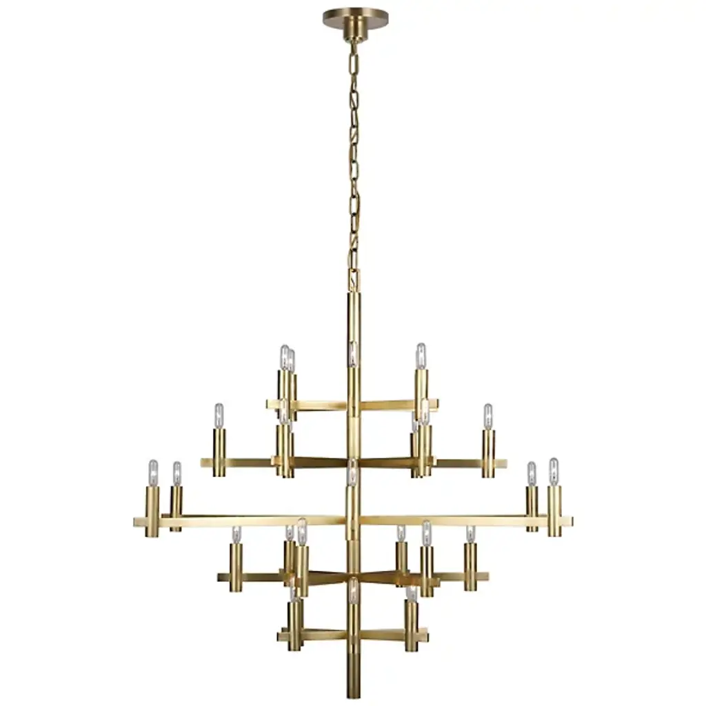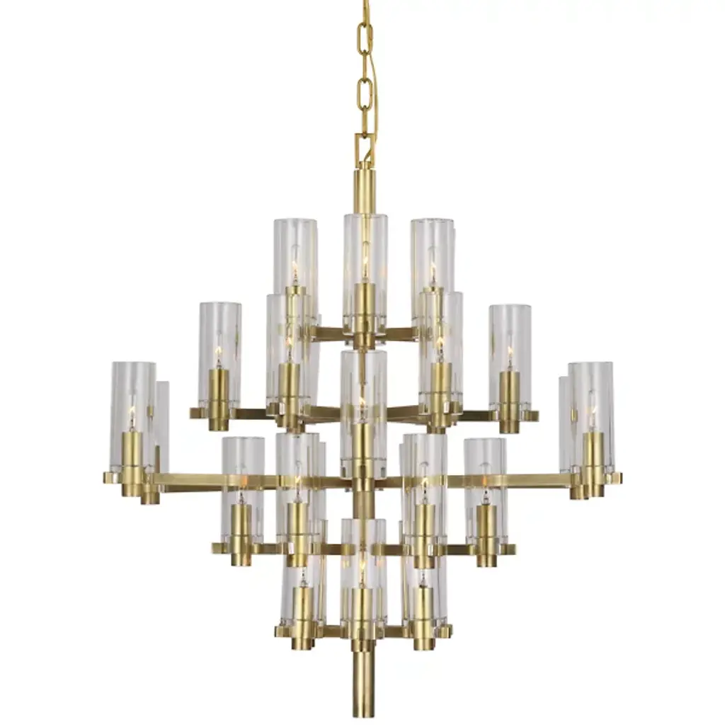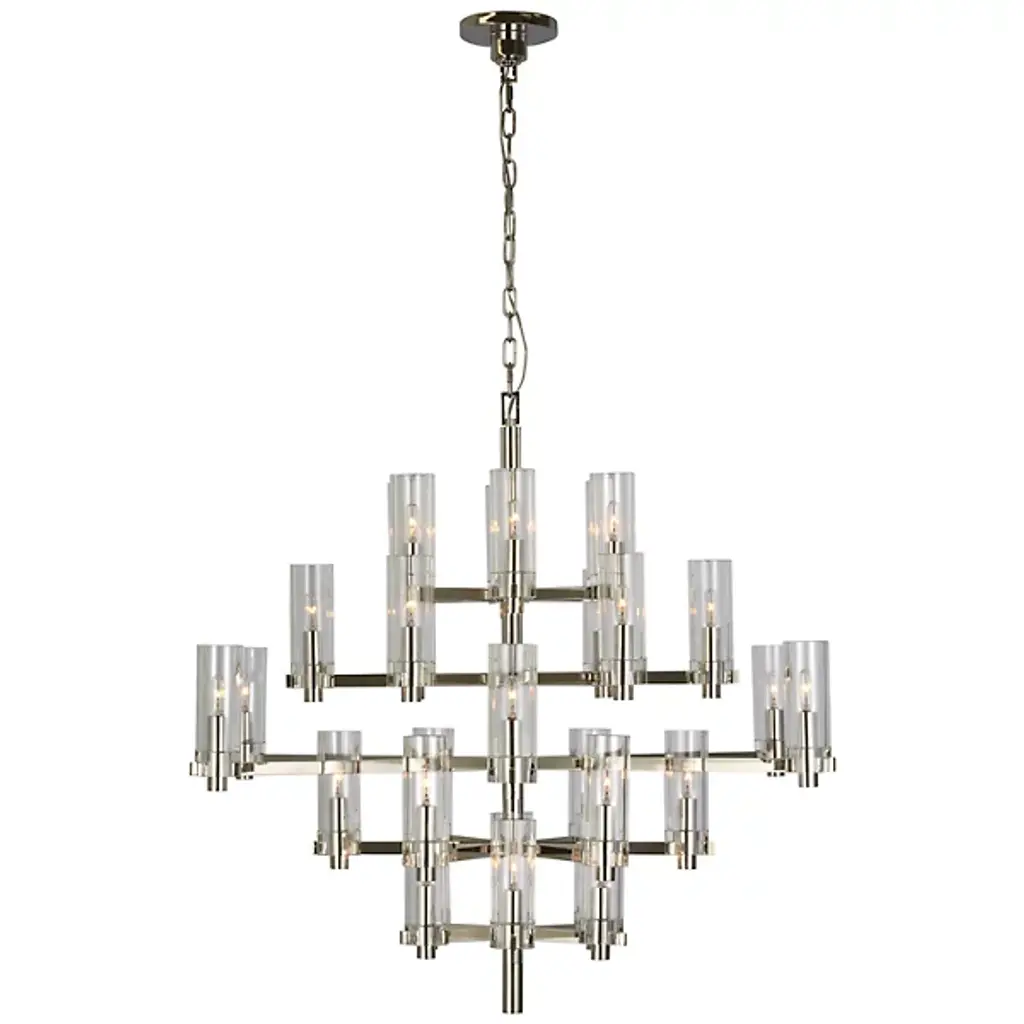 Bring a stylish sculptural presence to inside spaces with the Sonnet Glass Chandelier from Visual Comfort Signature, formerly known as Visual Comfort, A large fixture ideal for open interior spaces, it extends down from a sleek circular canopy via a medium-weight length of chain, securing a series of tiered levels below, each one sending up a series of short candelabra lamps inside clear glass cylinder shades. The arrangement swells to its broadest ebb halfway down and then contracts as it drops, creating an elegant geometric appeal.