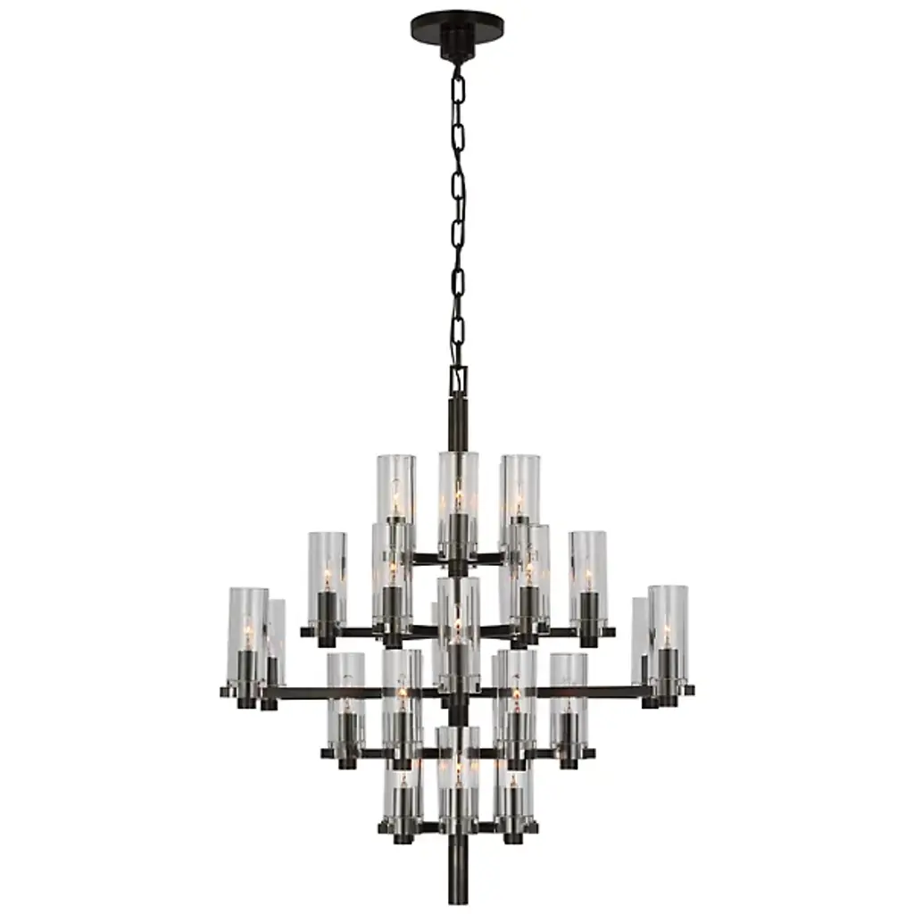 Bring a stylish sculptural presence to inside spaces with the Sonnet Glass Chandelier from Visual Comfort Signature, formerly known as Visual Comfort, A large fixture ideal for open interior spaces, it extends down from a sleek circular canopy via a medium-weight length of chain, securing a series of tiered levels below, each one sending up a series of short candelabra lamps inside clear glass cylinder shades. The arrangement swells to its broadest ebb halfway down and then contracts as it drops, creating an elegant geometric appeal.