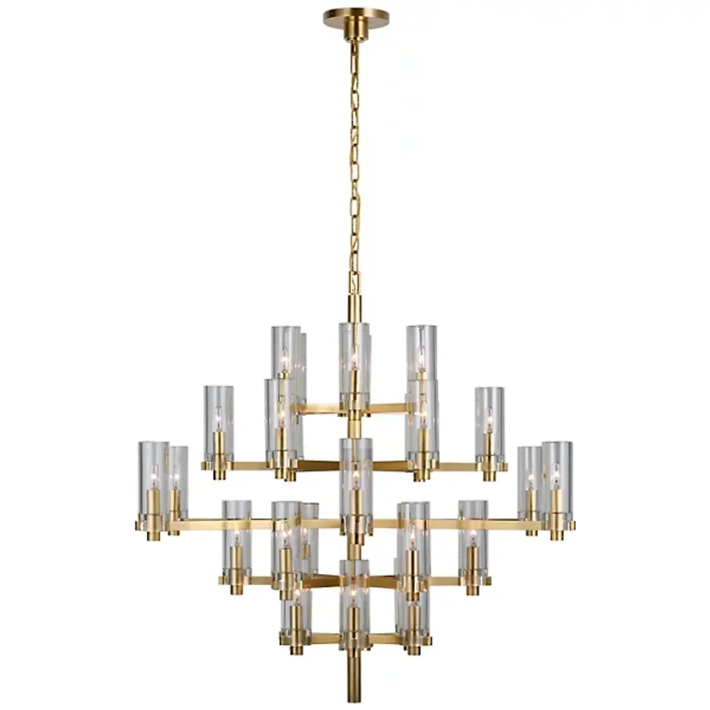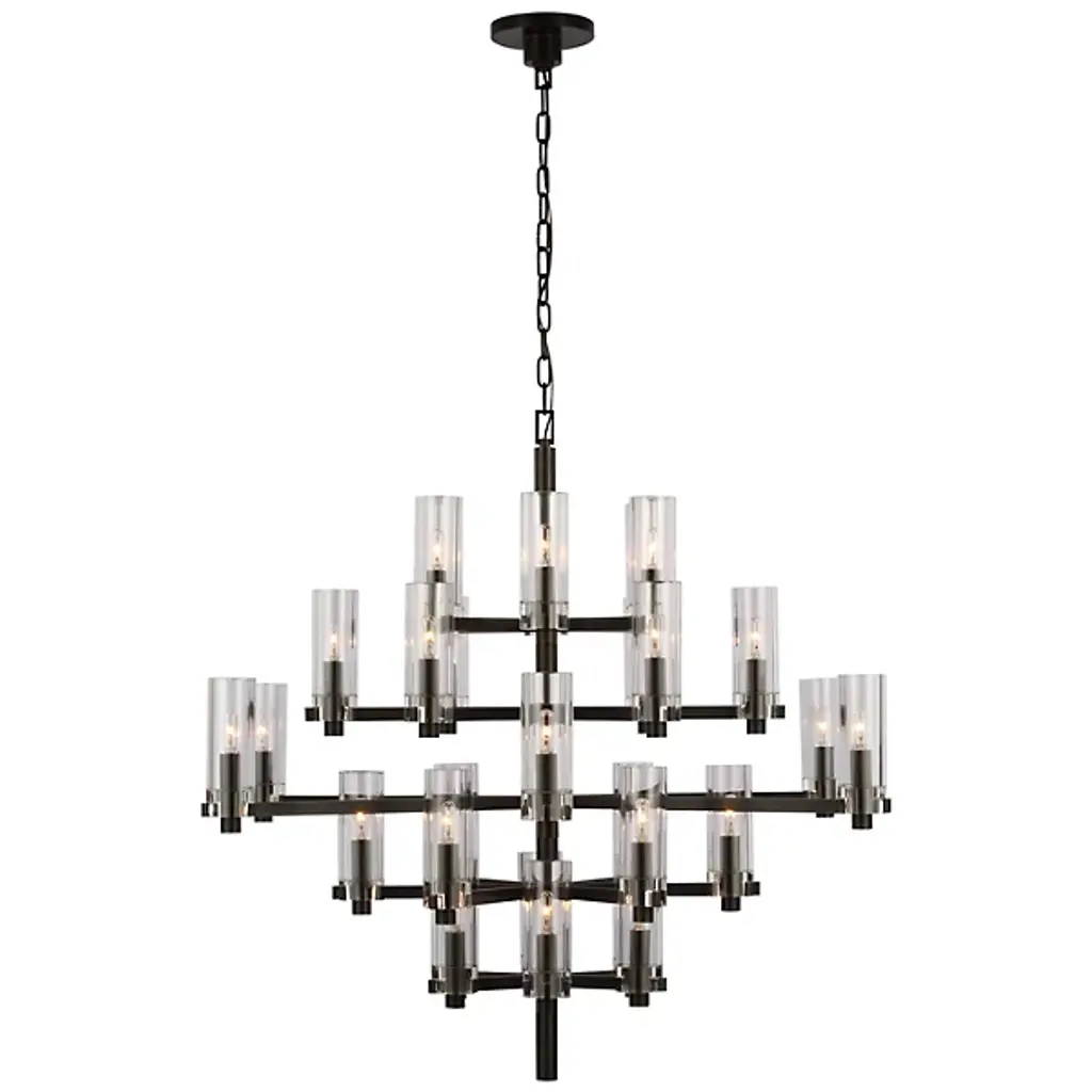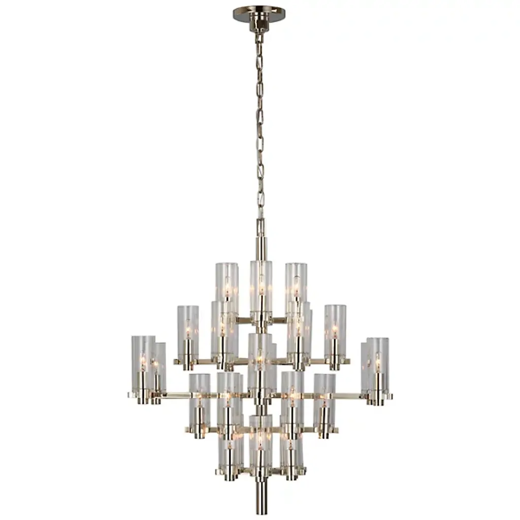 Bring a stylish sculptural presence to inside spaces with the Sonnet Glass Chandelier from Visual Comfort Signature, formerly known as Visual Comfort, A large fixture ideal for open interior spaces, it extends down from a sleek circular canopy via a medium-weight length of chain, securing a series of tiered levels below, each one sending up a series of short candelabra lamps inside clear glass cylinder shades. The arrangement swells to its broadest ebb halfway down and then contracts as it drops, creating an elegant geometric appeal.