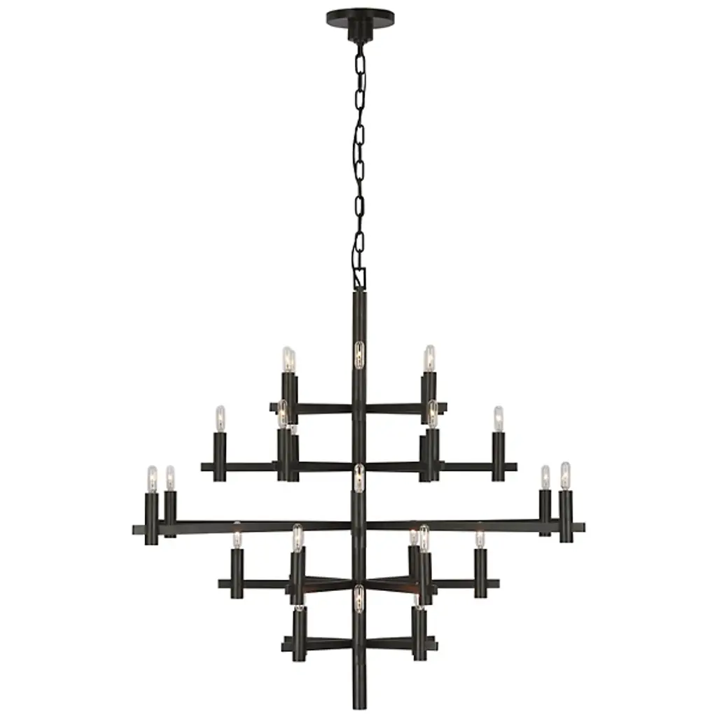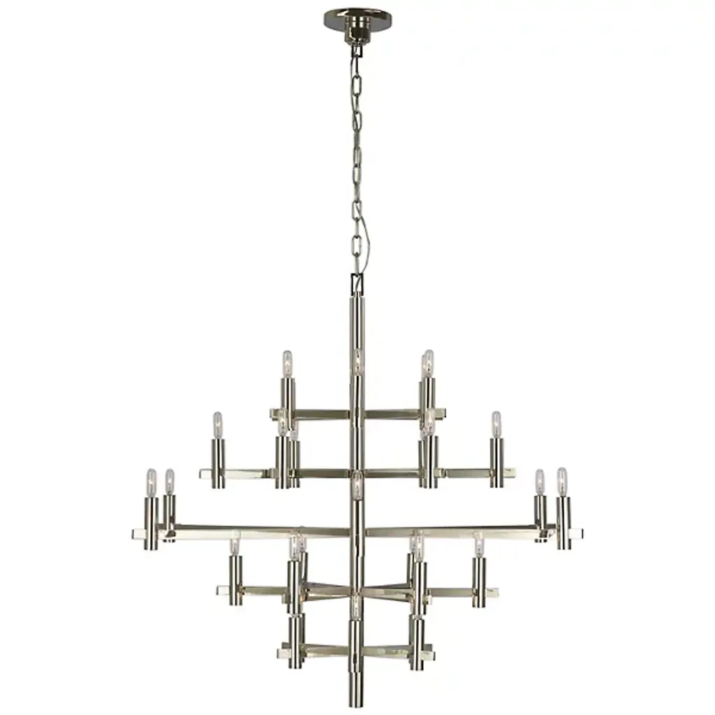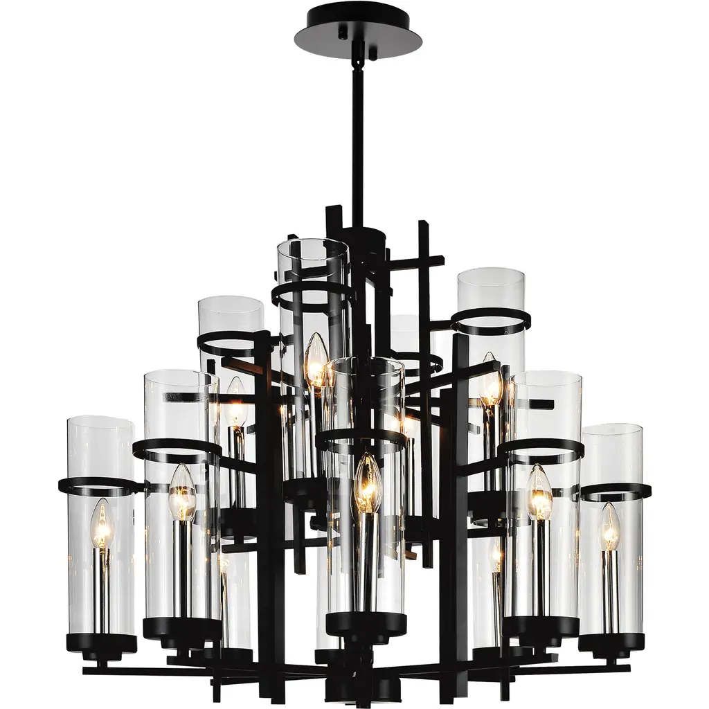 Bring a stylish sculptural presence to inside spaces with the Sonnet Glass Chandelier from Visual Comfort Signature, formerly known as Visual Comfort, A large fixture ideal for open interior spaces, it extends down from a sleek circular canopy via a medium-weight length of chain, securing a series of tiered levels below, each one sending up a series of short candelabra lamps inside clear glass cylinder shades. The arrangement swells to its broadest ebb halfway down and then contracts as it drops, creating an elegant geometric appeal.