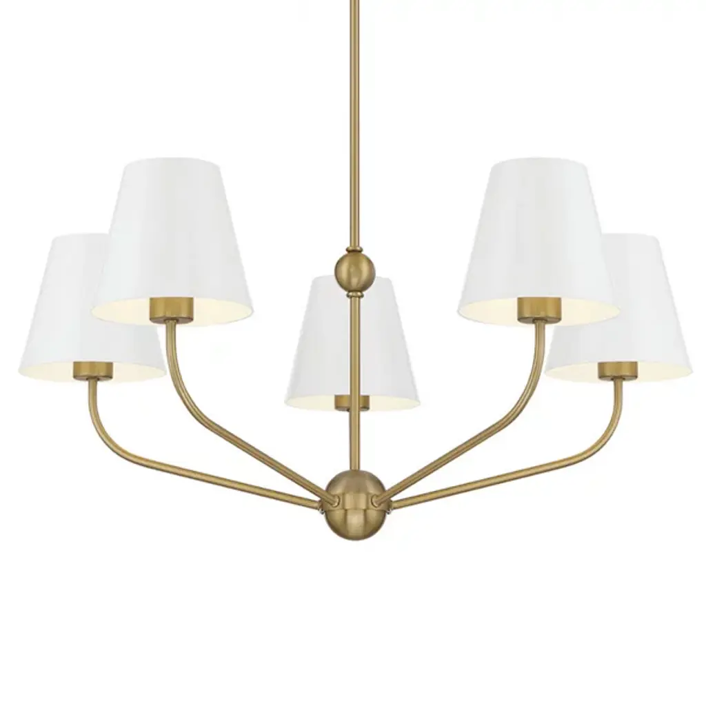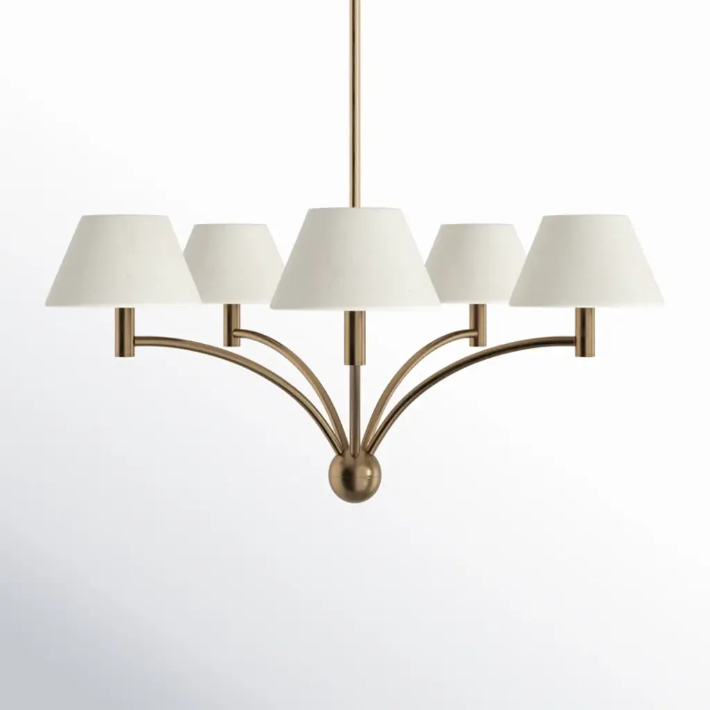 A calm and collected modern piece, the Sophia Chandelier from Kalco shapes the décor with a comforting layer of light. Descending from the ceiling on a long and thin metal rod, this piece features a matching central disc that extends a series of arcing arms that lead to linen shades. The shades each hold a single bulb that diffuses its light through the material into a comforting and warm ambiance.
