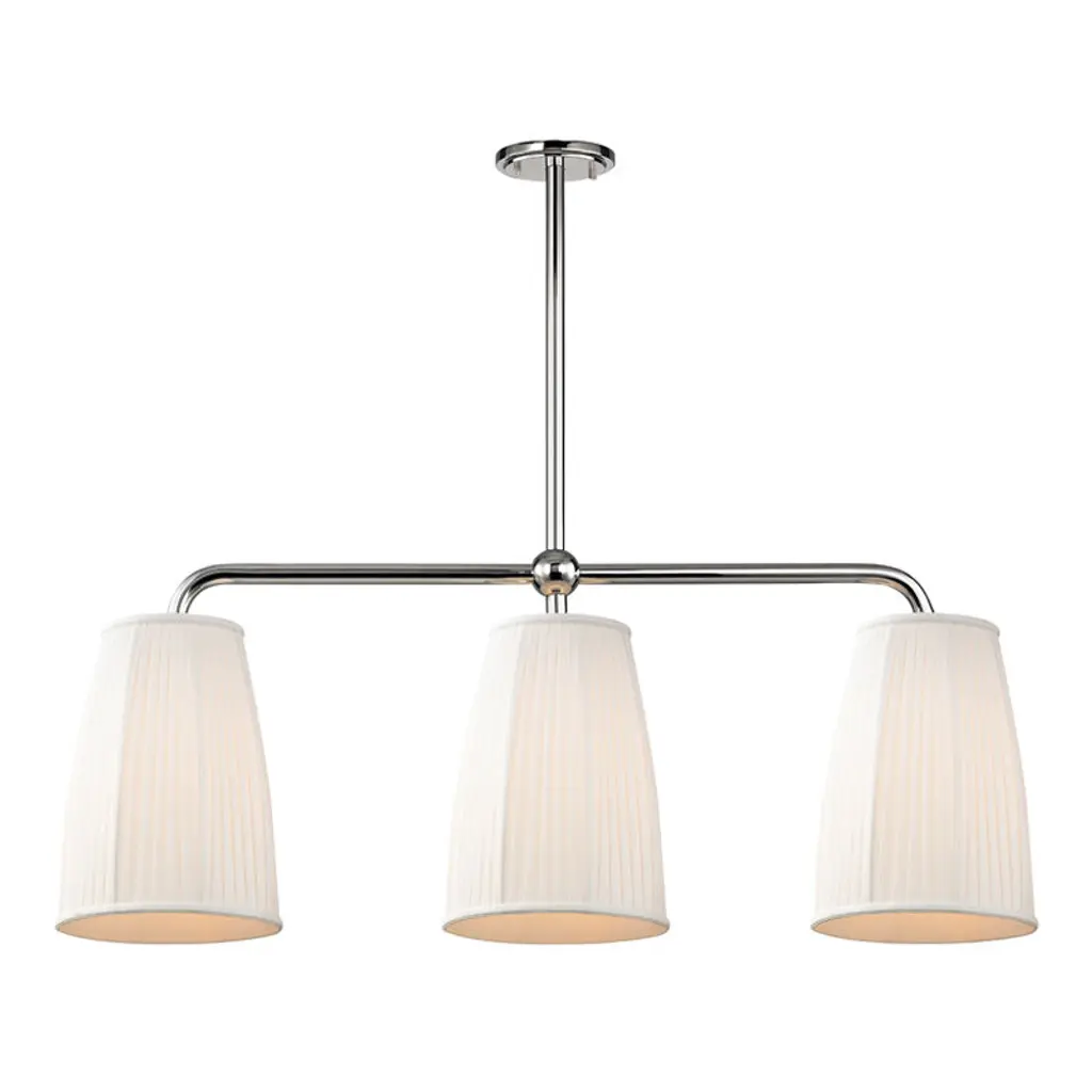 A calm and collected modern piece, the Sophia Chandelier from Kalco shapes the décor with a comforting layer of light. Descending from the ceiling on a long and thin metal rod, this piece features a matching central disc that extends a series of arcing arms that lead to linen shades. The shades each hold a single bulb that diffuses its light through the material into a comforting and warm ambiance.