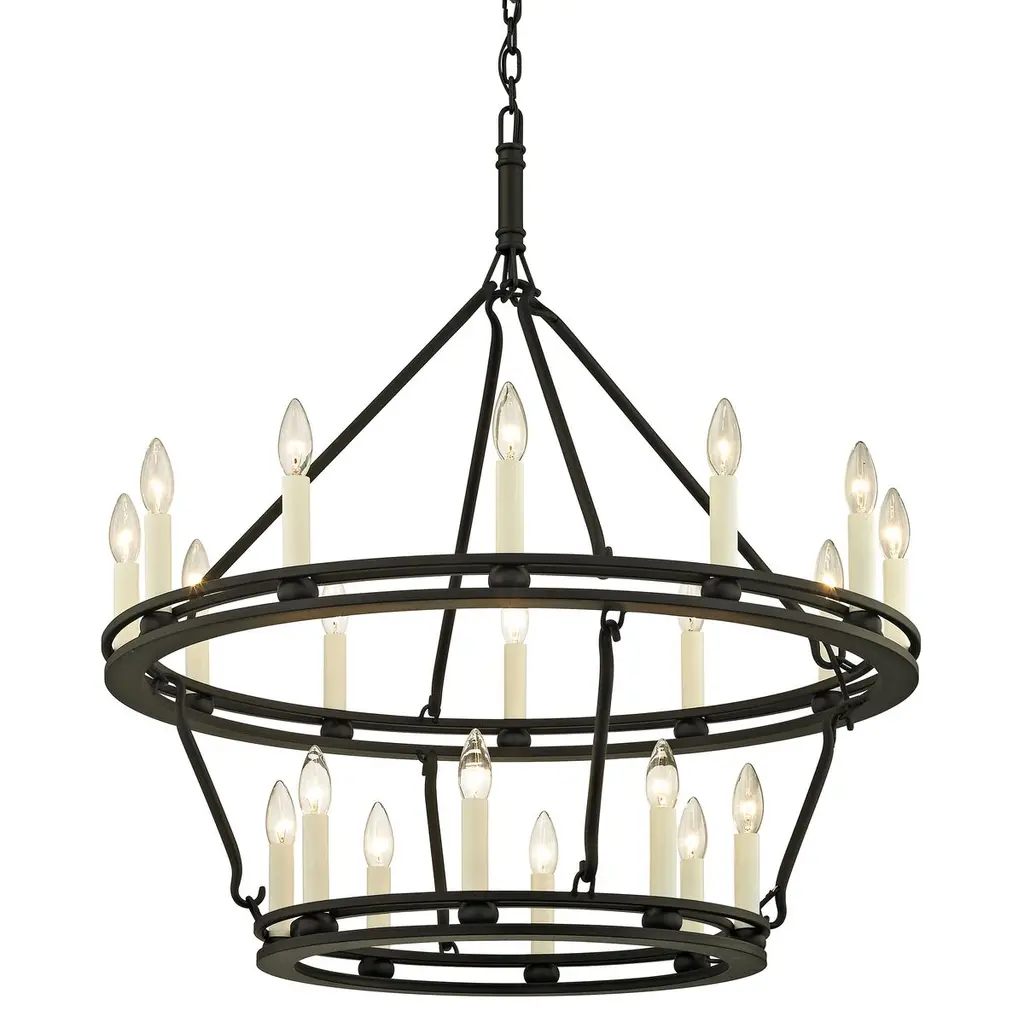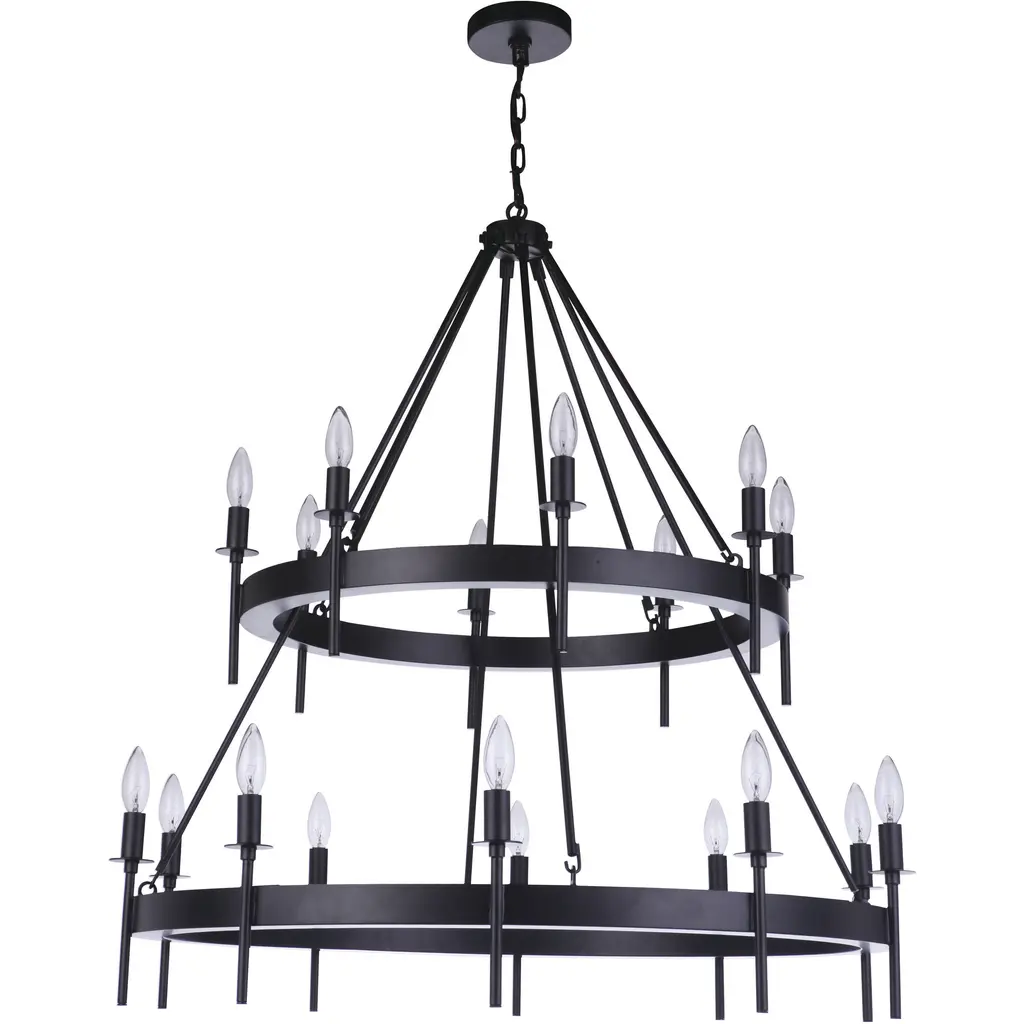 A pair of rings form the circular silhouette of this stunning chandelier. Candlesticks around the circumference provide an abundance of bright, beautiful light. The chandelier is available in Champagne Silver Leaf or Textured Black. This item is suitable for interior use only.