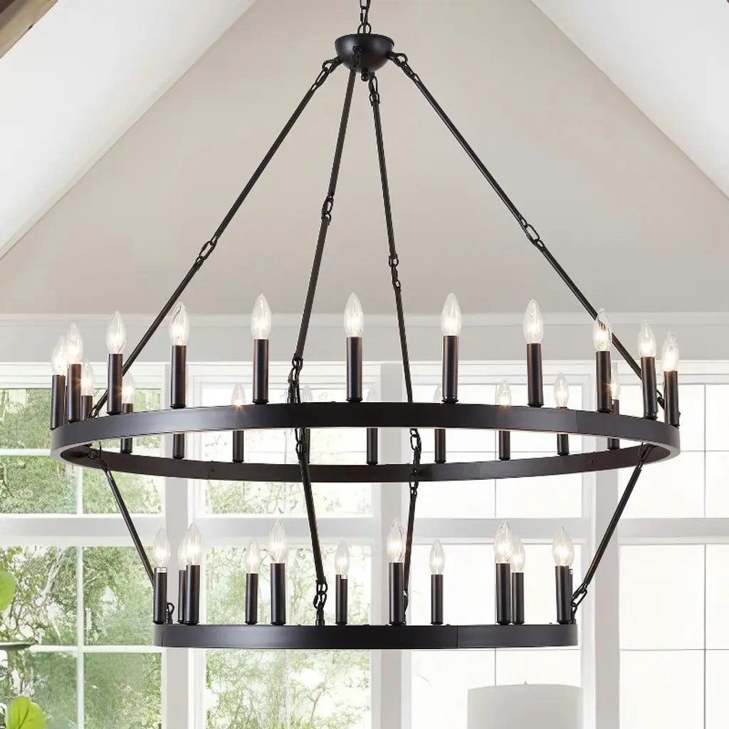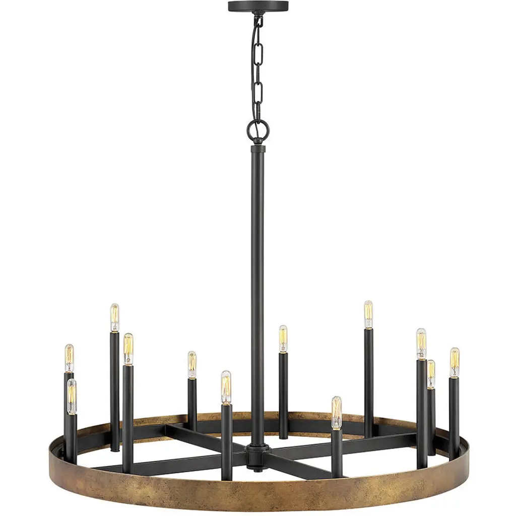 A pair of rings form the circular silhouette of this stunning chandelier. Candlesticks around the circumference provide an abundance of bright, beautiful light. The chandelier is available in Champagne Silver Leaf or Textured Black. This item is suitable for interior use only.