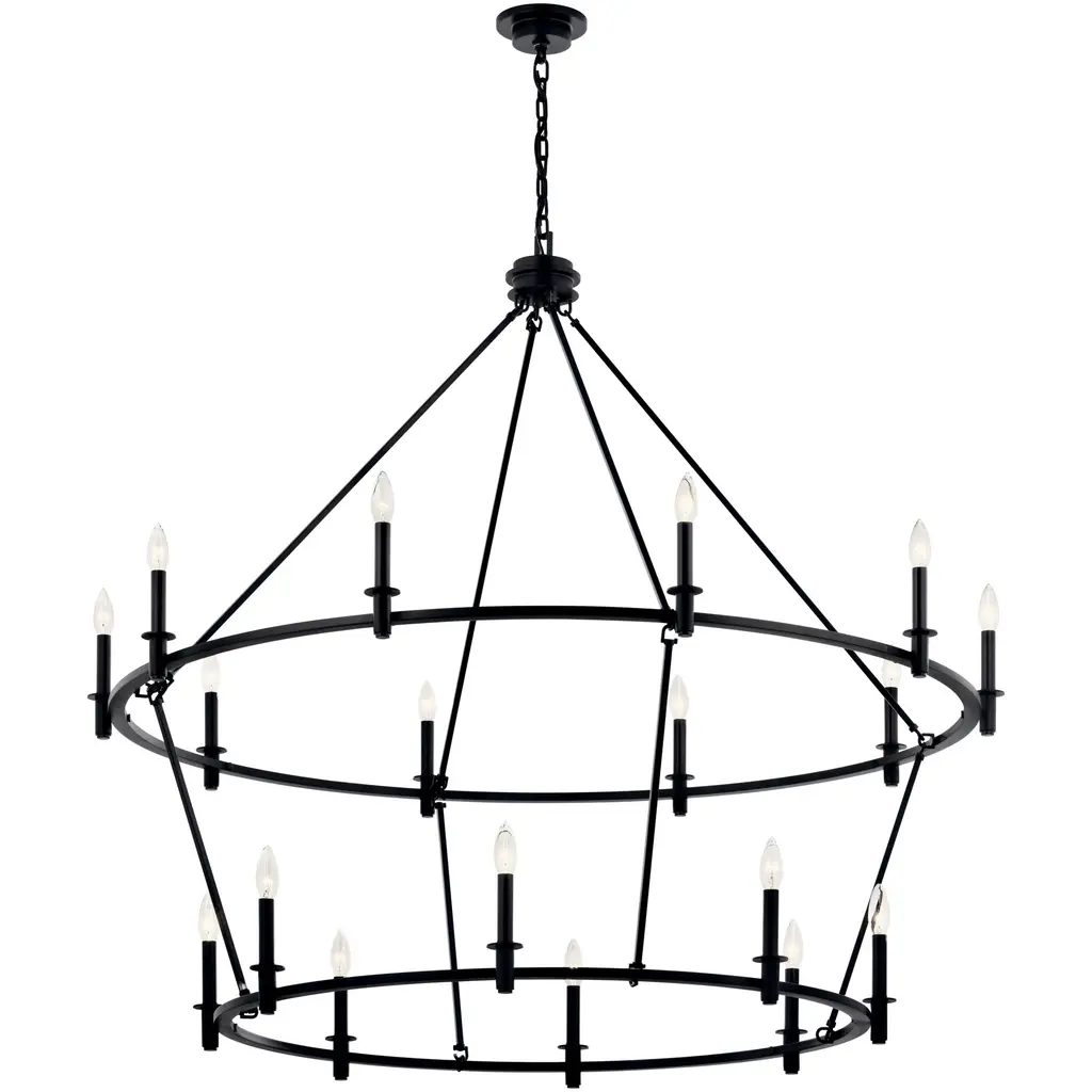 A pair of rings form the circular silhouette of this stunning chandelier. Candlesticks around the circumference provide an abundance of bright, beautiful light. The chandelier is available in Champagne Silver Leaf or Textured Black. This item is suitable for interior use only.