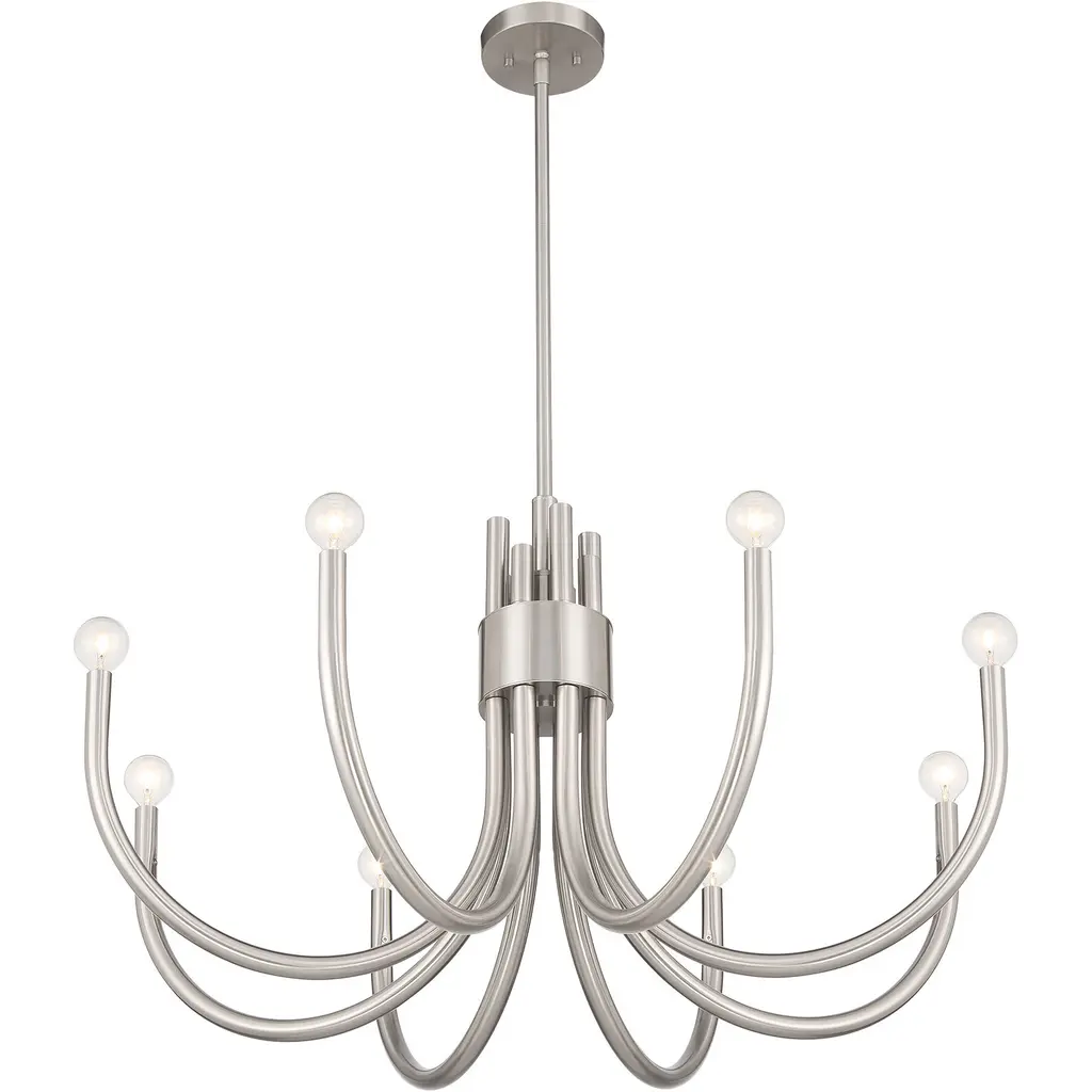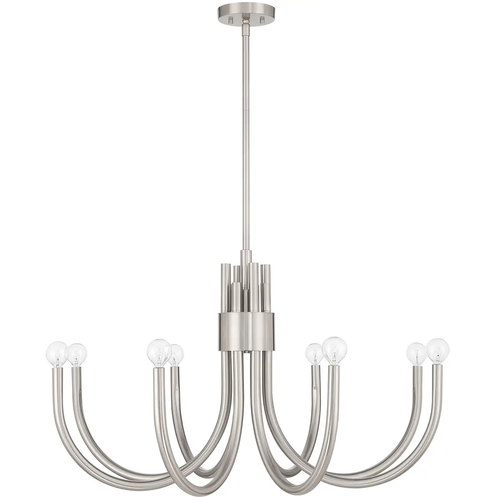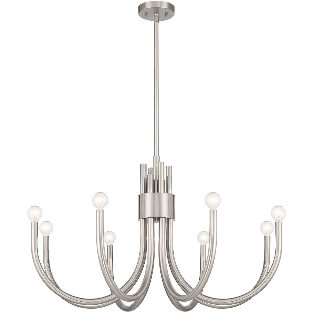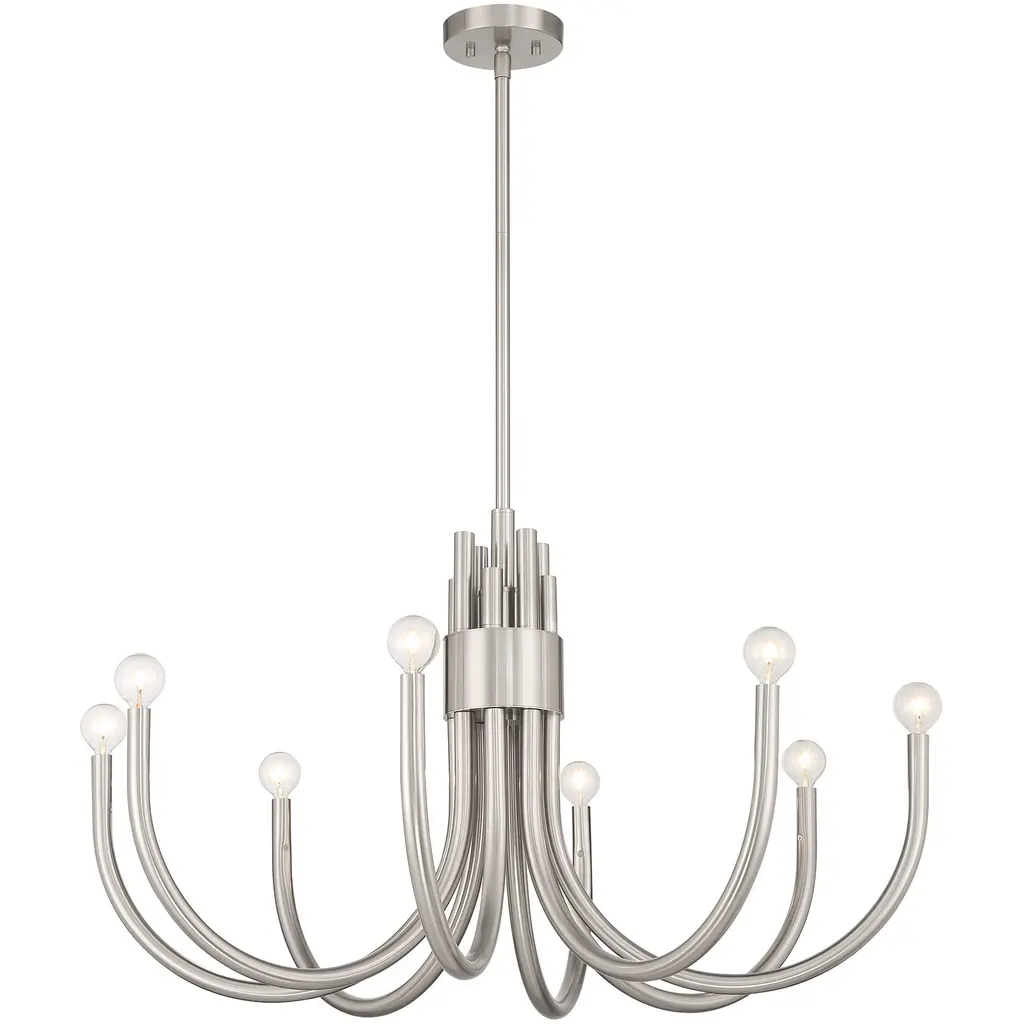 The Savoy House Sorrento 8-light chandelier is sure to stand out in any space Thick tubular arms curve upward and are each topped by an exposed light bulb. The fashionable Satin Nickel finish looks great with every color or pattern. Sorrento is 34" in width and has an adjustable height ranging from 21" to 75". Comes with four 12" downrods and one 6" downrod. Uses eight candelabra size bulbs of up to 60 watts per bulb. Bulbs not included.