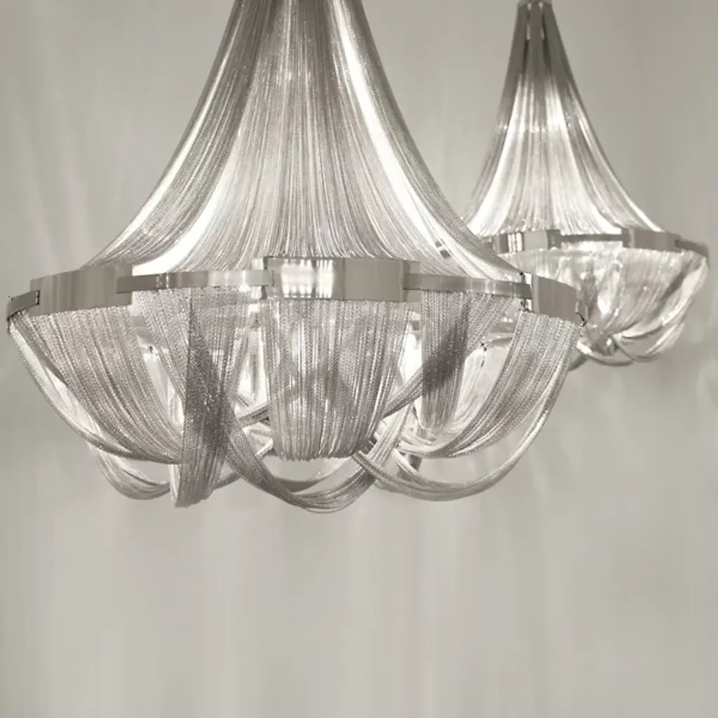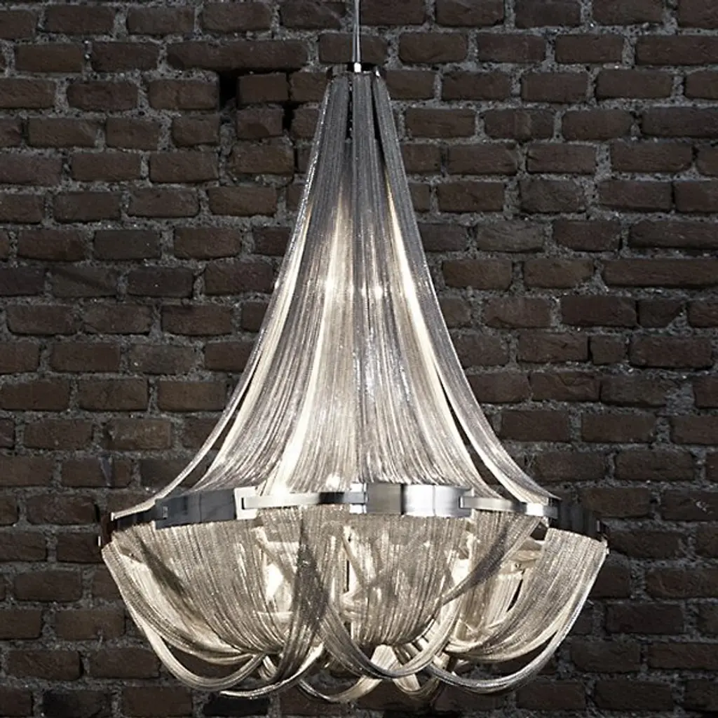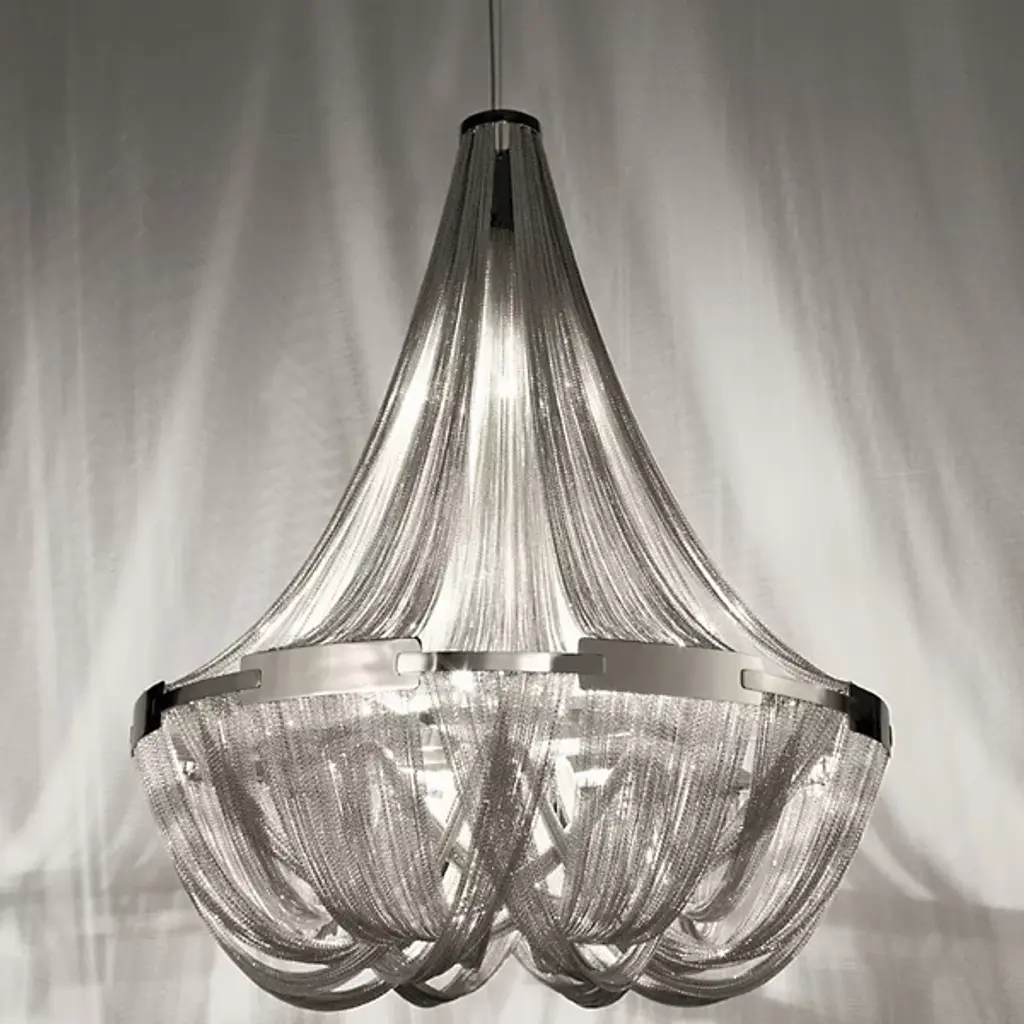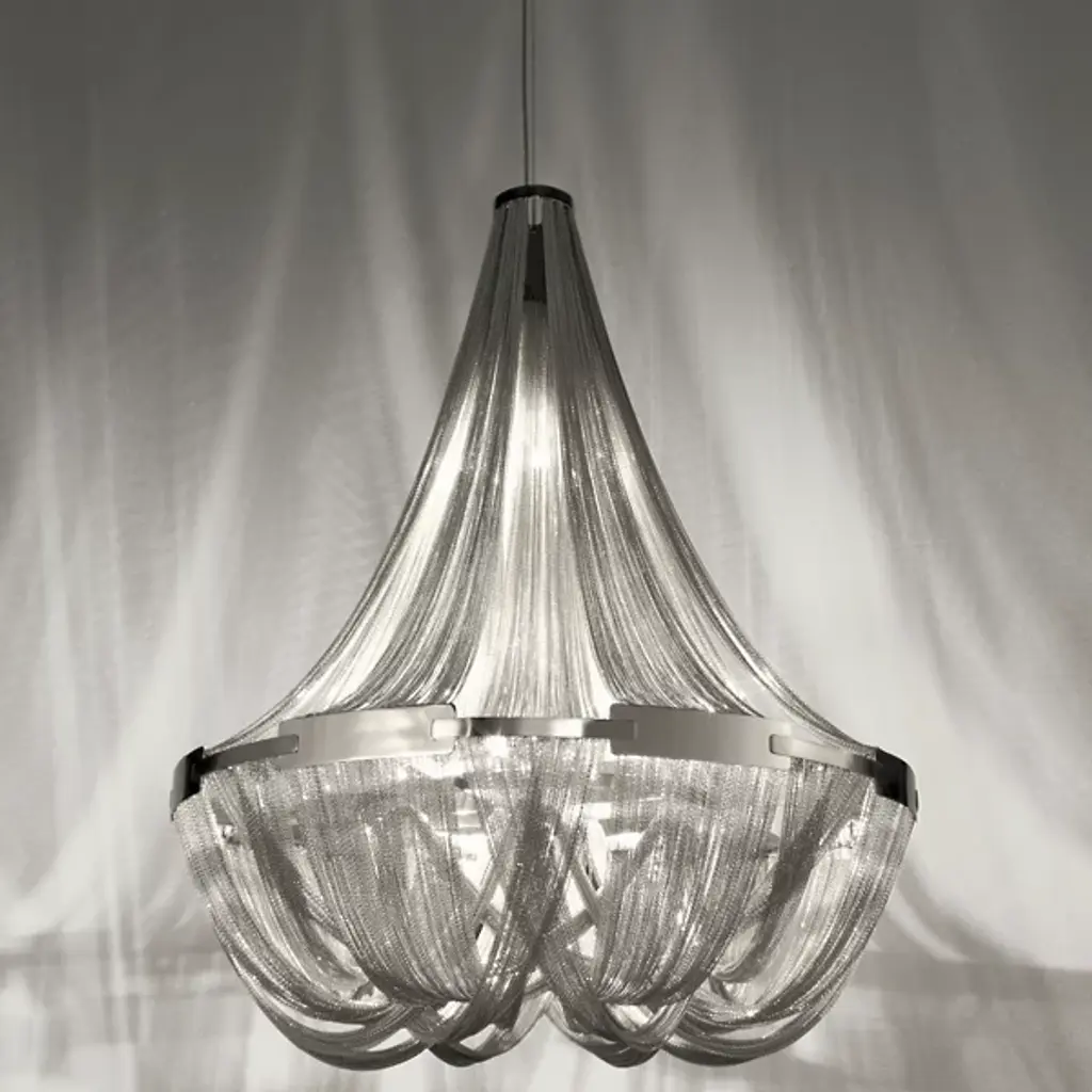 Reinventing a classic look, the Terzani Soscik Chandelier takes the idea of the chandelier and gives it a modern upgrade. The chains that drape themselves around the metal frame provide a unique screen through which inner illumination peeks through one spot and shines through another.