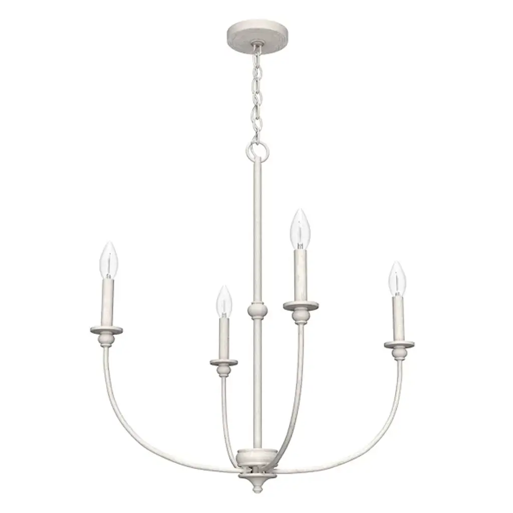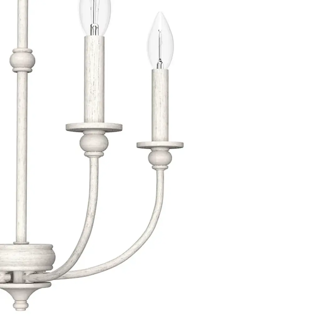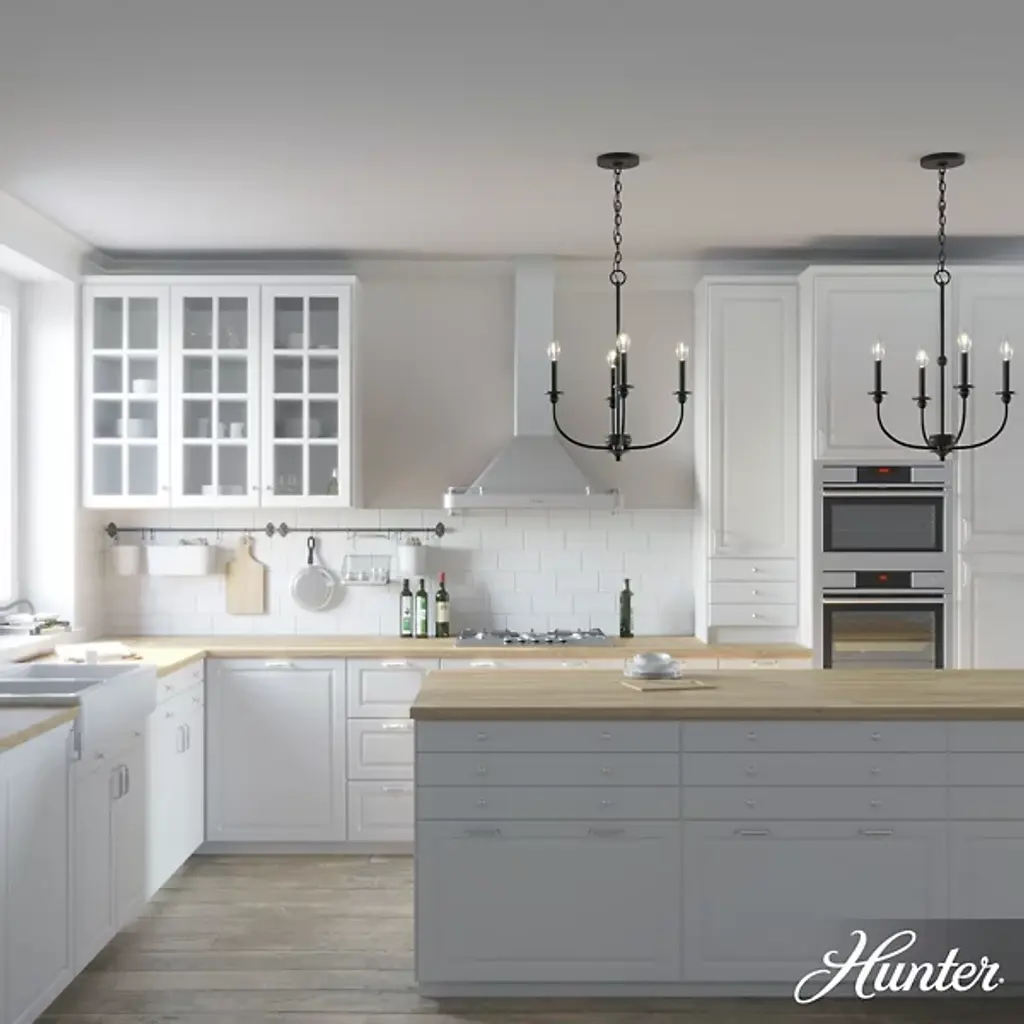 A bright balance of traditional design and modern style, the Southcrest Chandelier by Hunter Fans lends warmth to your living space while introducing an air of cottage charm. Casual enough to complement most existing decor schemes, this chandelier is made available in multiple sizes. This transitionally styled light fixture features flame-shaped bulbs and is a welcome contrast to your home's décor.