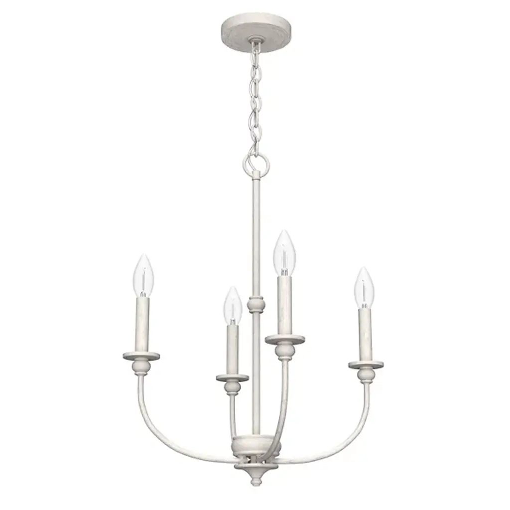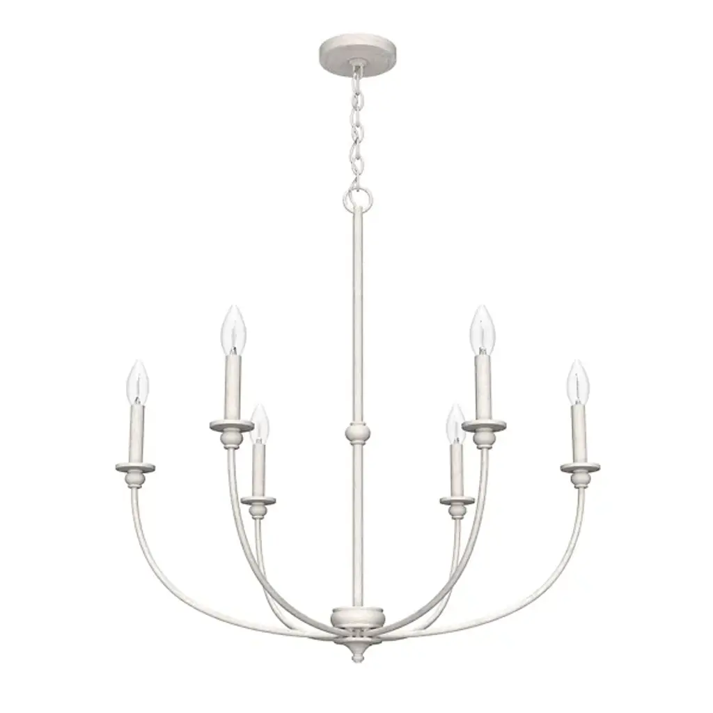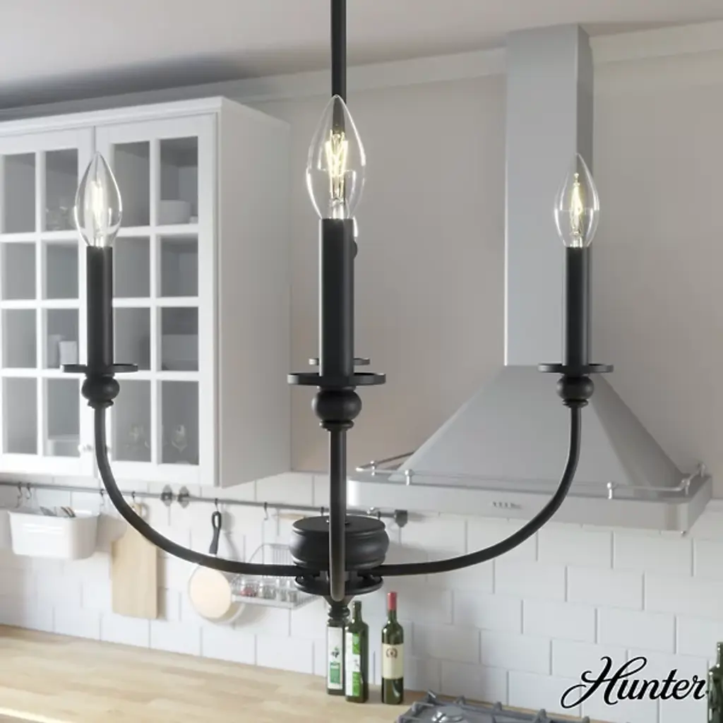 A bright balance of traditional design and modern style, the Southcrest Chandelier by Hunter Fans lends warmth to your living space while introducing an air of cottage charm. Casual enough to complement most existing decor schemes, this chandelier is made available in multiple sizes. This transitionally styled light fixture features flame-shaped bulbs and is a welcome contrast to your home's décor.