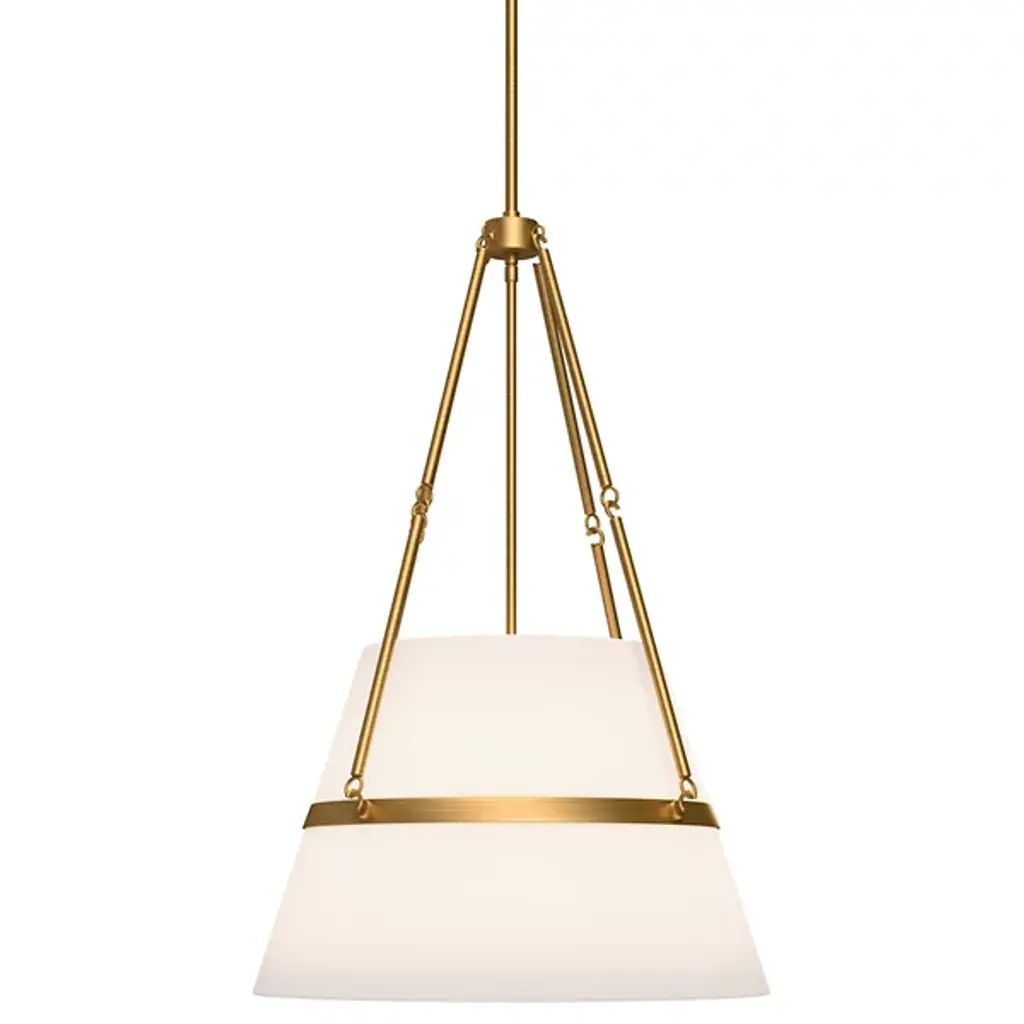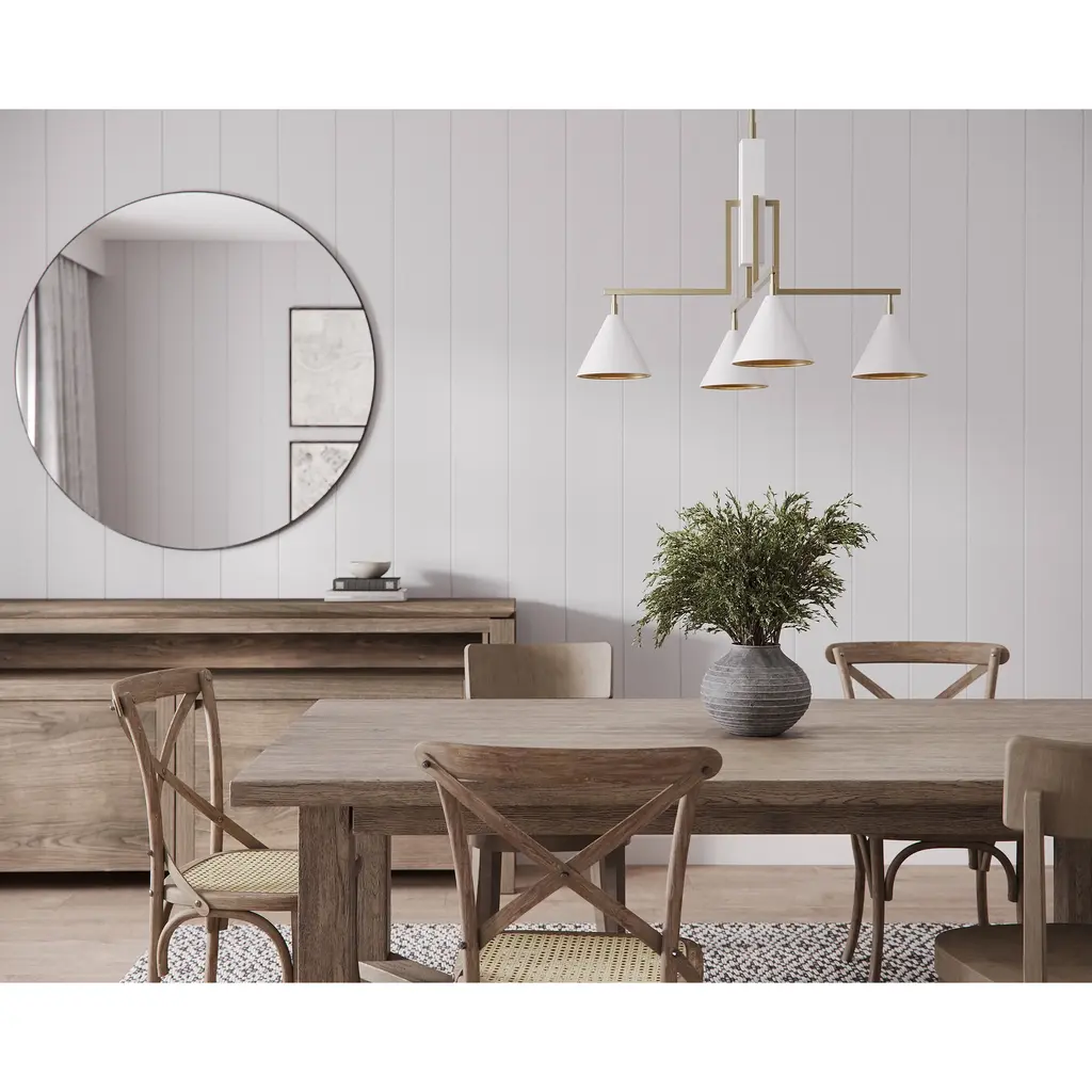 A touch Mid-Century Modern, a touch architectural, this four-light chandelier would bring a refined sensibility to a dining room. Shown here in a Matte Off-White finish, this chandelier emits a warm glow when illuminated thanks to the Antique Brass interior of its shades. Also available in Bronze finish.