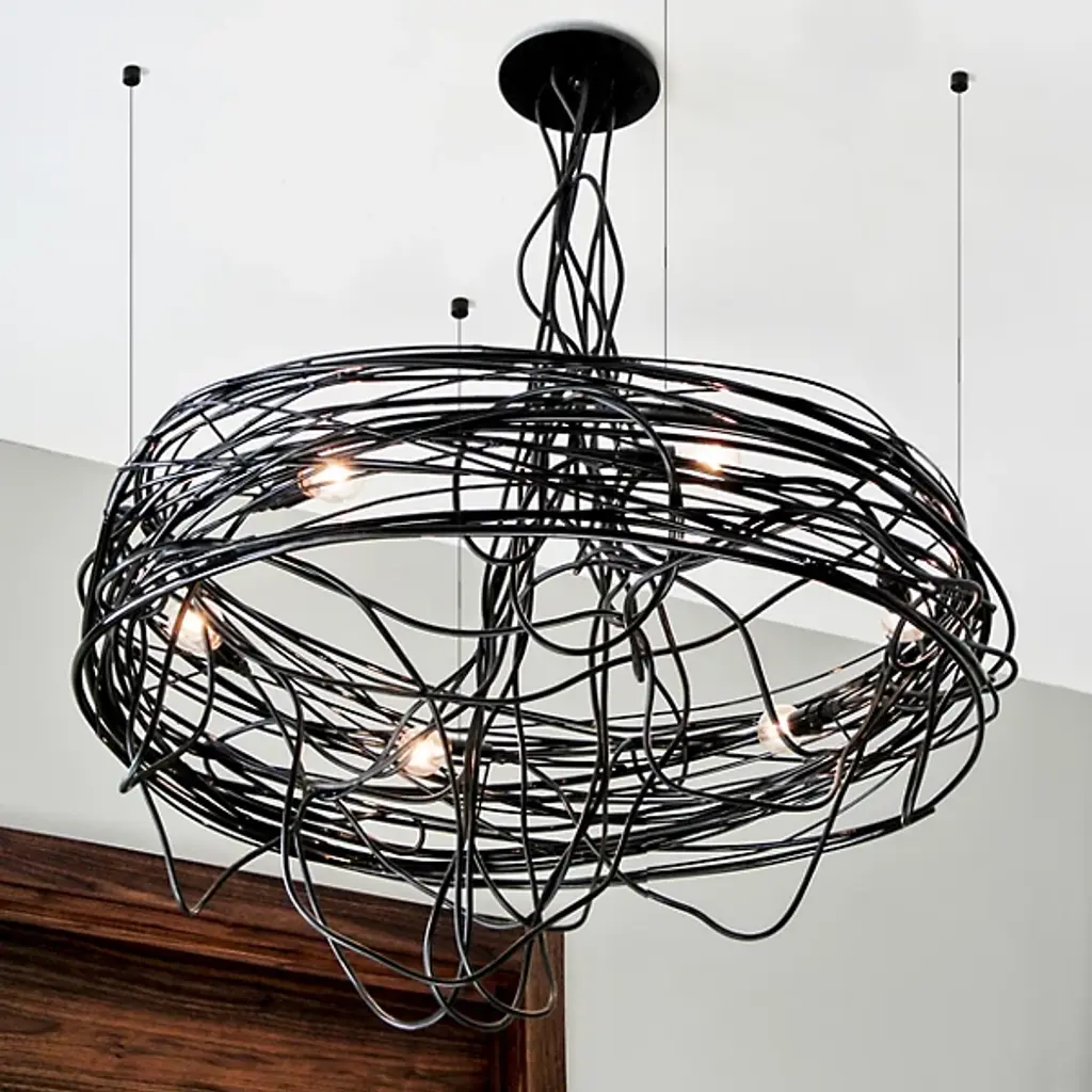 The Spiral Nest Chandelier from Ridgely Studio is made in Toronto. The Spiral Nest Chandelier is a fortuitous accident born from a scribble in an artist's notepad. Composed of hand rolled steel rods skillfully welded together in a circular pattern, each Spiral Nest is slightly different and although similar, no two are identical. This contemporary chandelier is available in three sizes, and is ideal for use in modern kitchens, living rooms, and bedrooms. With a variety of powder coat and plated finishes to choose from, the possibilities with Spiral Nest are endless.