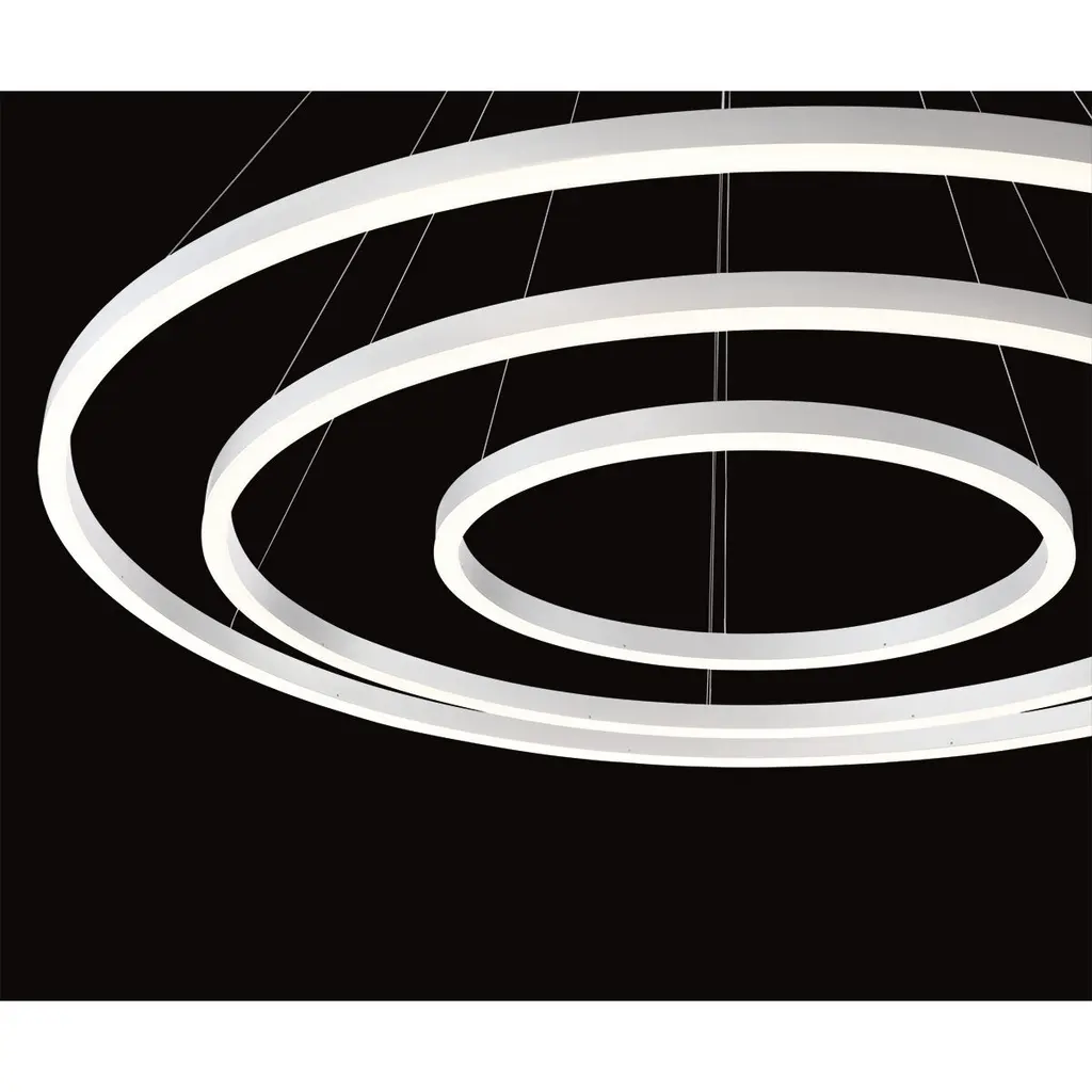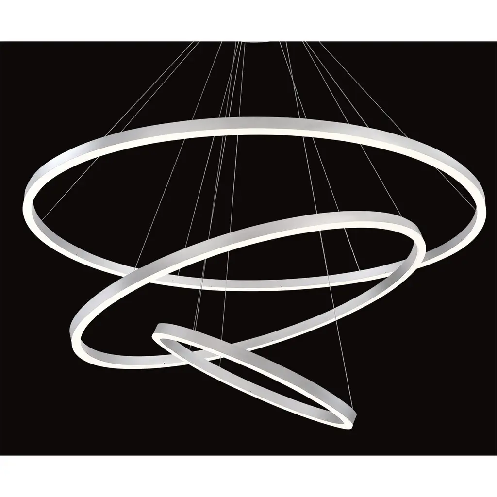 Oversized machined aluminum rings bring these simple chandeliers to life. The grand stature demands attention and illuminates large spaces with opal diffused LED lighting.