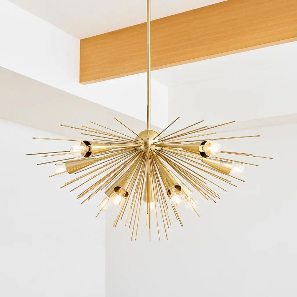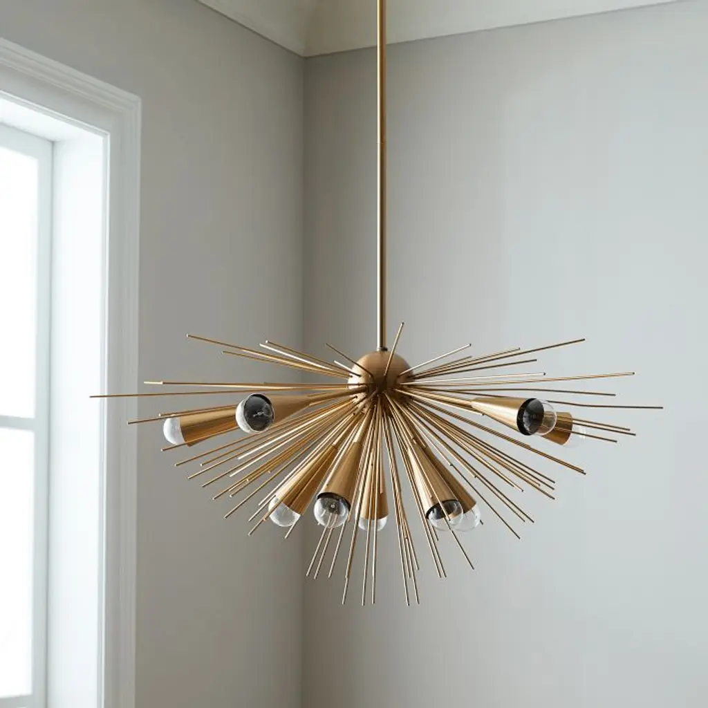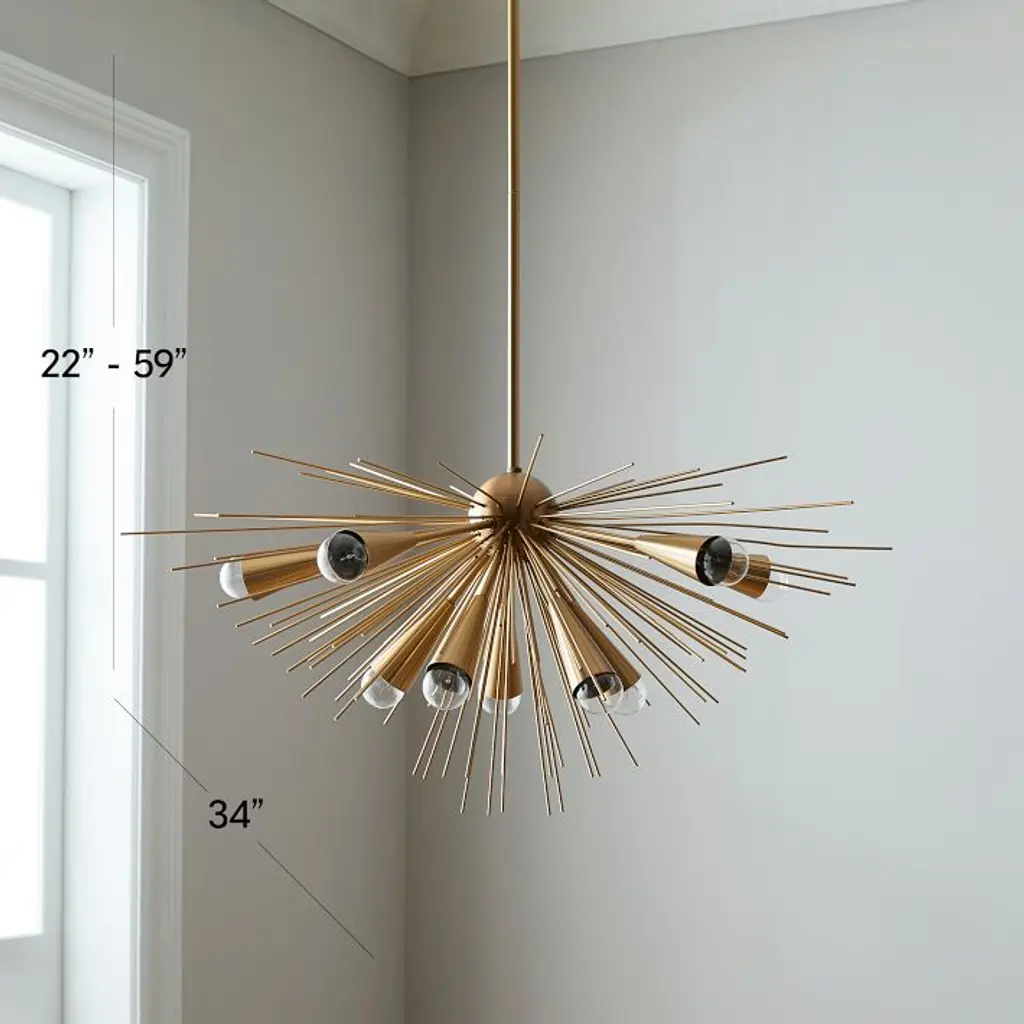 Our modern take on an iconic art deco design, the Sputnik Chandelier adds a burst of celestial-inspired light—and an instant conversation starter—to any room. Iron with a Brass finish. Adjustable hanging height. Comes with three 12" metal rods and one 6" rod to adjust hanging height. Hardwired. May be paired with dimmer switch (sold separately). Accommodates ten 6.5W Type G bulbs (not included). E12 socket. UL listed. This contract-grade item is manufactured to meet the demands of commercial use in addition to residential. See more. Made in China.