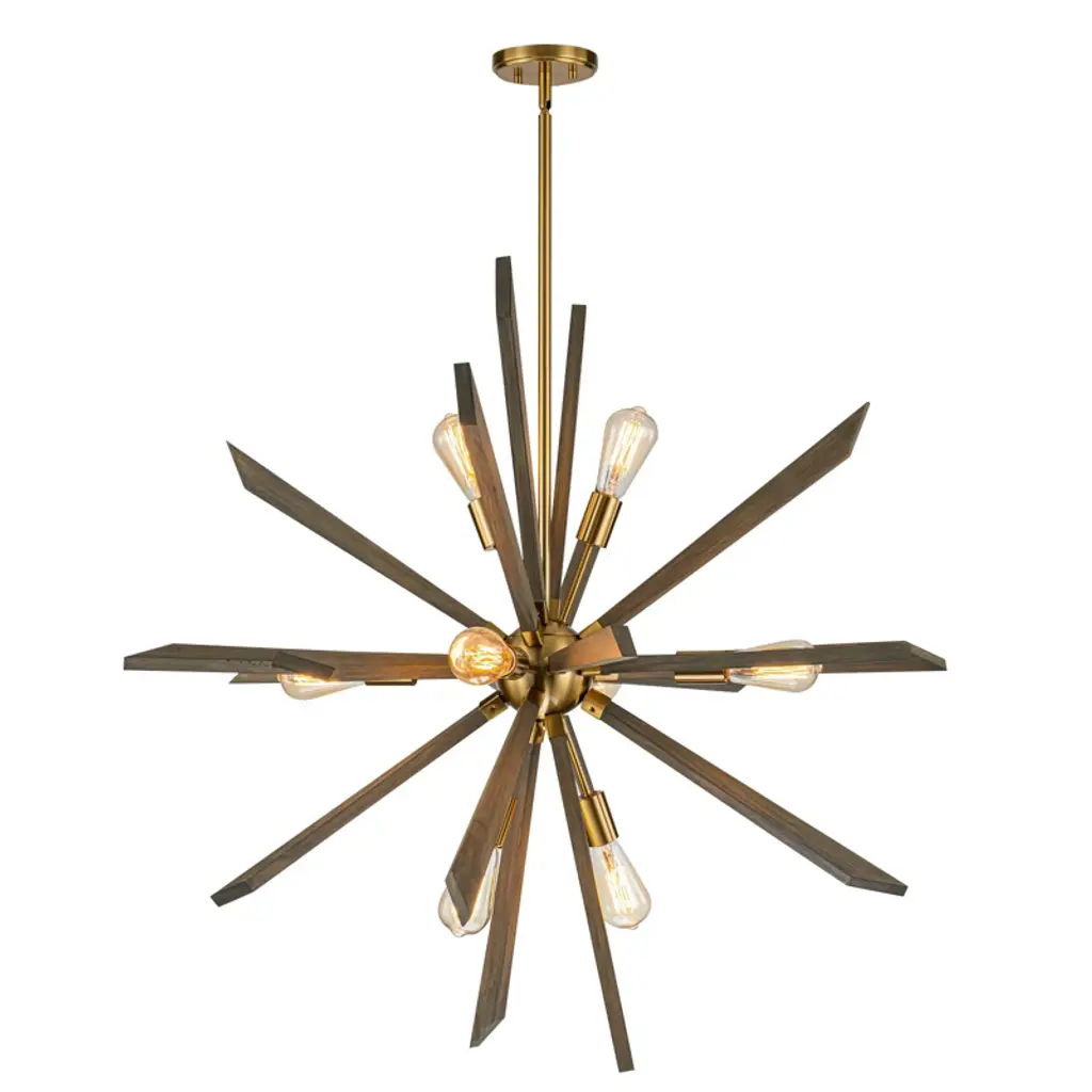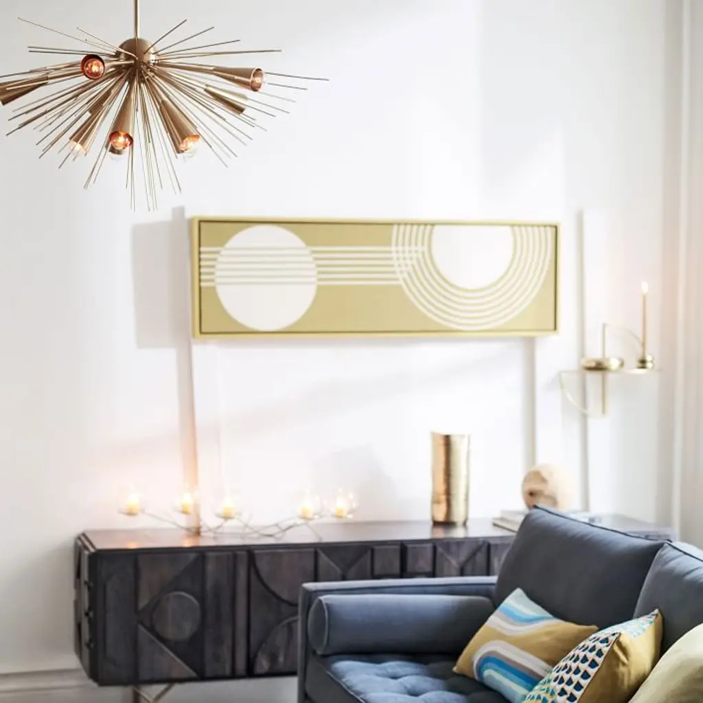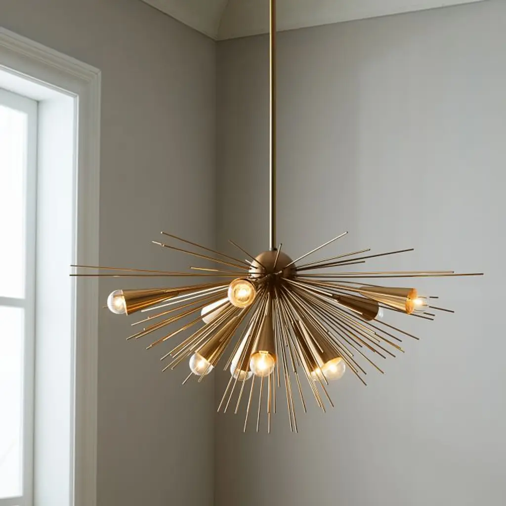 Our modern take on an iconic art deco design, the Sputnik Chandelier adds a burst of celestial-inspired light—and an instant conversation starter—to any room. Iron with a Brass finish. Adjustable hanging height. Comes with three 12" metal rods and one 6" rod to adjust hanging height. Hardwired. May be paired with dimmer switch (sold separately). Accommodates ten 6.5W Type G bulbs (not included). E12 socket. UL listed. This contract-grade item is manufactured to meet the demands of commercial use in addition to residential. See more. Made in China.