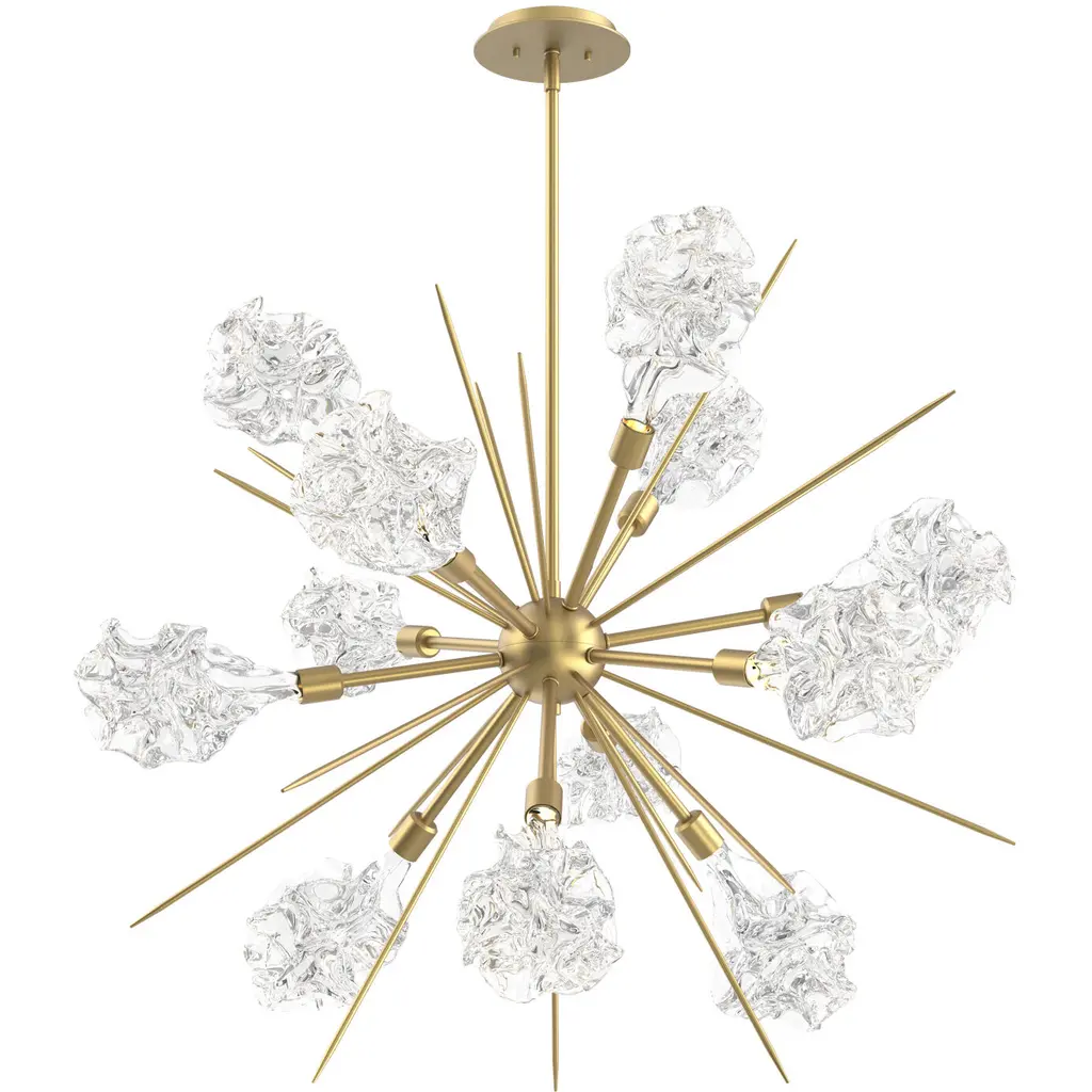 Modern Glamour. A groovy classic with our own twinkly twist. The Sputnik Chandelier is perfect for making your pad feel like a Parisian parlour. Our riff on the design staple features custom laser-cut crown cups that halo the bulbs for a modern glow. Tiny stems with crystal accents further reflect the galactic light and lend a ladylike grace to any room. Available in antiqued brass or polished nickel. All lighting sales are final.