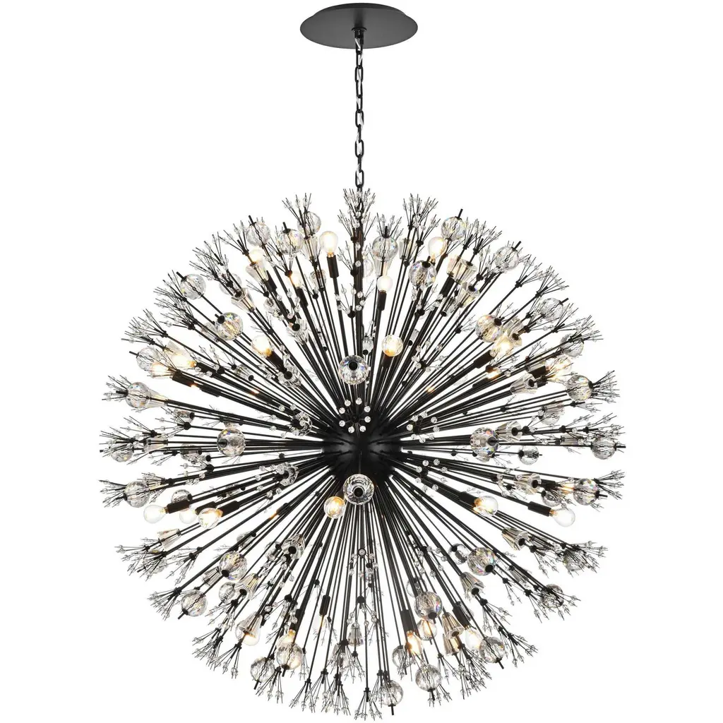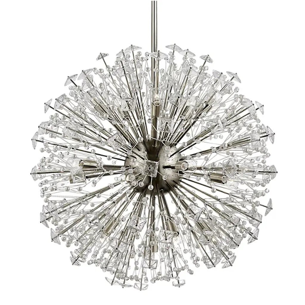 Launch a modern design scheme into orbit with the Sputnik Chandelier by Jonathan Adler. At once futuristic and retro, funky and elegant, the space age-inspired Sputnik features numerous metal spokes shooting out from a central metal sphere, each accented by sparkling crystal or a glowing bulb.
