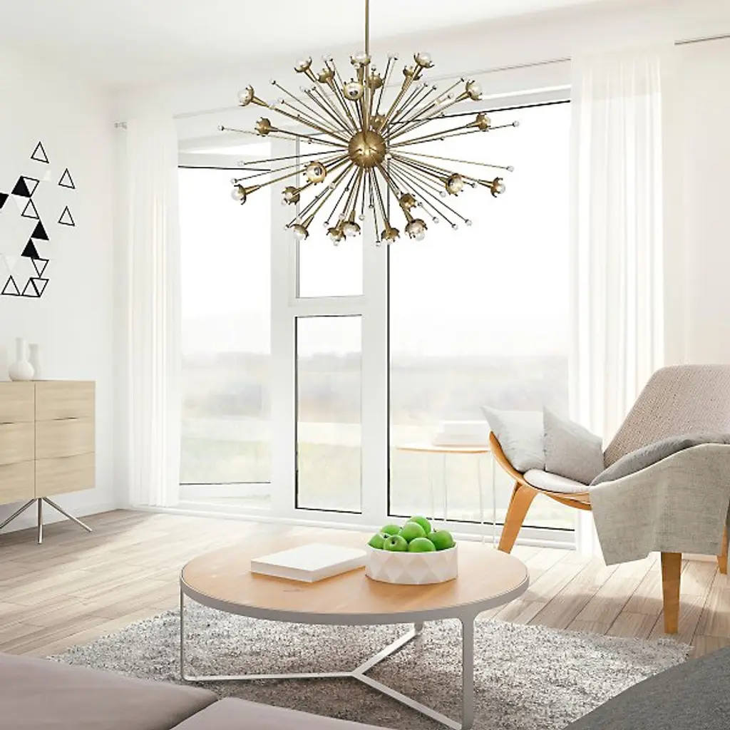 Launch a modern design scheme into orbit with the Sputnik Chandelier by Jonathan Adler. At once futuristic and retro, funky and elegant, the space age-inspired Sputnik features numerous metal spokes shooting out from a central metal sphere, each accented by sparkling crystal or a glowing bulb.