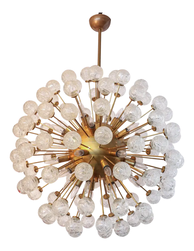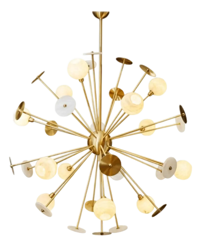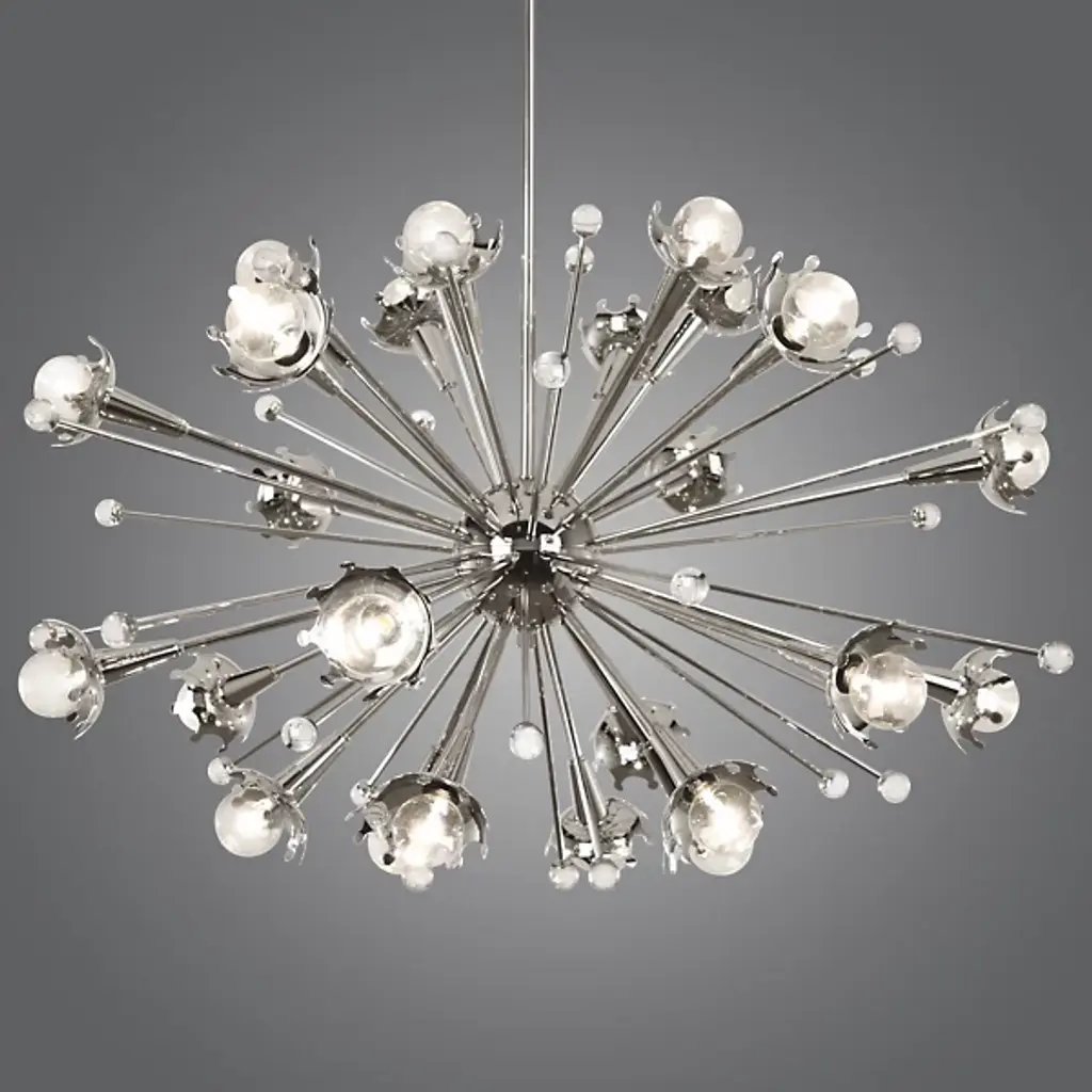 Launch a modern design scheme into orbit with the Sputnik Chandelier by Jonathan Adler. At once futuristic and retro, funky and elegant, the space age-inspired Sputnik features numerous metal spokes shooting out from a central metal sphere, each accented by sparkling crystal or a glowing bulb.