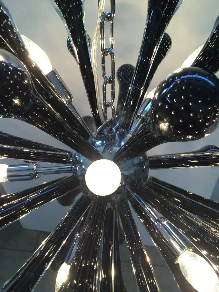 Contemporary SPUTNIK chandelier with black “DROPS ” with bubbles inside All made in Murano glass kromo metal frame Dimensions 25.6ʺW × 25.6ʺD × 25.6ʺL Ship from Italy, not assembled ship from italy in a strong packing i will rewiring for USA in some weeks