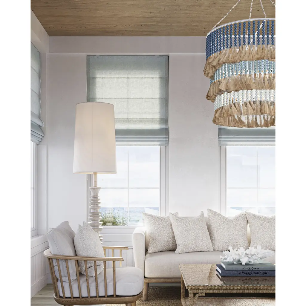 Jamie Beckwith is the mastermind behind the St. Barts Blue Chandelier, which is made of wood beads in a mix of white, mist blue, and denim blue hues that echo the colors of the sea. These hang from a triple-tier wrought iron frame in a sugar white finish. The natural abaca rope on which the beads are strung is knotted and snipped by hand to leave elemental tassels that will flutter when stirred by a lively breeze. The beaded chandelier is one of several ocean-inspired designs by Beckwith; we also offer it as a two-tier pendant.