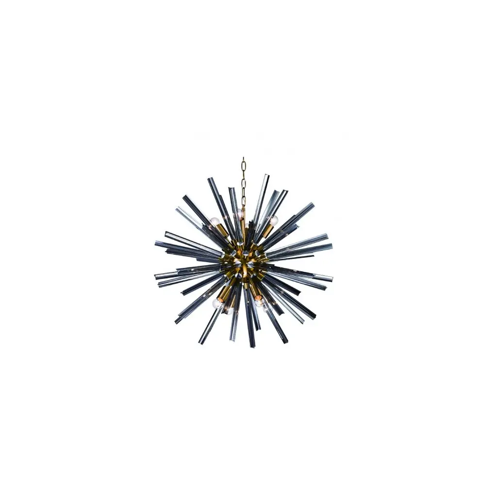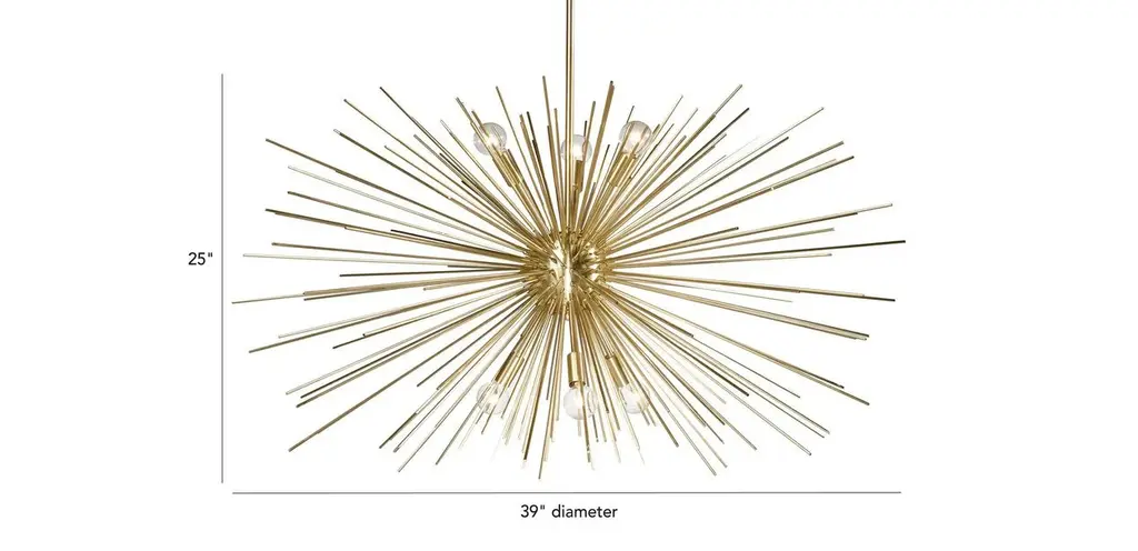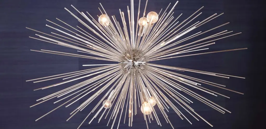 The Starburst sputnik chandelier pays homage to bold midcentury chandeliers that really knew how to own a room. Spines of varying lengths radiate from a central globe in dramatic fashion, creating a spectacular style moment. Its bulbs, reminiscent of antique Edisons, add to its retro appeal. Finished in your choice of nickel or metallic gold, this starburst chandelier sparkles in modern, glamorous, and eclectic settings.
