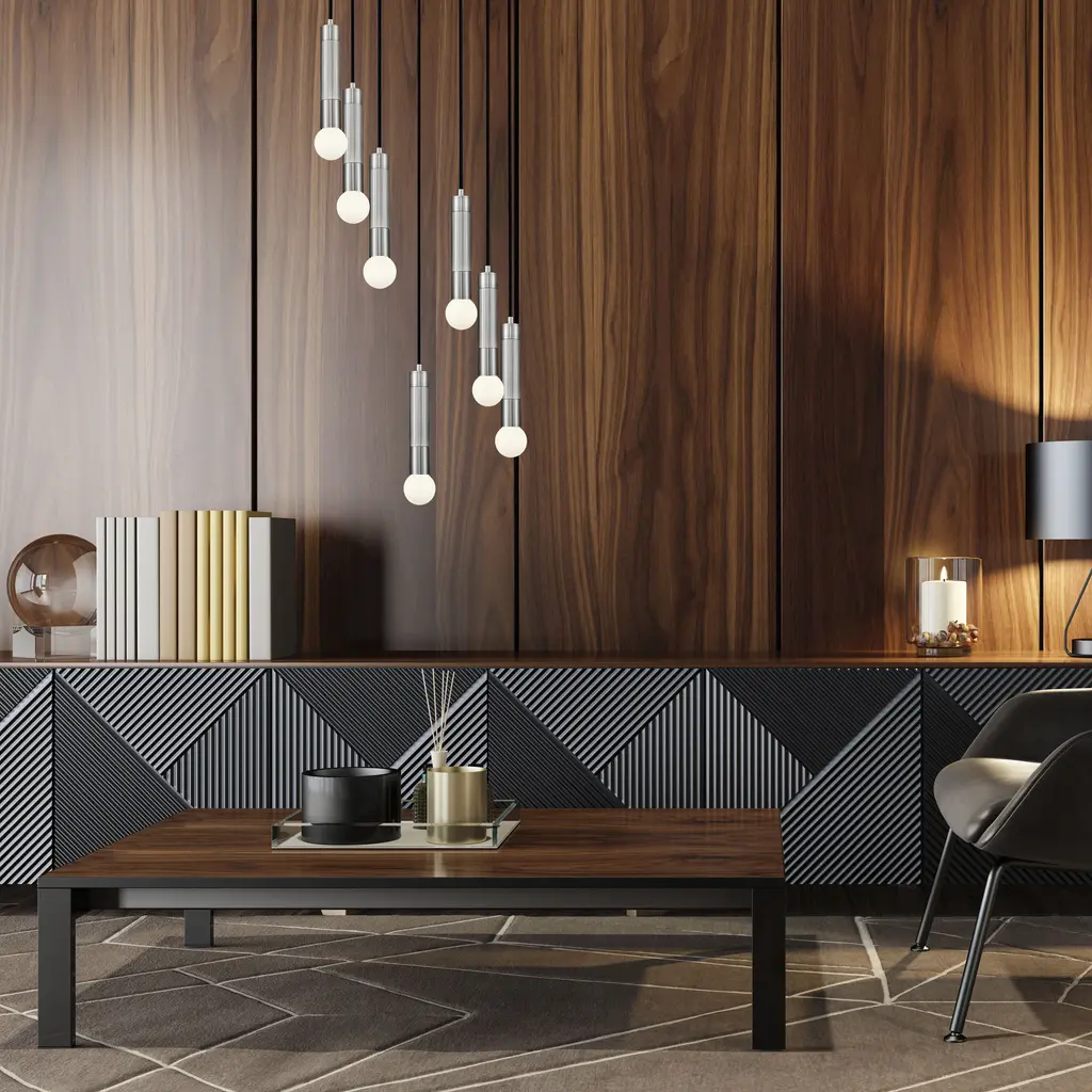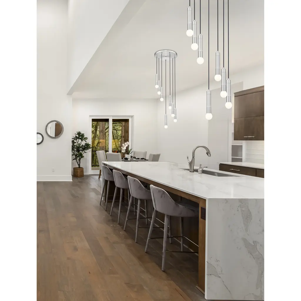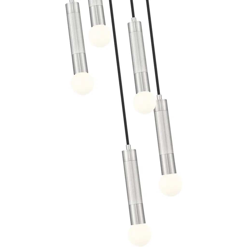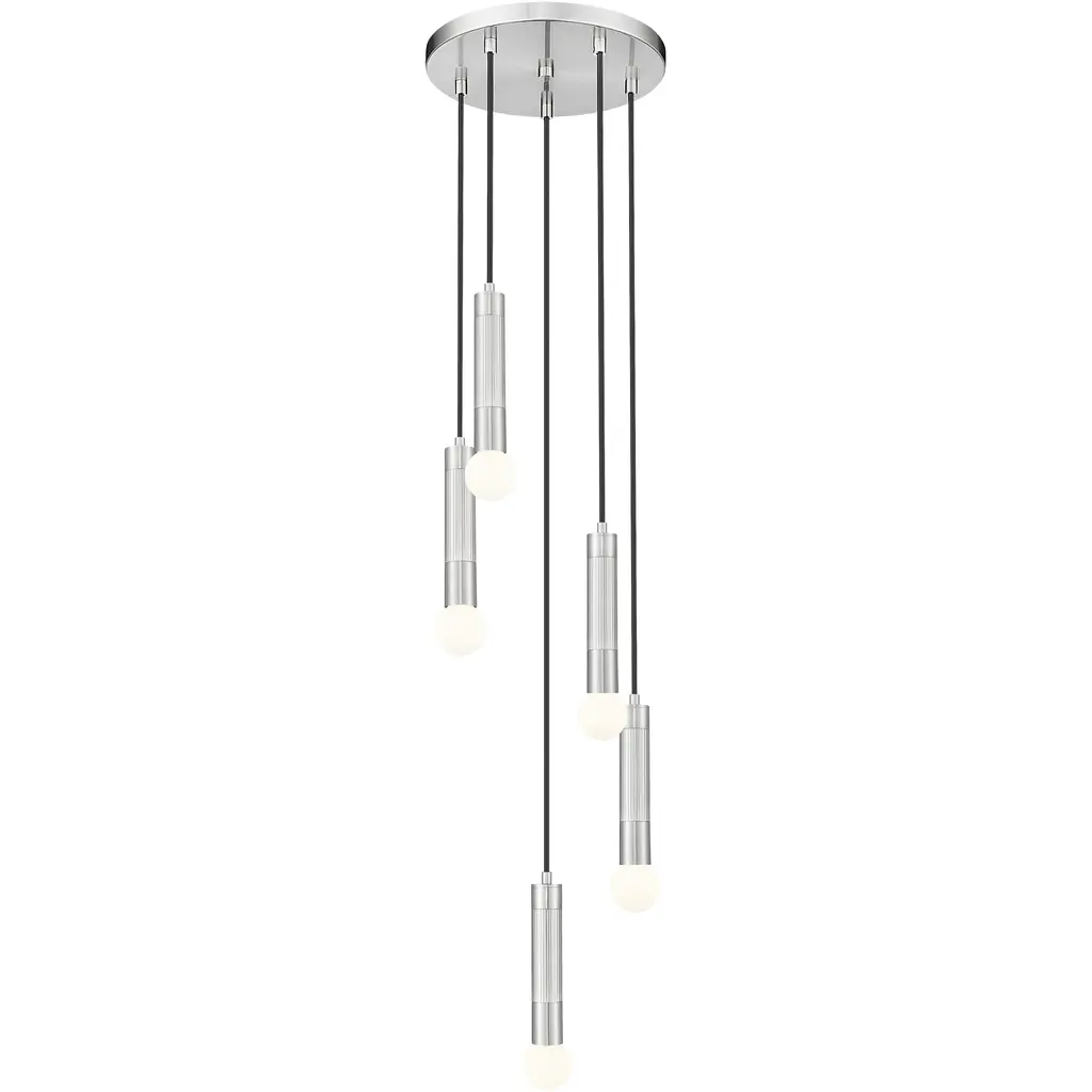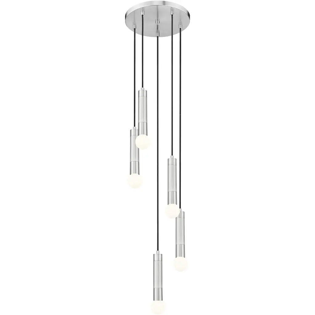 Staggered lengths of braided cord host elongated tubes and petite lights to bring eye-catching flair to this modern five-light round chandelier. Its brushed nickel finish gleams in the light, offering versatility in virtually any setting in your home.