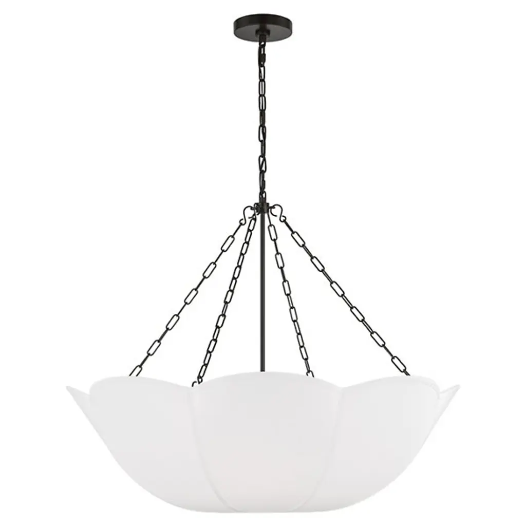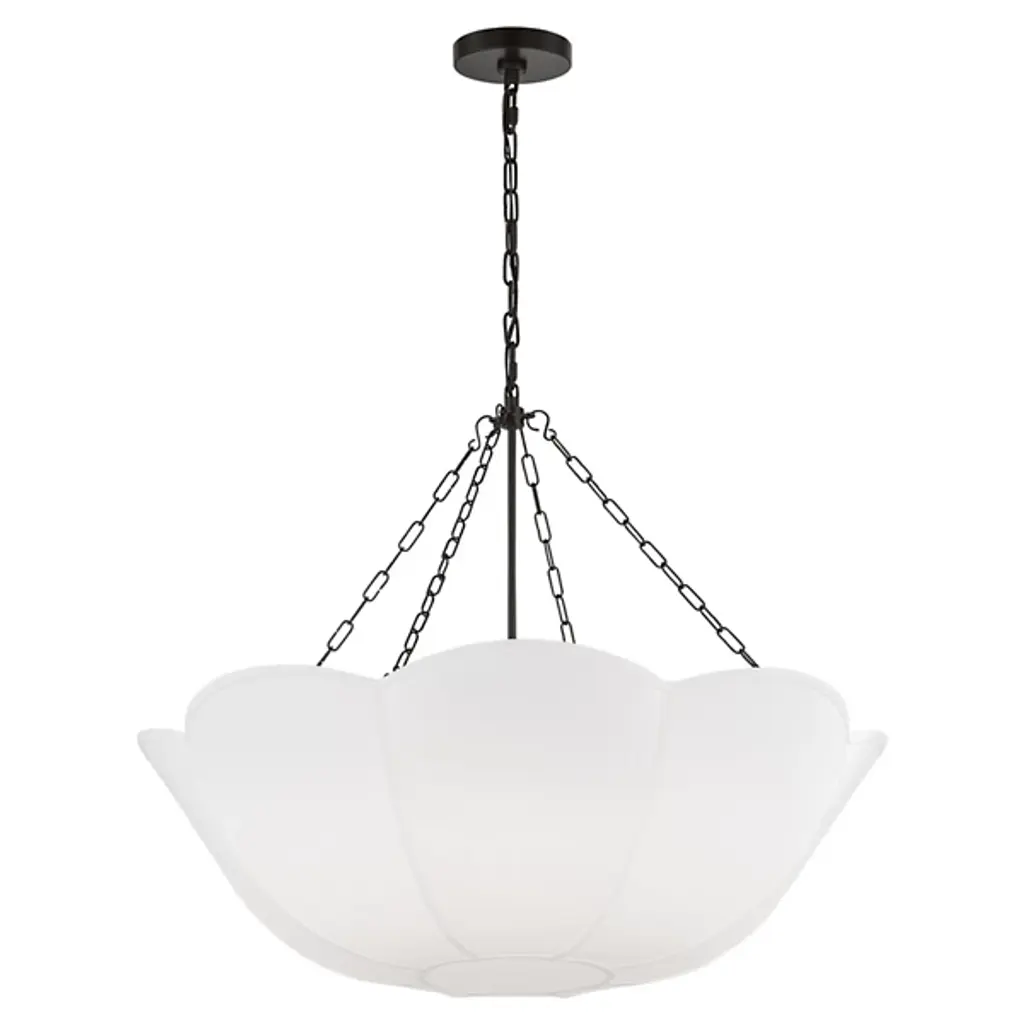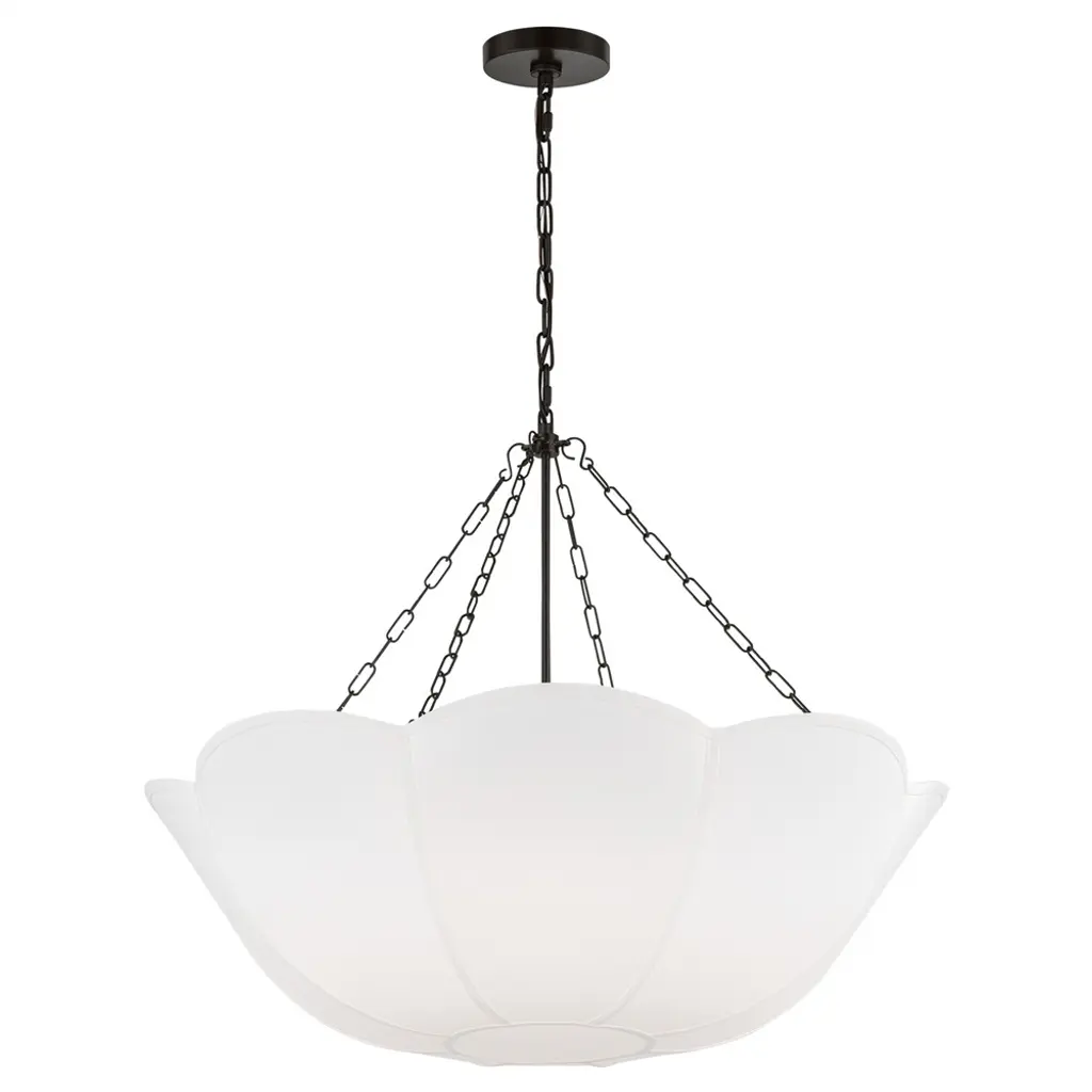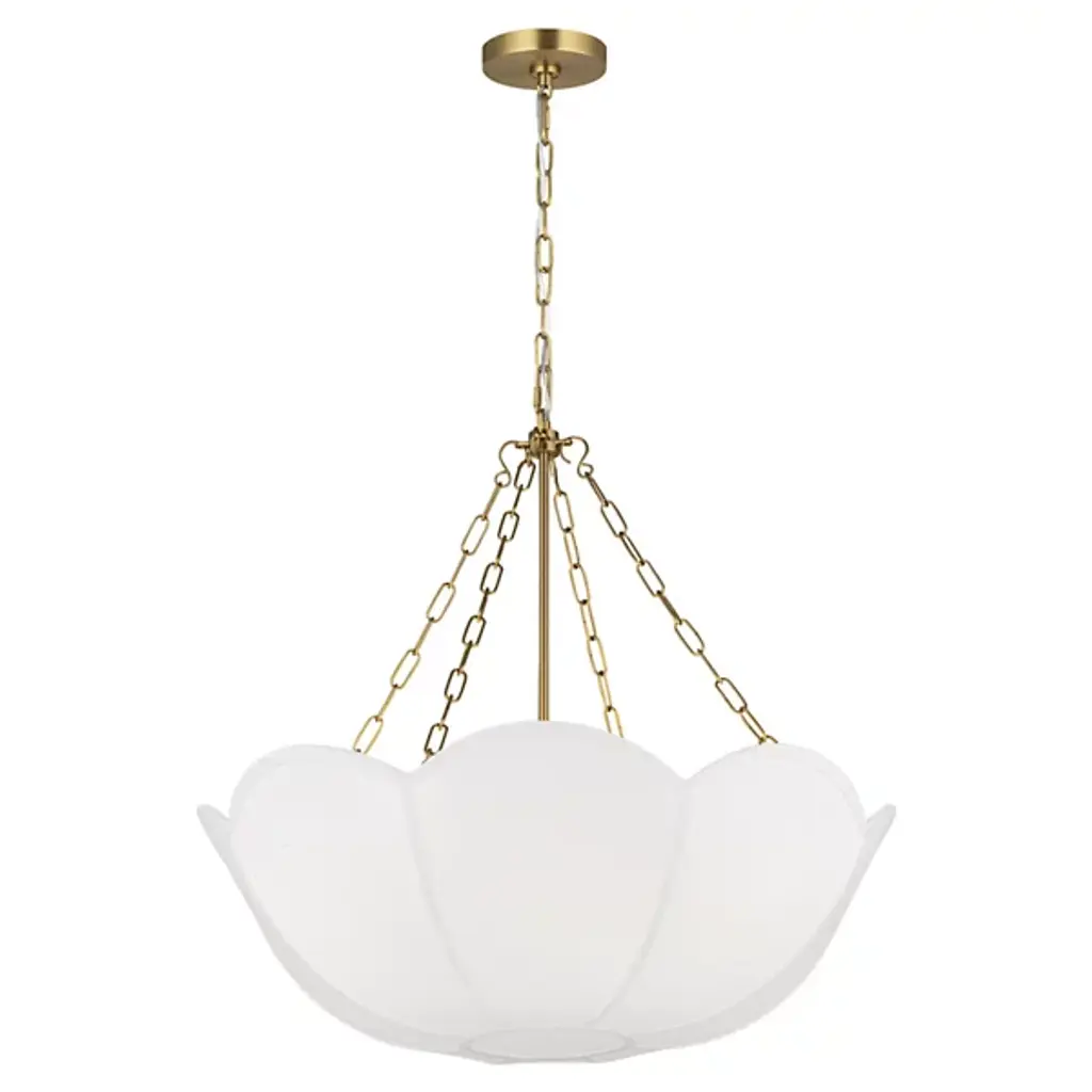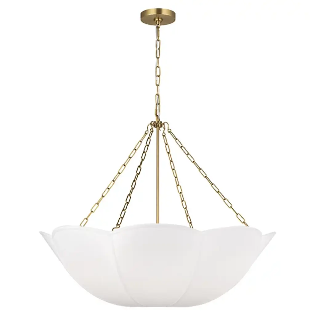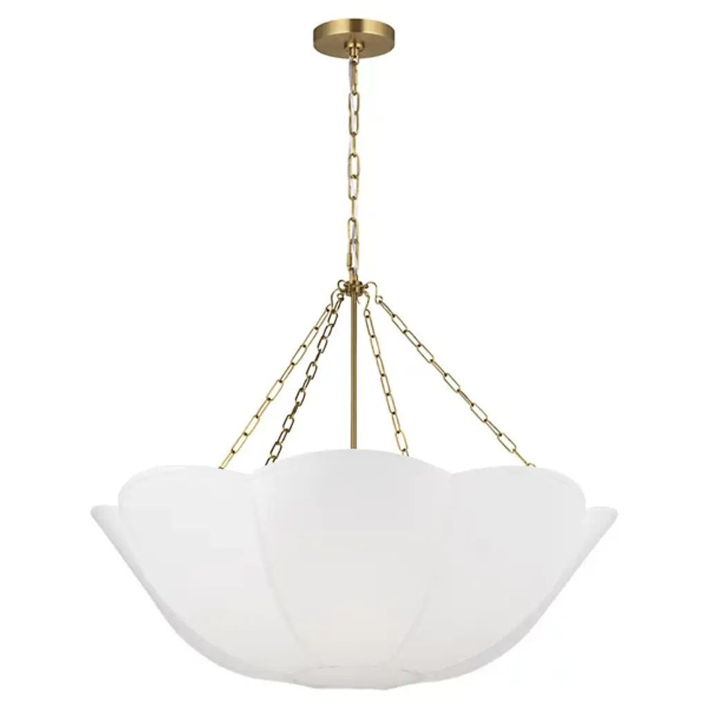 The Stassi Chandelier from Visual Comfort Studio features a distinctive scalloped basket profile that draws immediate attention. Taking cues from Art Nouveau floral forms, this fixture updates historical inspiration with fresh proportions and clean lines. Its linen shade softens light output for comfortable illumination, while decorative chains add textural contrast. Designed by Alexa Hampton, this chandelier’s rounded form distributes light evenly throughout the space while the fabric shade prevents harsh glare, resulting in an inviting atmosphere suitable for both everyday use and special occasions.