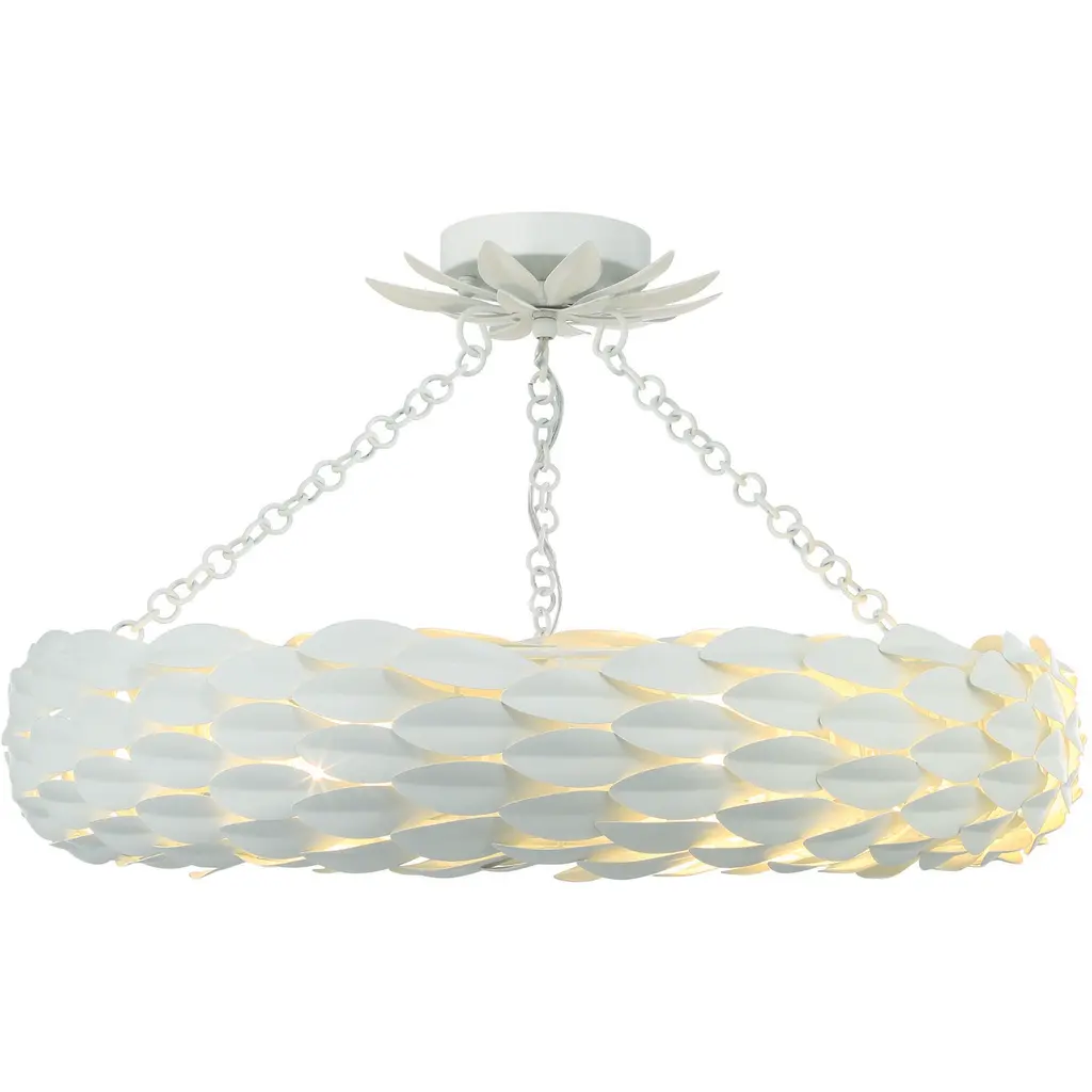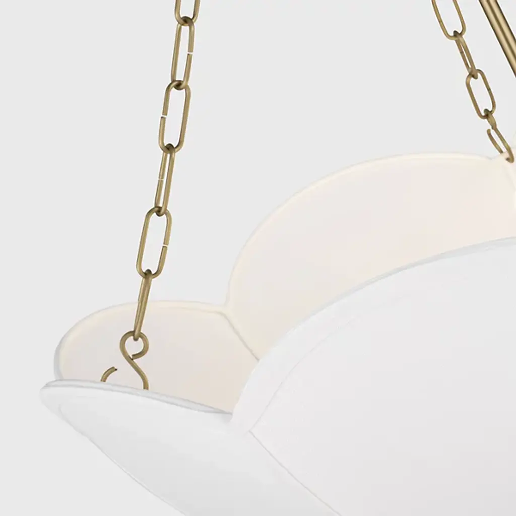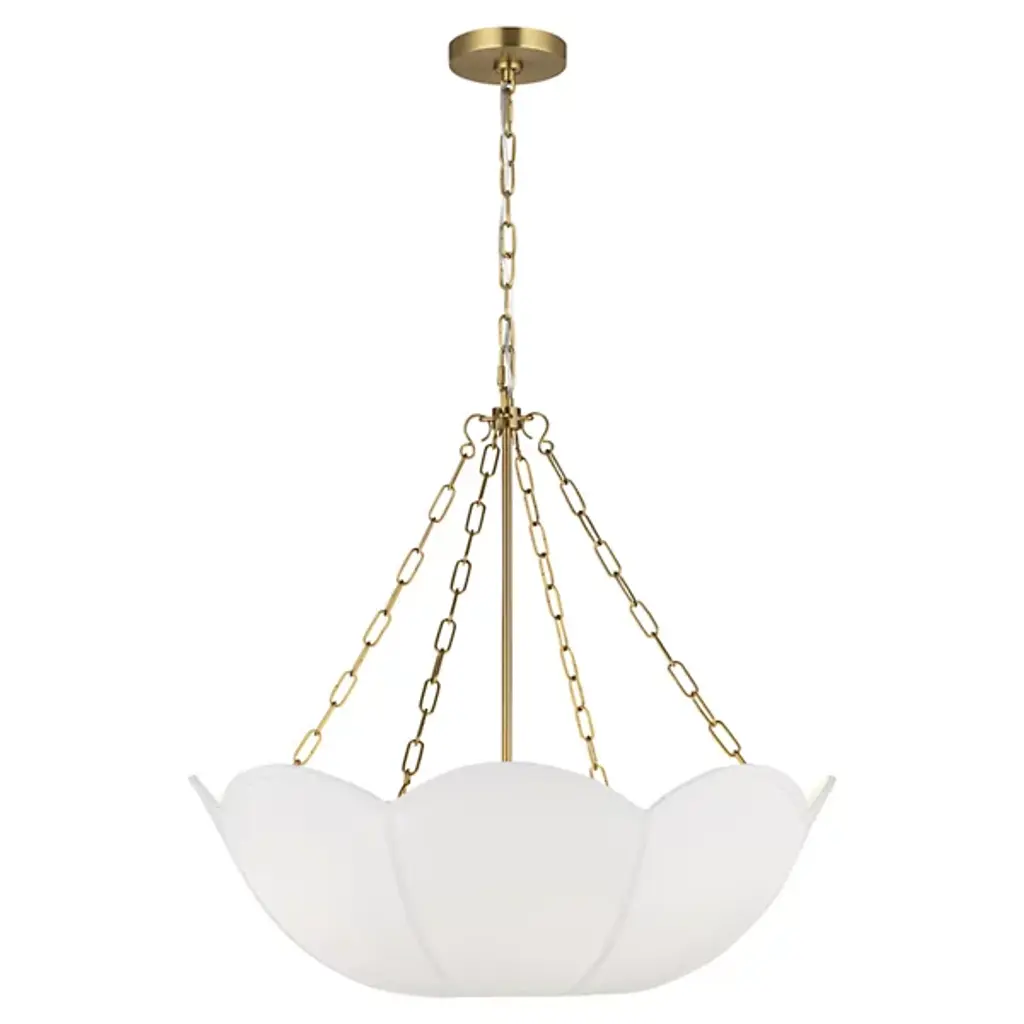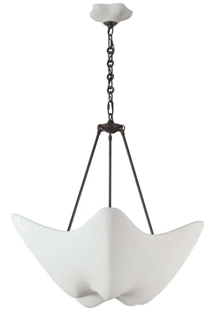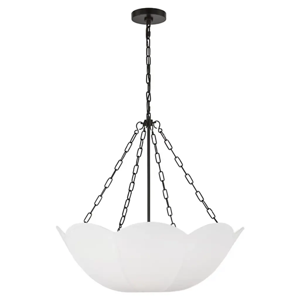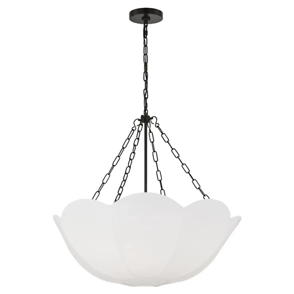 The Stassi Chandelier from Visual Comfort Studio features a distinctive scalloped basket profile that draws immediate attention. Taking cues from Art Nouveau floral forms, this fixture updates historical inspiration with fresh proportions and clean lines. Its linen shade softens light output for comfortable illumination, while decorative chains add textural contrast. Designed by Alexa Hampton, this chandelier’s rounded form distributes light evenly throughout the space while the fabric shade prevents harsh glare, resulting in an inviting atmosphere suitable for both everyday use and special occasions.