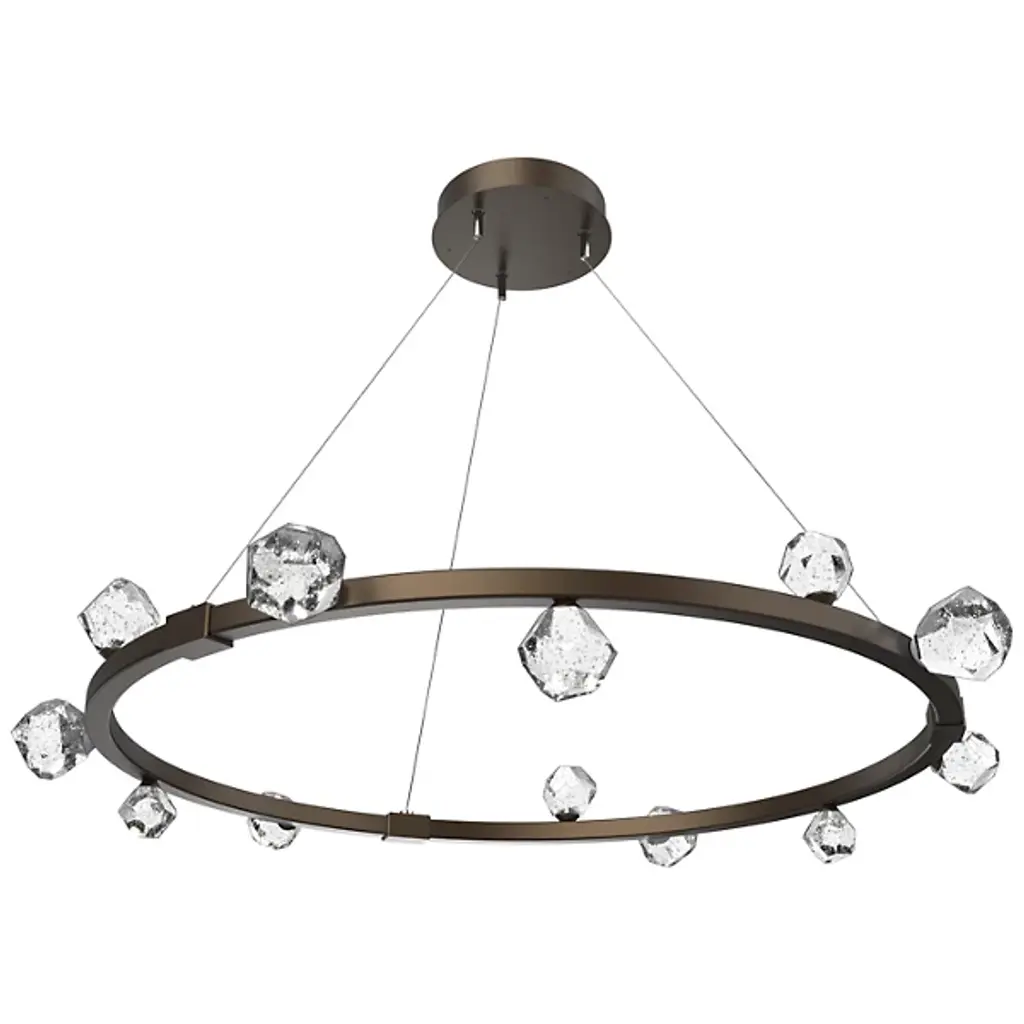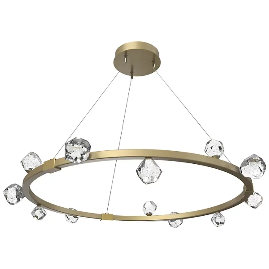 The Stella LED Ring Chandelier by Hammerton Studio is an elegant addition to spaces. Inspired by the celestial sky, the minimalistic nature of this design showcases a series of beautiful, geometric, cast glass diffusers that sparkle like stars around a circular frame. Created by pouring molten glass into steel jigs that are designed and built in-house, this handcrafted piece dazzles as it lends a sparkling layer of energy-efficient light to surroundings.