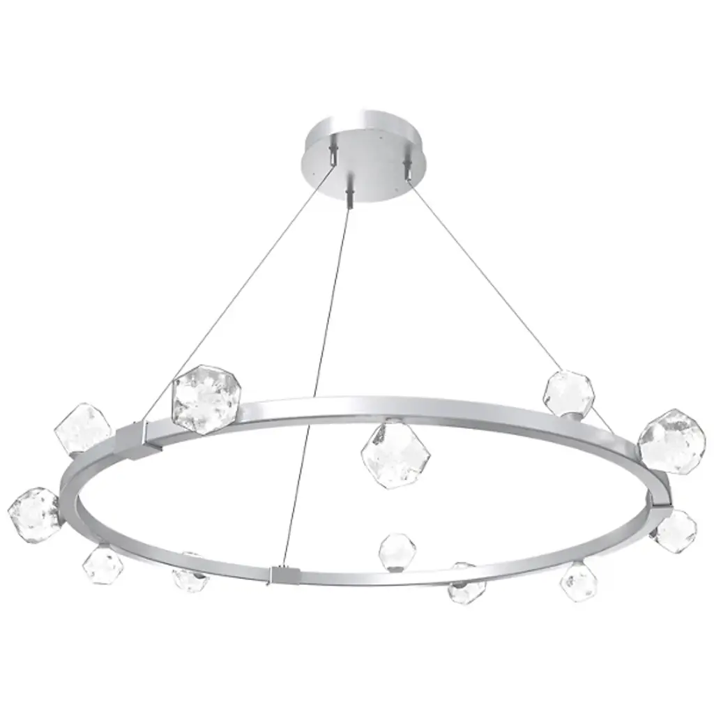 The Stella LED Ring Chandelier by Hammerton Studio is an elegant addition to spaces. Inspired by the celestial sky, the minimalistic nature of this design showcases a series of beautiful, geometric, cast glass diffusers that sparkle like stars around a circular frame. Created by pouring molten glass into steel jigs that are designed and built in-house, this handcrafted piece dazzles as it lends a sparkling layer of energy-efficient light to surroundings.