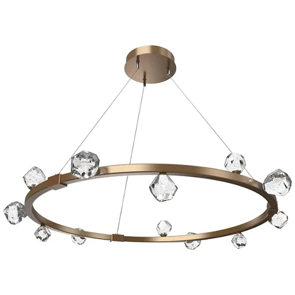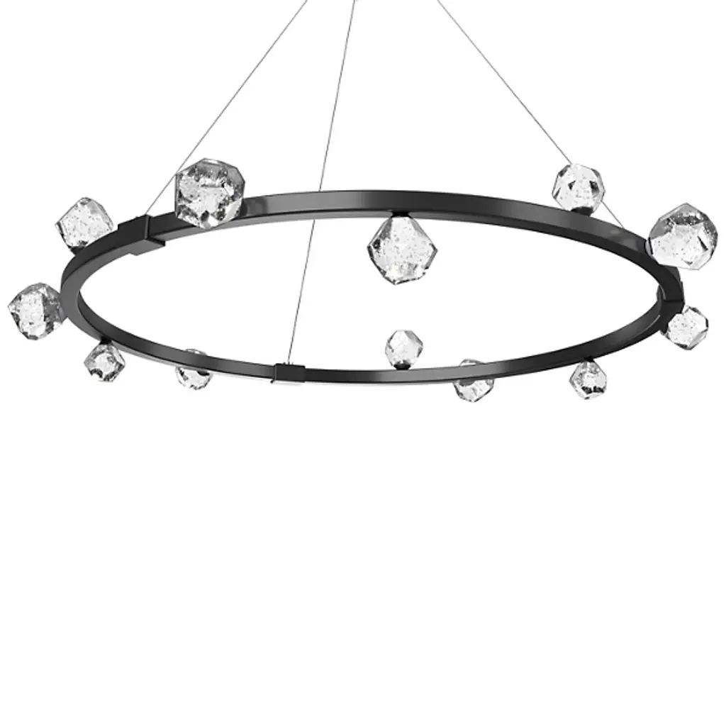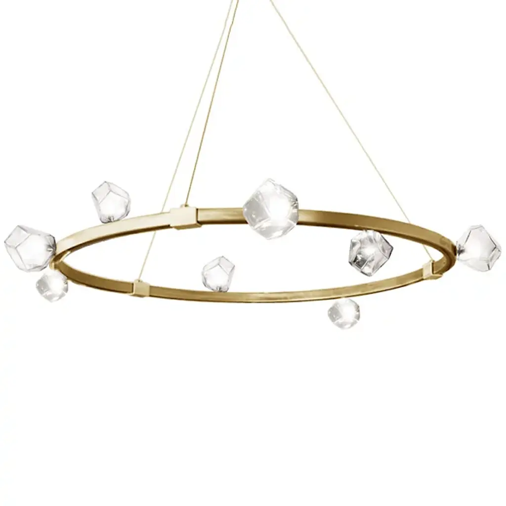The Stella LED Ring Chandelier by Hammerton Studio is an elegant addition to spaces. Inspired by the celestial sky, the minimalistic nature of this design showcases a series of beautiful, geometric, cast glass diffusers that sparkle like stars around a circular frame. Created by pouring molten glass into steel jigs that are designed and built in-house, this handcrafted piece dazzles as it lends a sparkling layer of energy-efficient light to surroundings.