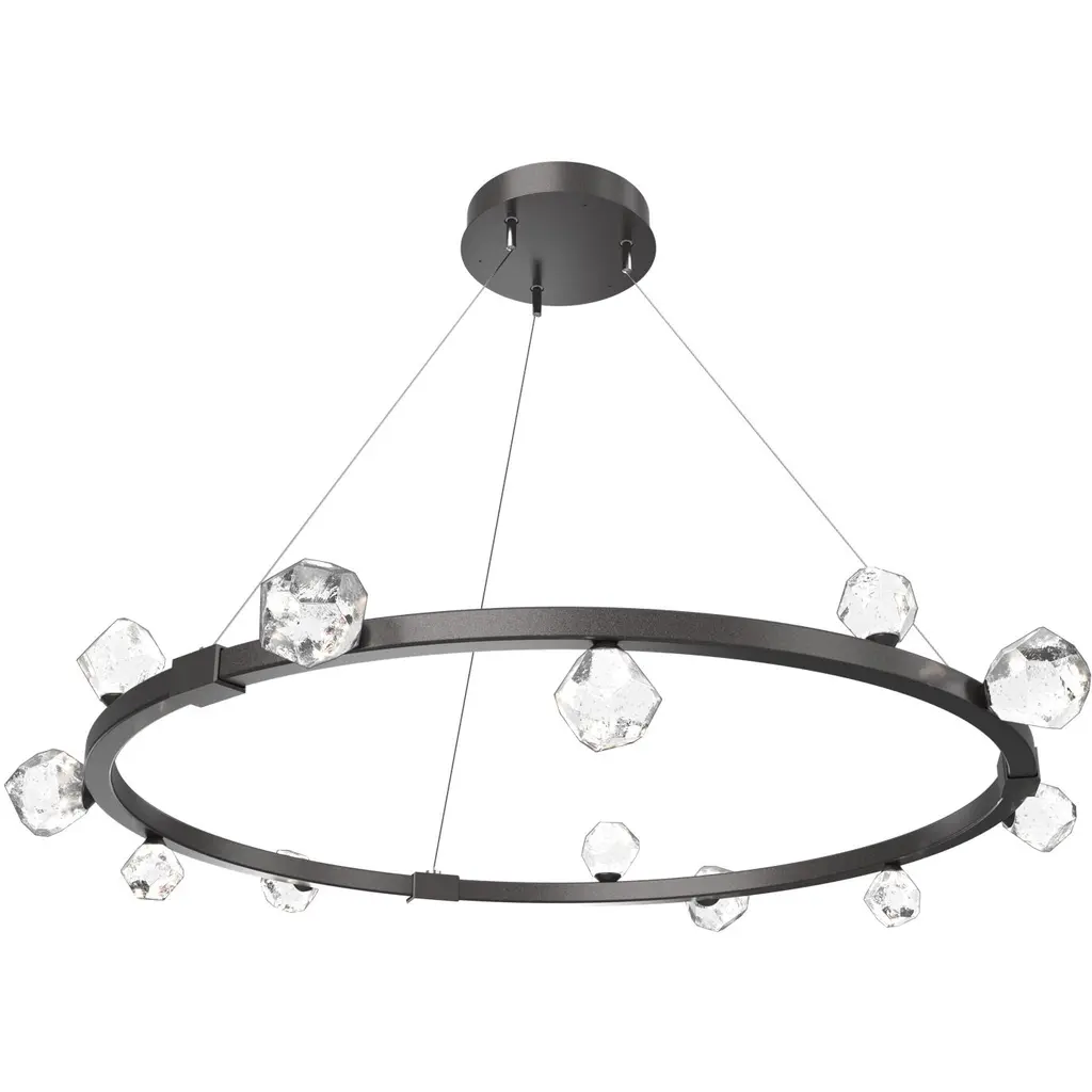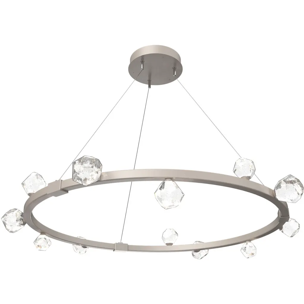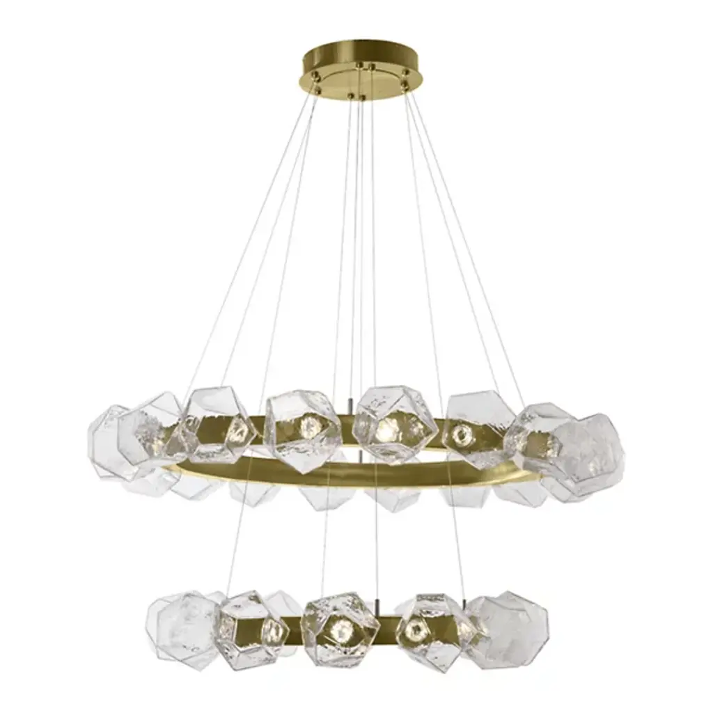 The Stella LED Ring Chandelier by Hammerton Studio is an elegant addition to spaces. Inspired by the celestial sky, the minimalistic nature of this design showcases a series of beautiful, geometric, cast glass diffusers that sparkle like stars around a circular frame. Created by pouring molten glass into steel jigs that are designed and built in-house, this handcrafted piece dazzles as it lends a sparkling layer of energy-efficient light to surroundings.