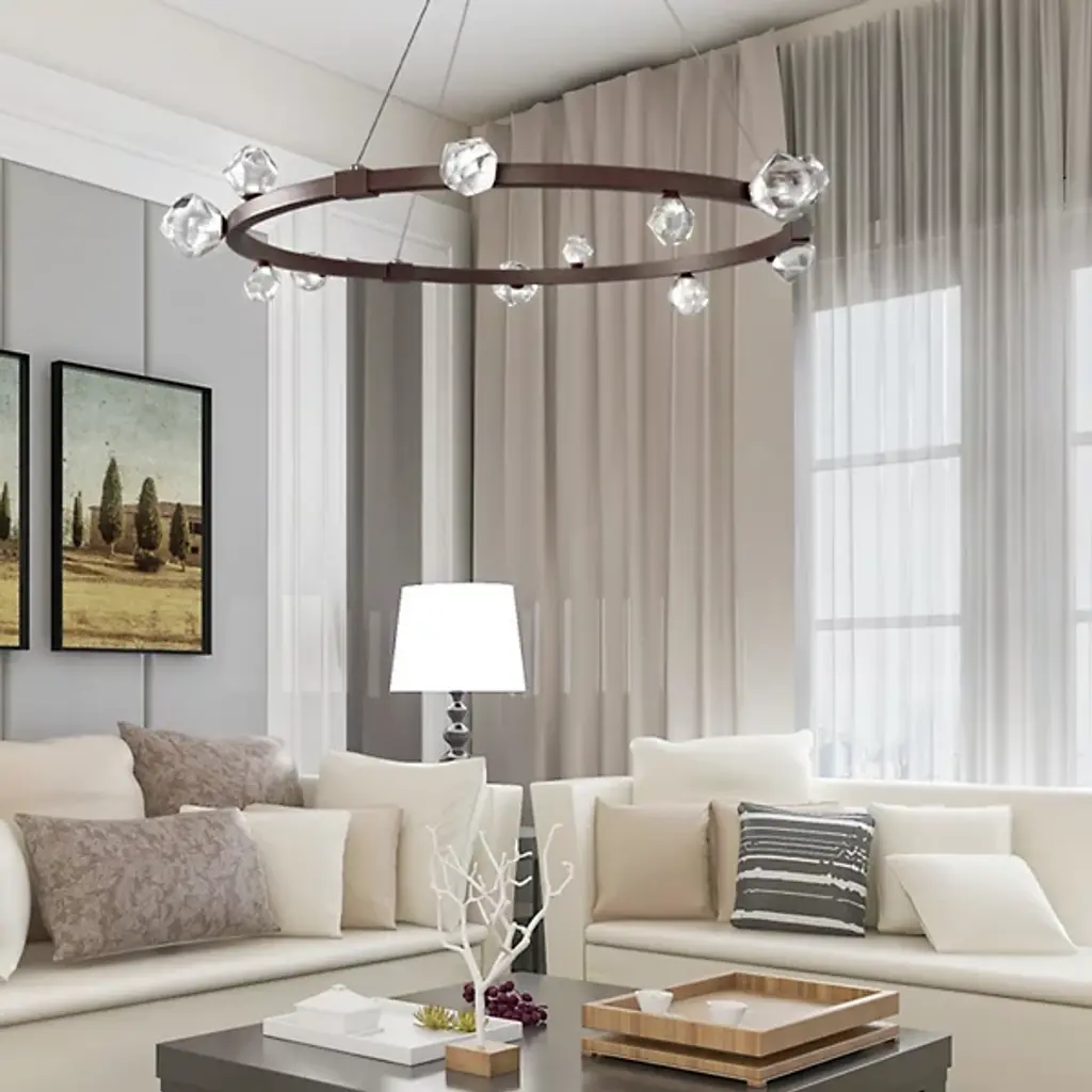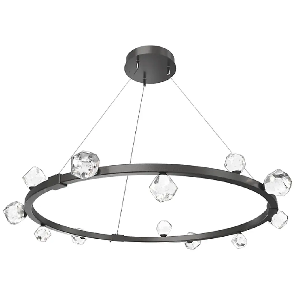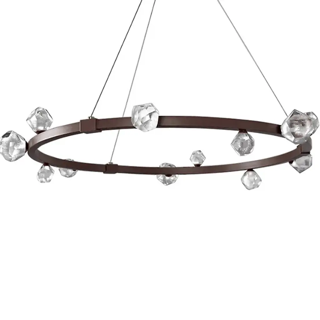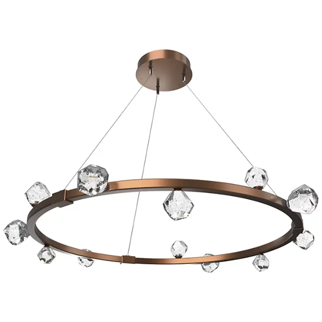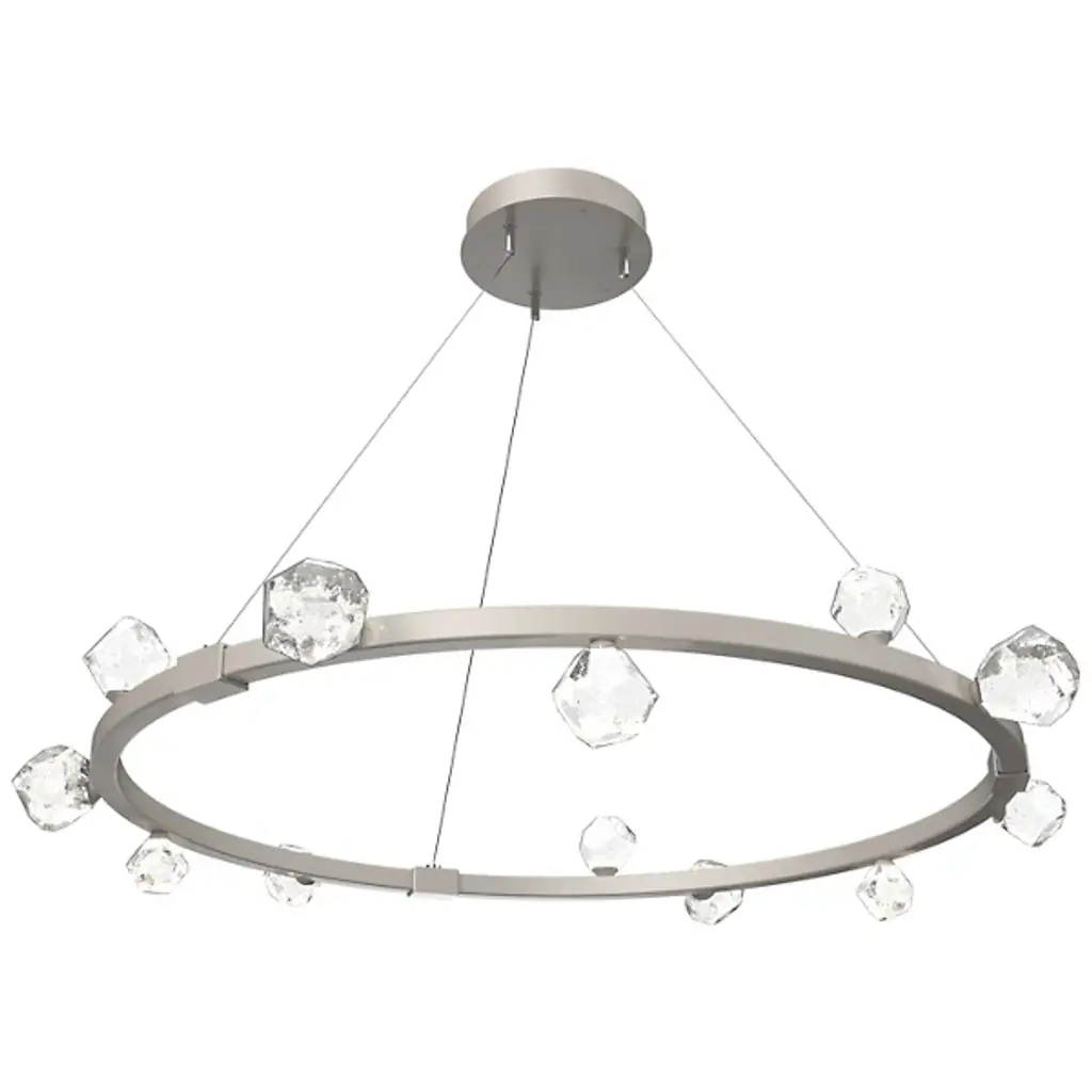 The Stella LED Ring Chandelier by Hammerton Studio is an elegant addition to spaces. Inspired by the celestial sky, the minimalistic nature of this design showcases a series of beautiful, geometric, cast glass diffusers that sparkle like stars around a circular frame. Created by pouring molten glass into steel jigs that are designed and built in-house, this handcrafted piece dazzles as it lends a sparkling layer of energy-efficient light to surroundings.