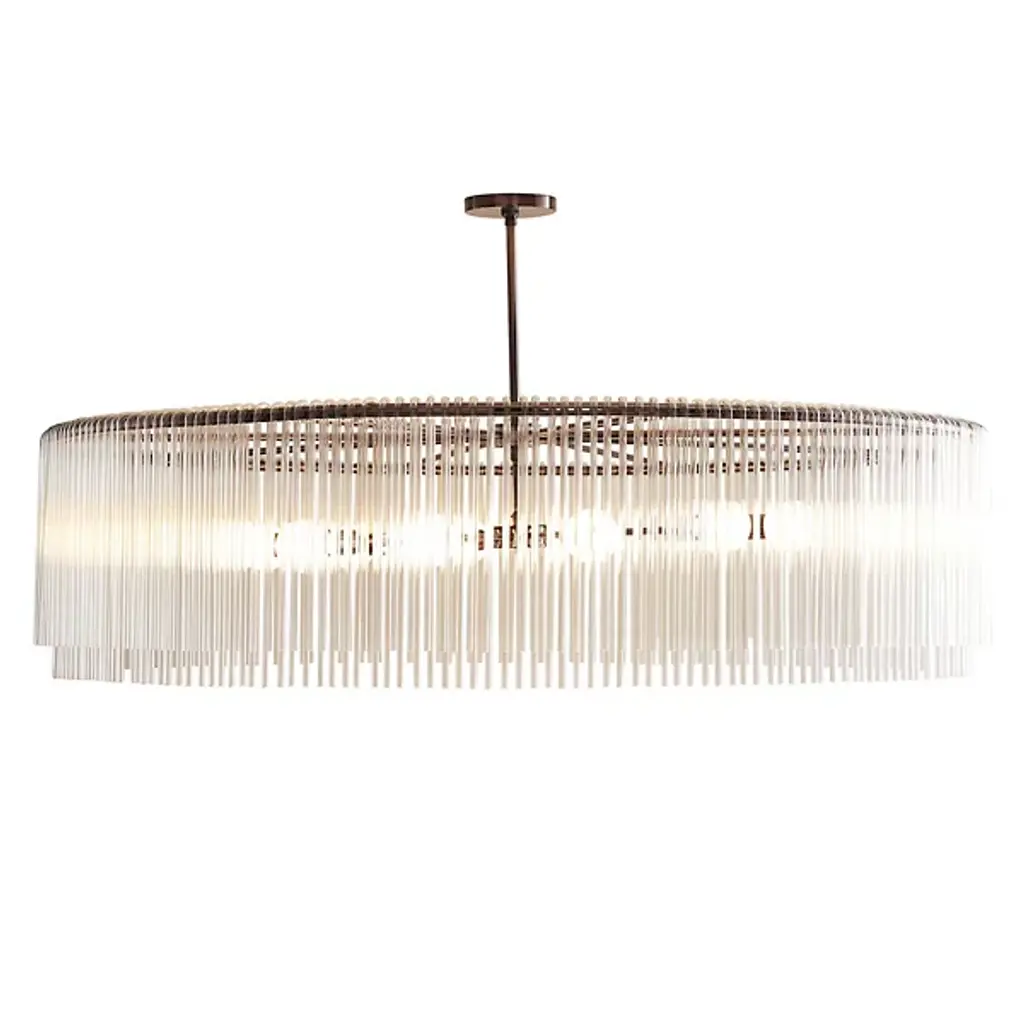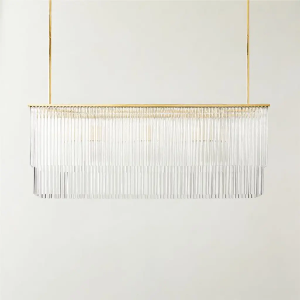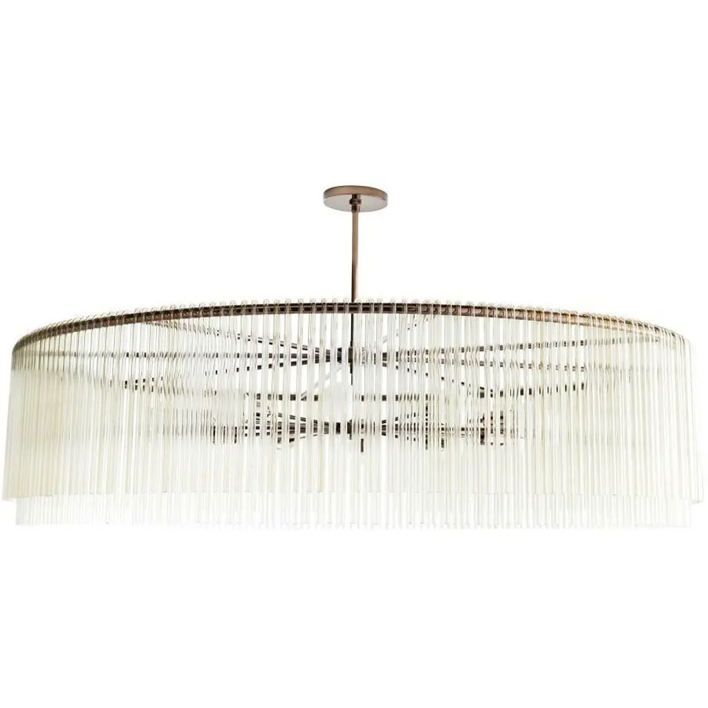 Reminiscent of the aurora borealis, light from inside dances through glass rods to create a captivating show that shifts from every viewpoint. A refined brass frame grounds the look while thin glass rods slide into fringe-like position. Designed by Brett Beldock, this chandelier light is finished and polished by hand; as brass is a living finish, it will develop a beautiful patina over time. CB2 exclusive.