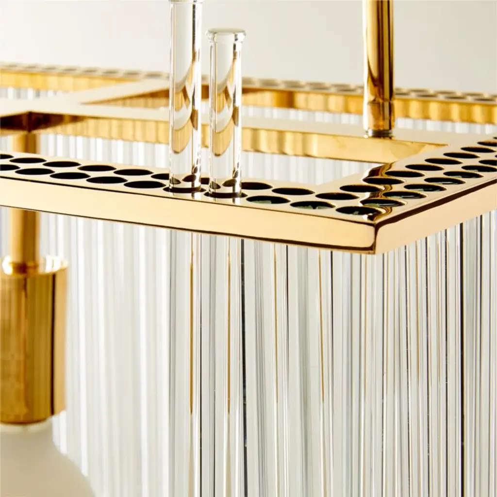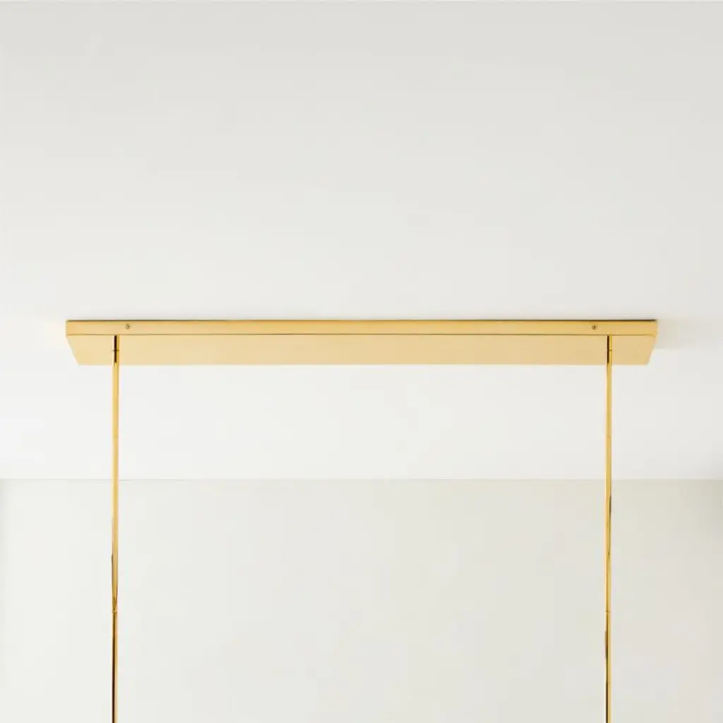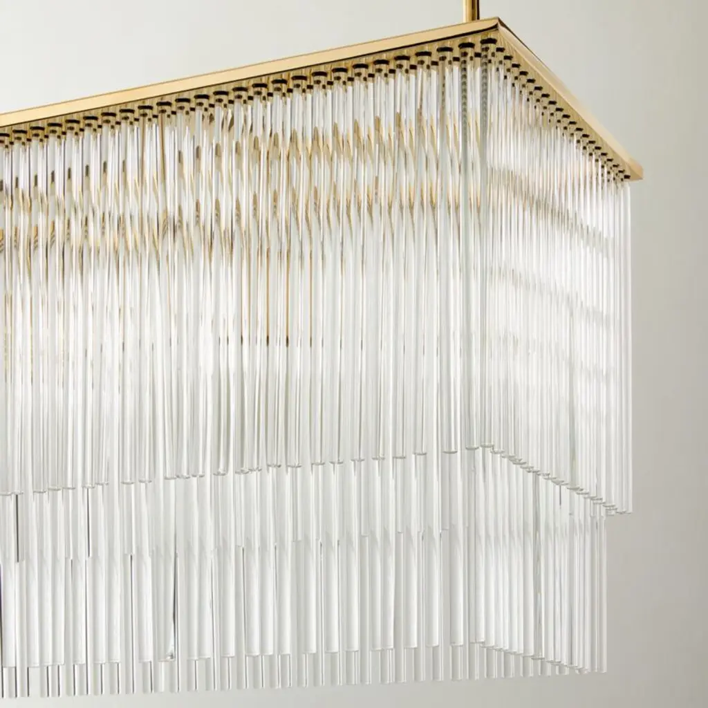 Reminiscent of the aurora borealis, light from inside dances through glass rods to create a captivating show that shifts from every viewpoint. A refined brass frame grounds the look while thin glass rods slide into fringe-like position. Designed by Brett Beldock, this chandelier light is finished and polished by hand; as brass is a living finish, it will develop a beautiful patina over time. CB2 exclusive.