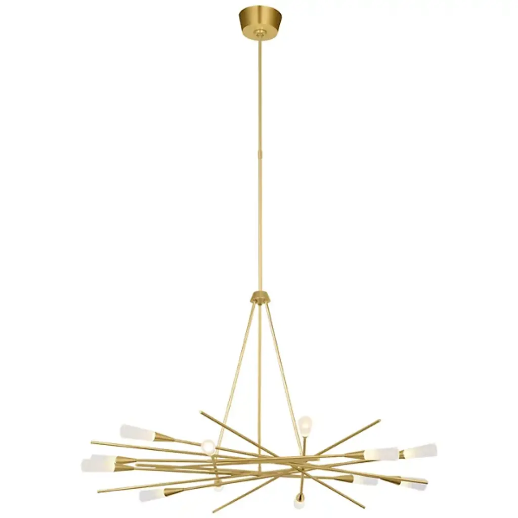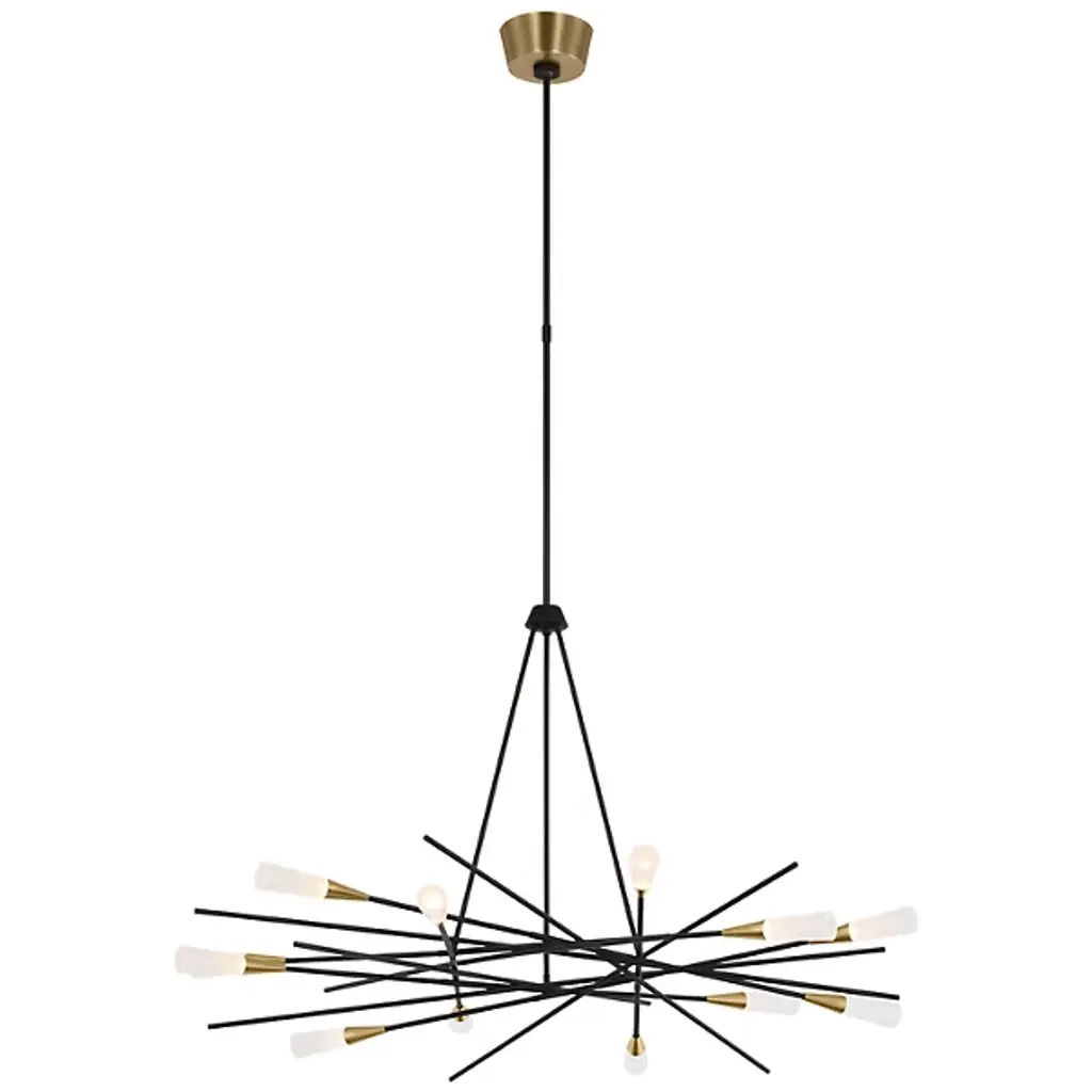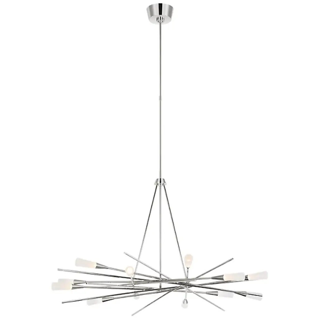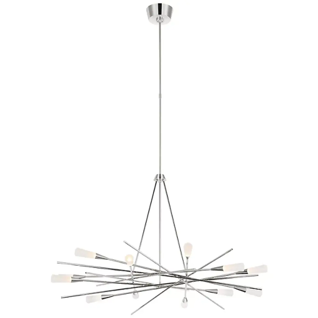 The Stellar Radial LED Chandelier from Visual Comfort Signature reinvents traditional chandelier composition through geometric exploration. Multiple steel rods radiate from a central point, each ending in an acrylic-diffused LED light source. Chapman & Myers' innovative approach turns standard fixture elements into dynamic arrays. The intersecting lines create different patterns when viewed from various angles while maintaining practical illumination. Each rod is precisely positioned to contribute to both the overall form and lighting distribution.