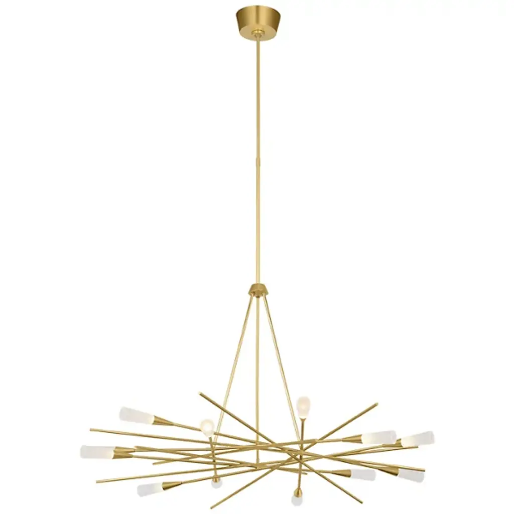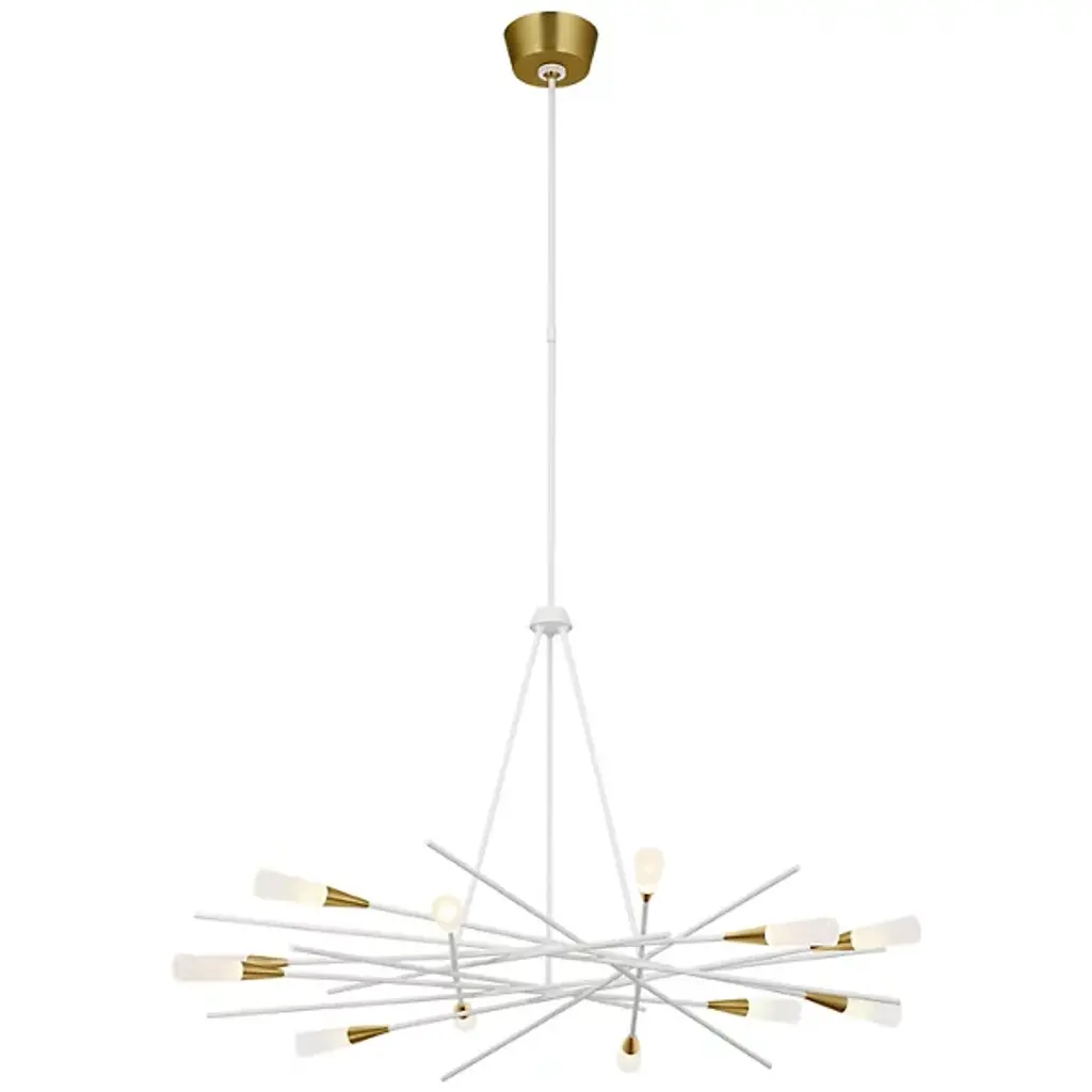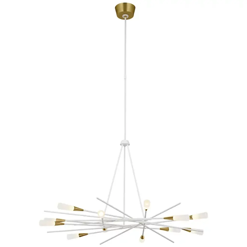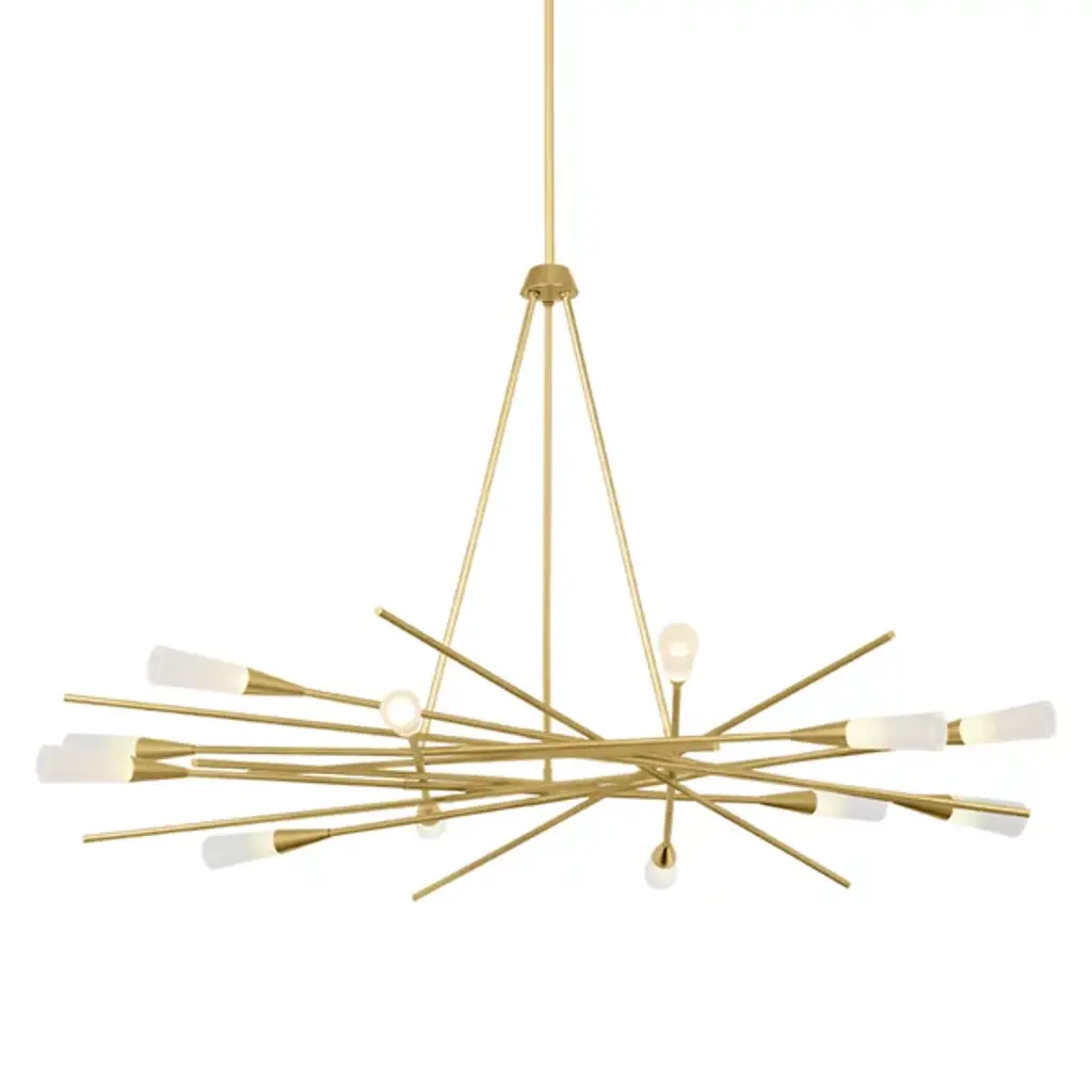 The Stellar Radial LED Chandelier from Visual Comfort Signature reinvents traditional chandelier composition through geometric exploration. Multiple steel rods radiate from a central point, each ending in an acrylic-diffused LED light source. Chapman & Myers' innovative approach turns standard fixture elements into dynamic arrays. The intersecting lines create different patterns when viewed from various angles while maintaining practical illumination. Each rod is precisely positioned to contribute to both the overall form and lighting distribution.