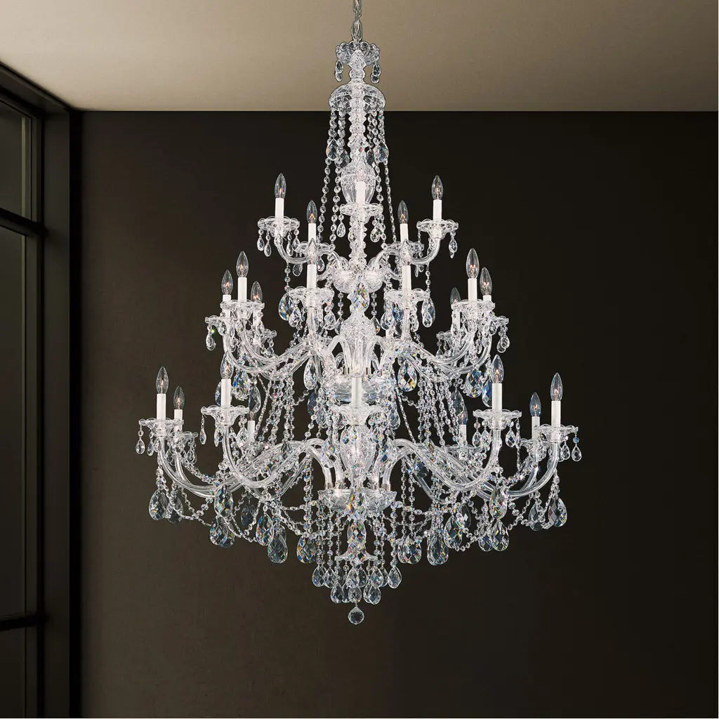 In the eighteenth century advances in glassmaking techniques and the demands of rich patrons made all-glass chandeliers the ultimate statement of class. Sterling, an all-crystal chandelier with hand-formed crystal arms and finely cut pendants, column and dishes, is the ultimate illustration of historical chandeliers' dazzling by light.'