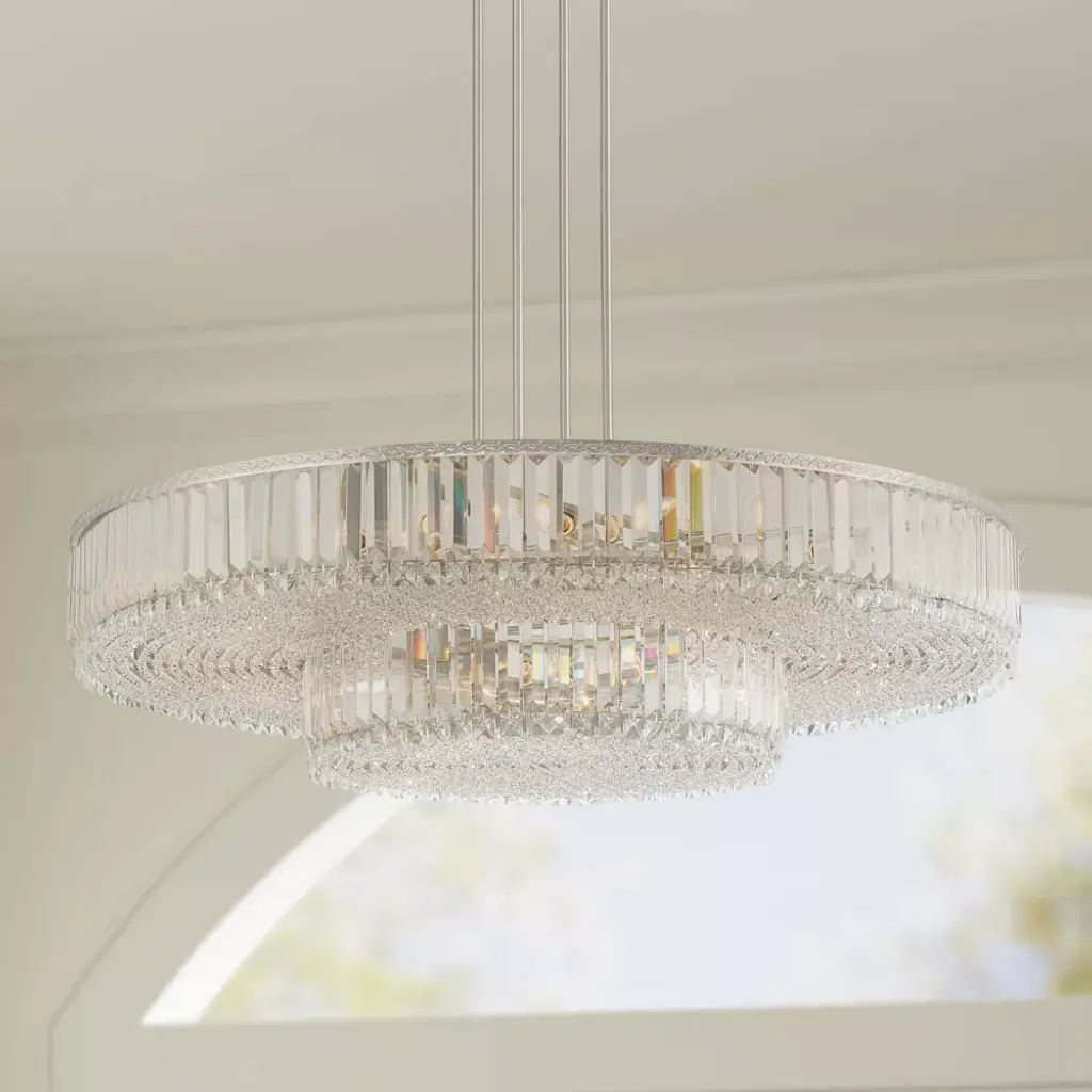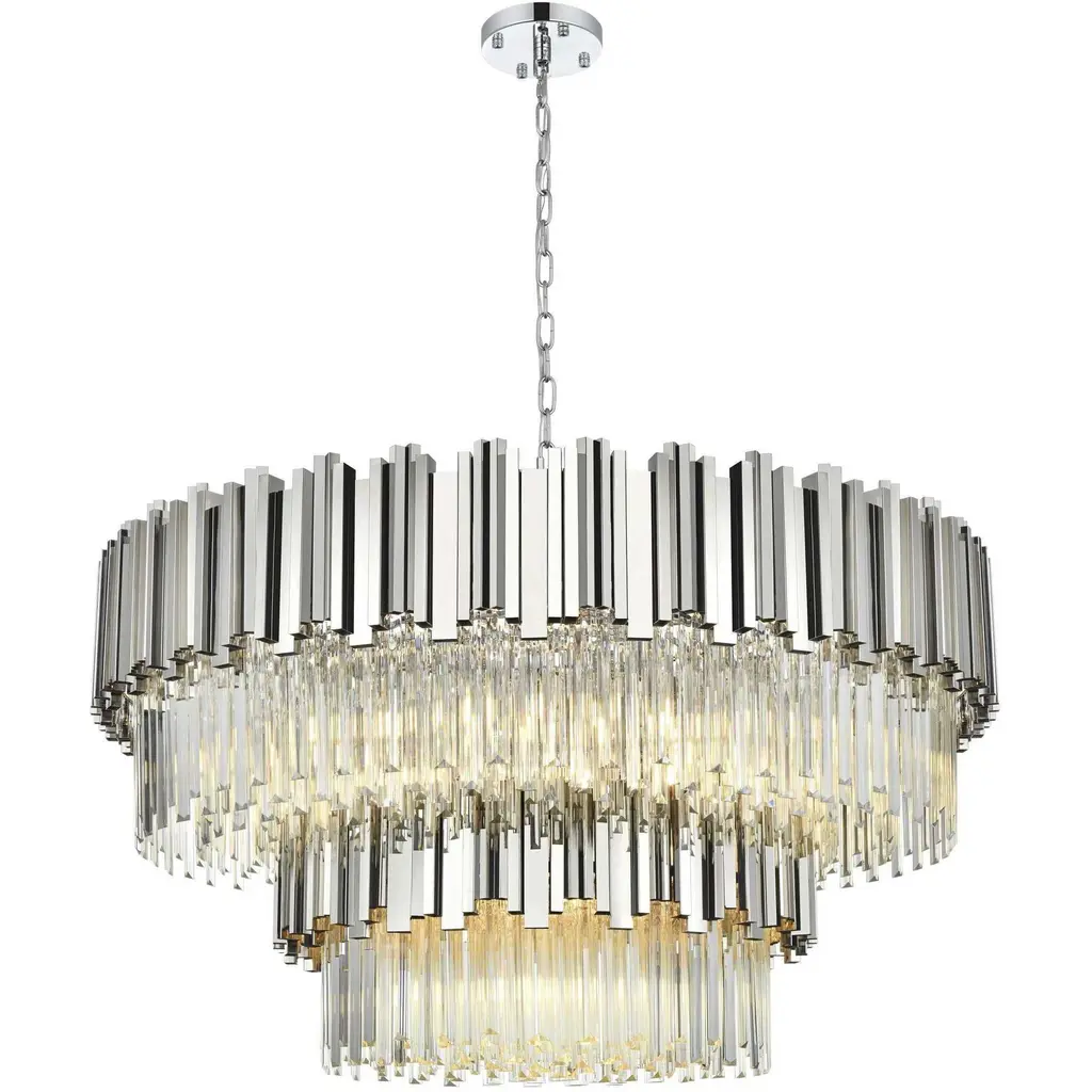 Add a breath of fresh glamour to your home with the traditional style Ella pendant light, from the Stiffel brand exclusively for Lamps Plus. The brushed nickel finish frame and downrods lend a sleek, refined character, gleaming beautifully in the light. A series of clear glass rods dangle delicately in two grand concentric circles, diffusing and enhancing the illumination from the sixteen candelabra base bulbs (not included) within.