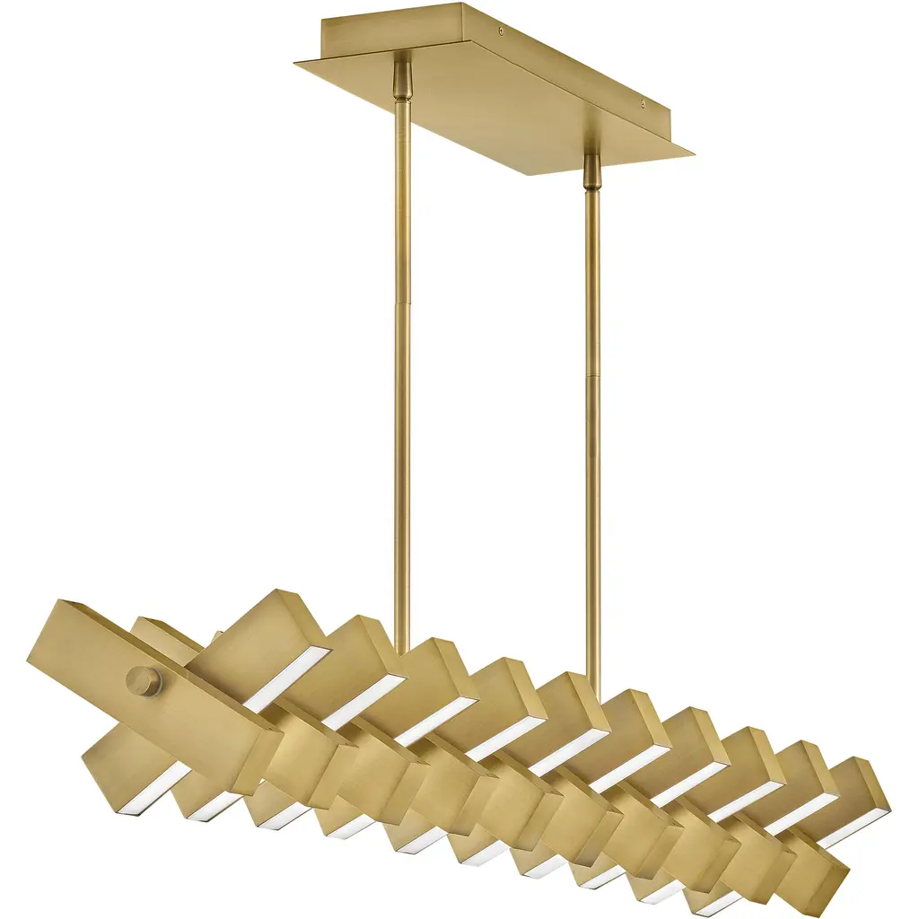 Stitch strikes a pose with an innovative design, offering bountiful illumination from articulating LED panels. This dynamic linear chandelier is a modern sculptural statement available in Black Oxide or Lacquered Brass finishes.