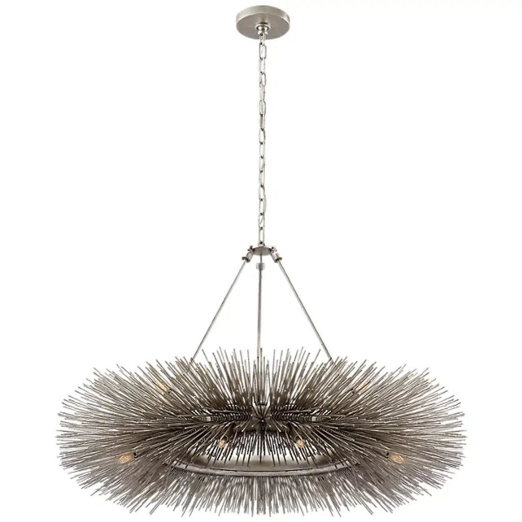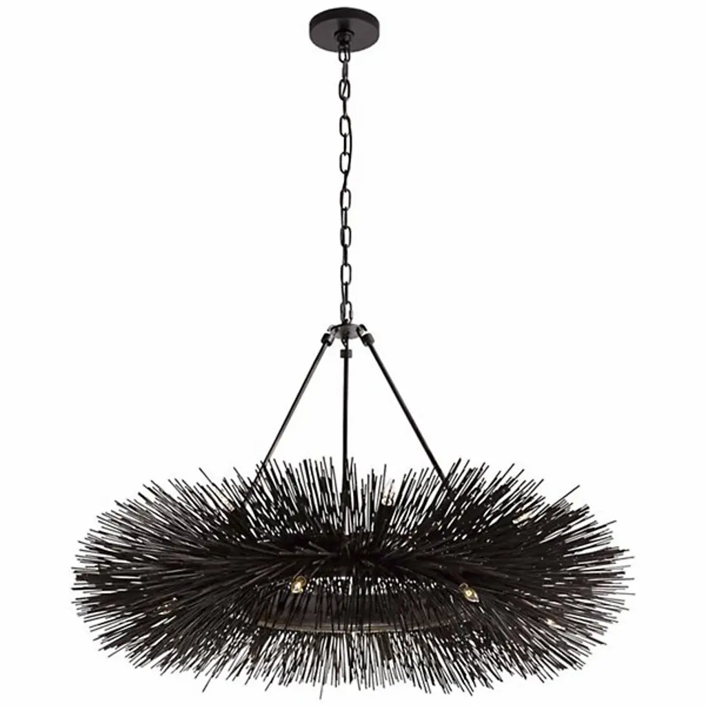 The Strada Ring Chandelier from Visual Comfort Signature, formerly known as Visual Comfort, locks onto the eyes with a silhouette that is mysterious like a spiny sea urchin and attractive like a stylish accessory. It’s an easy choice in the innovative contemporary home aesthetic. It enters the room with grace using a slender rod and chain-link suspension. A metal ring framework acts as the starting point for the chandelier’s bevy of fine rods. These rods create an exploding display that accentuates the radiant quality of the light. Pops of warm light come from classic candelabra bulbs that camouflage inside the starburst silhouette. The bulbs come together to produce a relaxed, atmospheric glow.